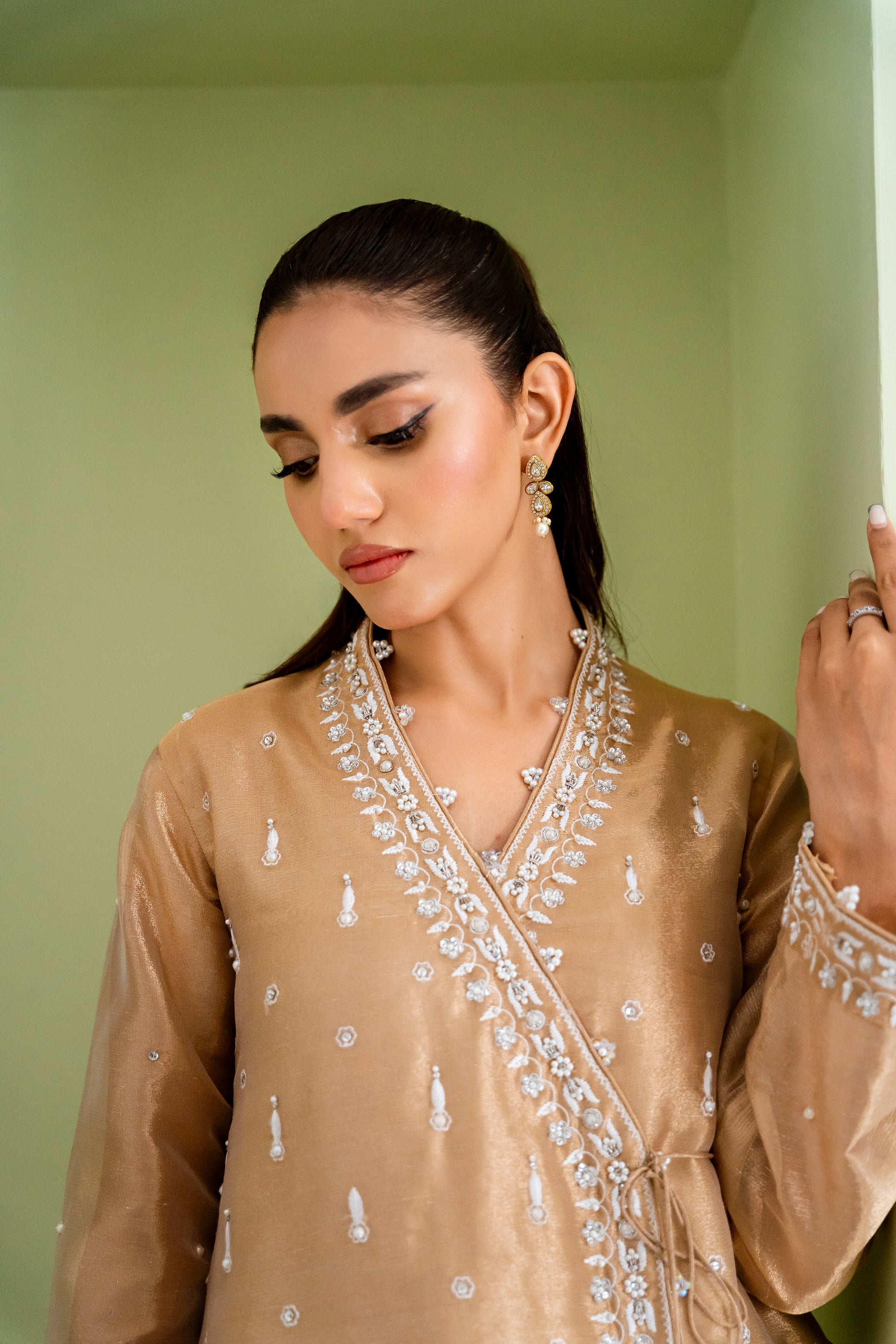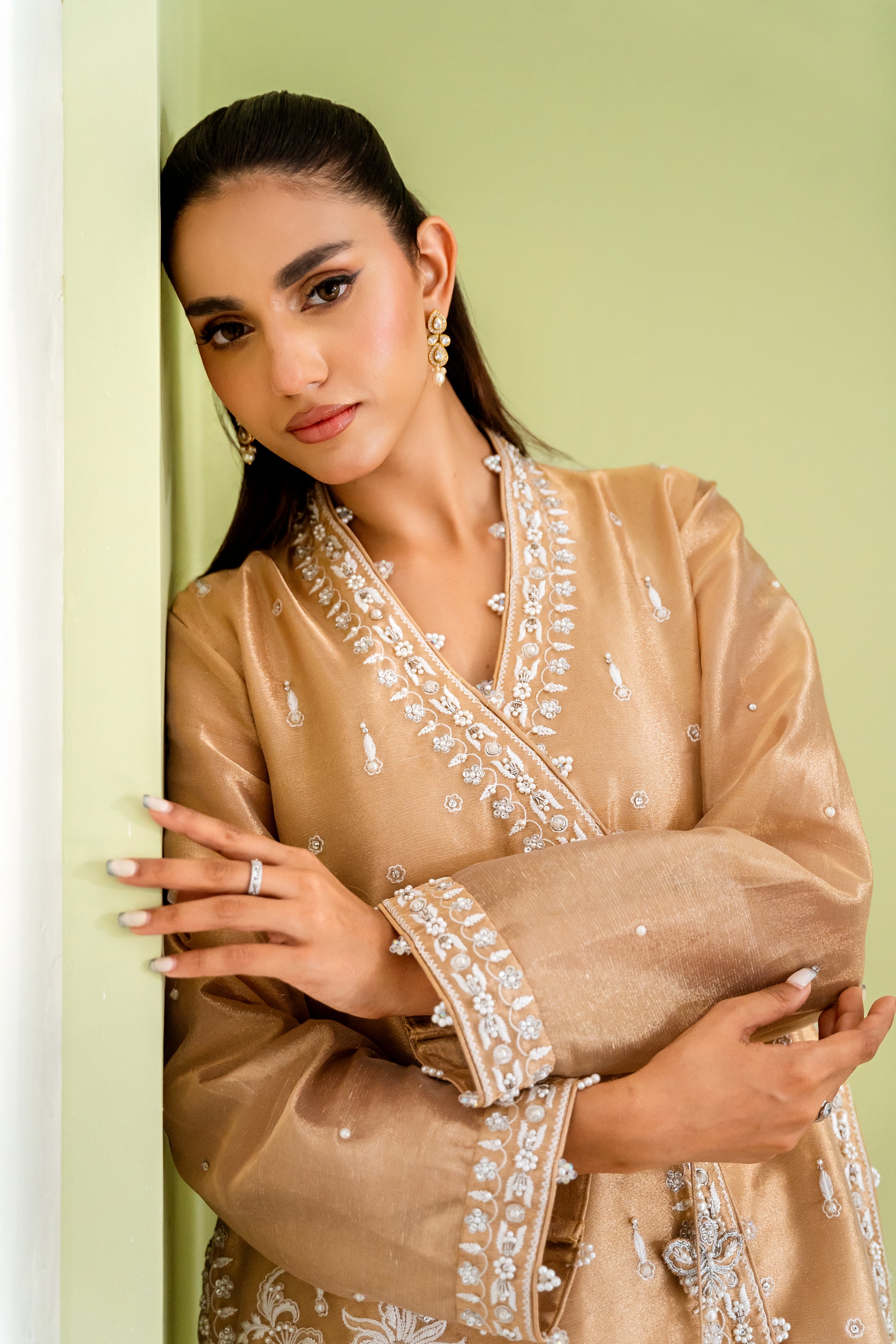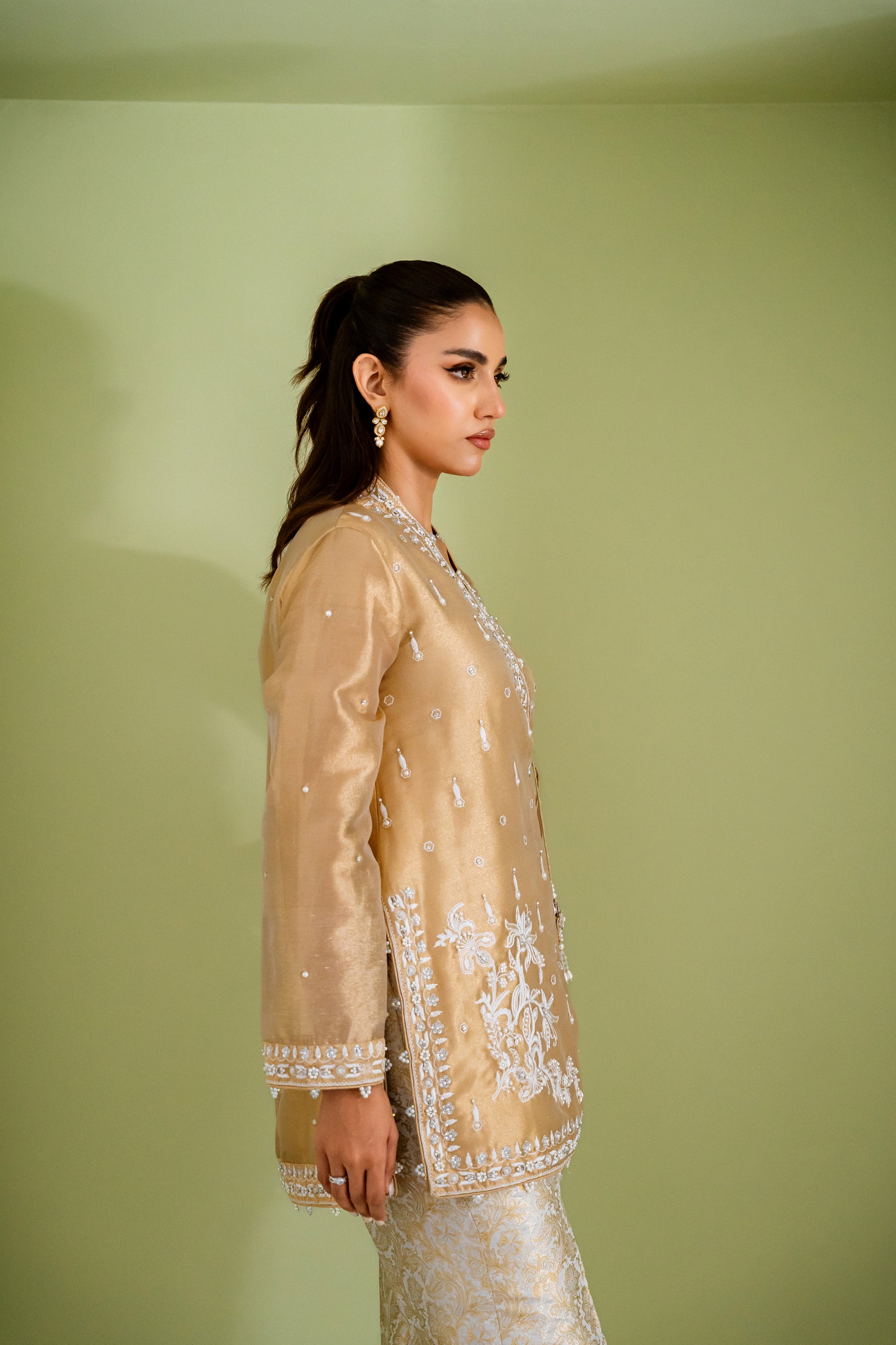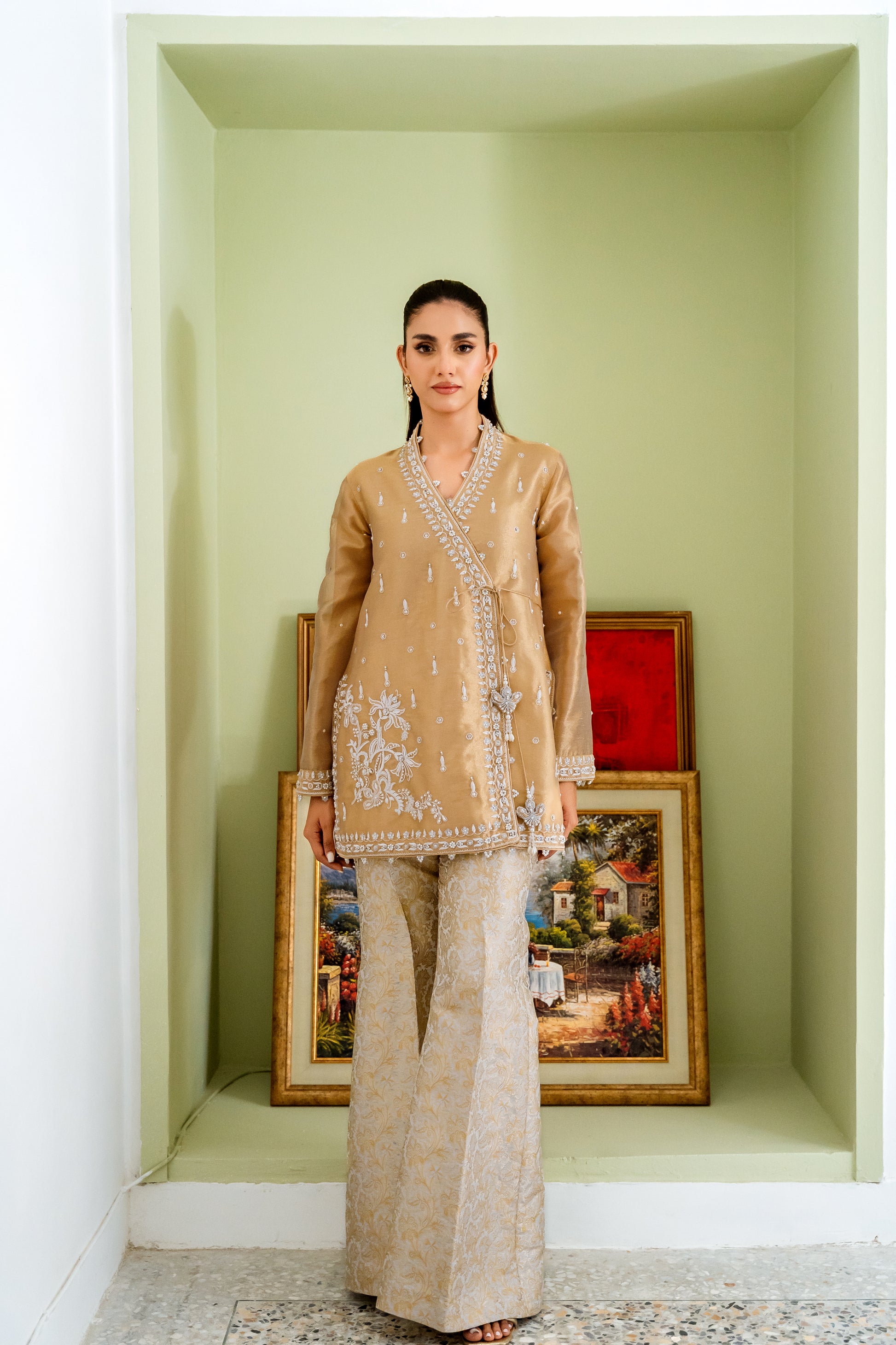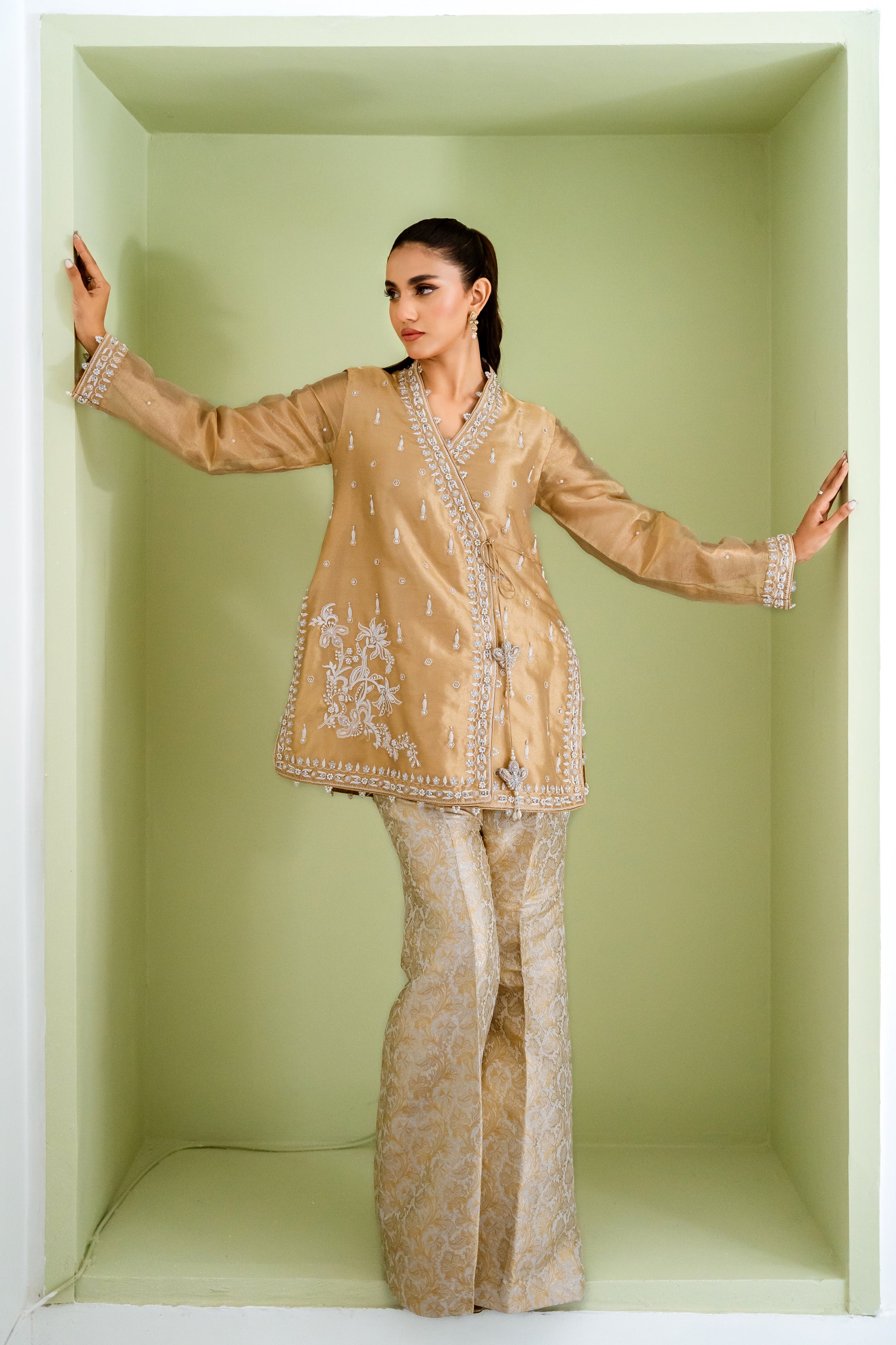 - Dazzle in '24 Karat', a luxurious wrap top crafted from premium tissue. Exquisitely adorned with intricate pearl, ivory resham, and jewel-accented borders and motifs, this modern piece radiates opulence. Paired with flowing Banarsi silk pants, this stunning ensemble is perfect for making a glamorous entrance at any special occasion.