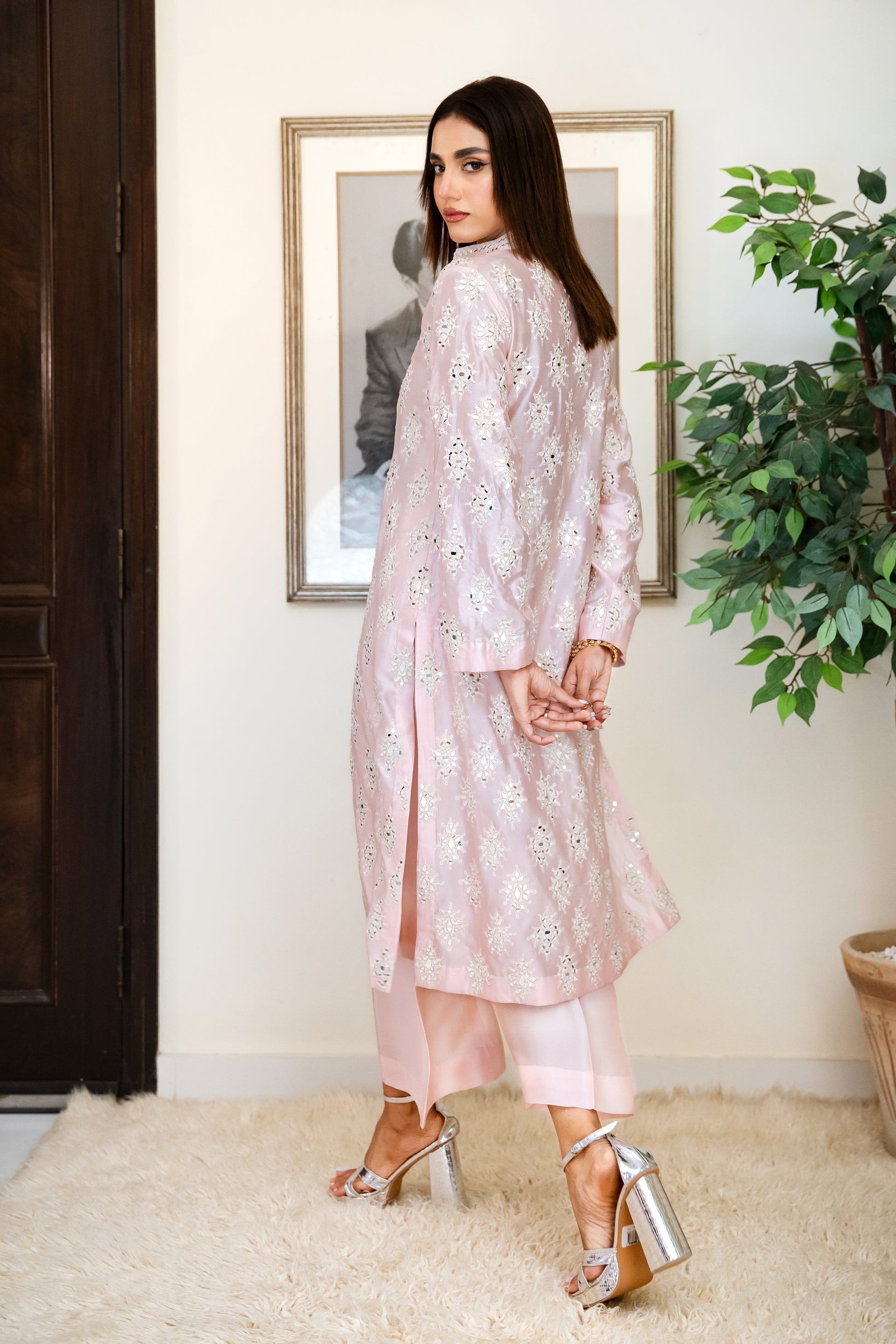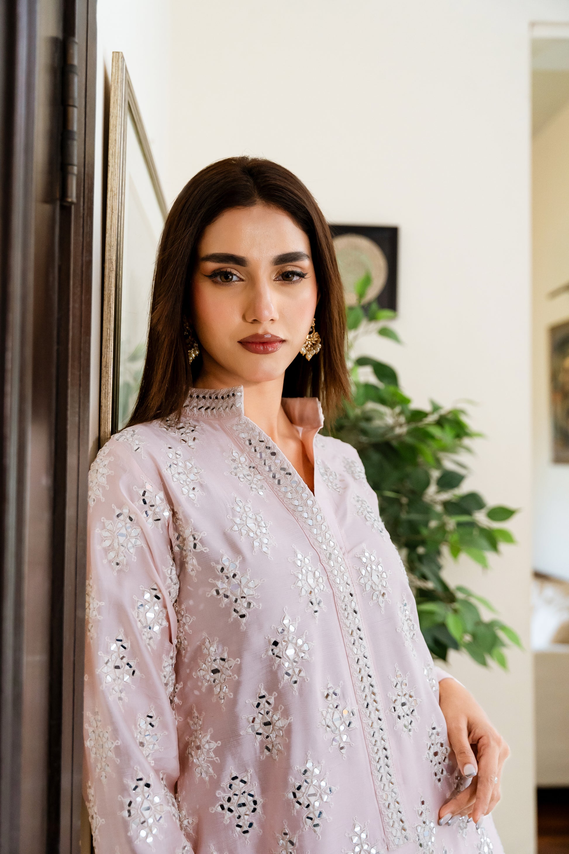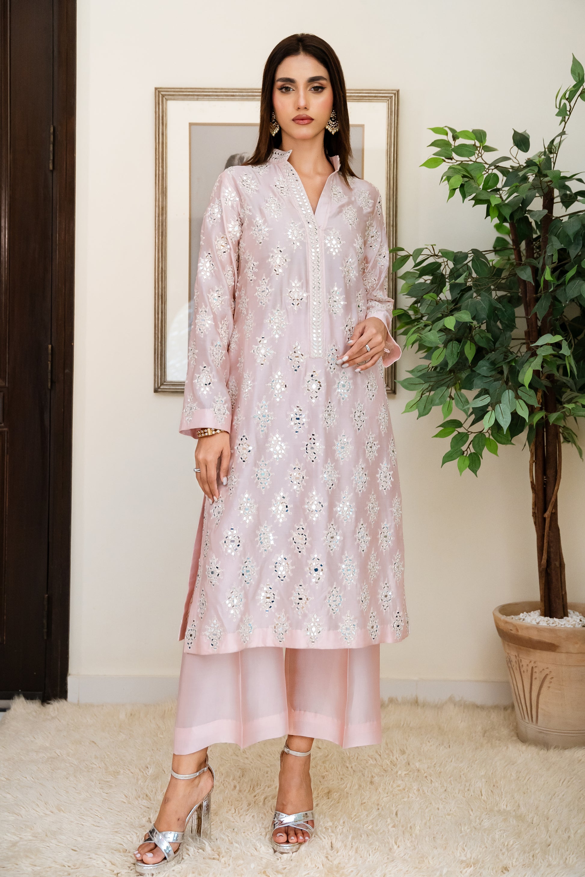 - Make a dazzling statement with the 'AAINA' kurti, featuring intricate mirror work on rich sheesha silk. Paired with matching sheesha silk pants, this glamorous duo is a true showstopper for weddings, parties, or any formal occasion.