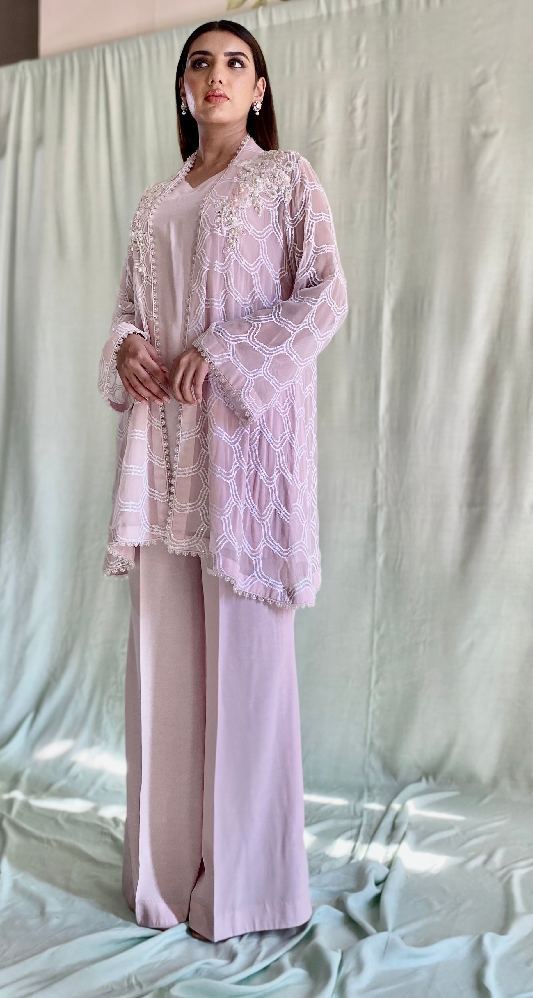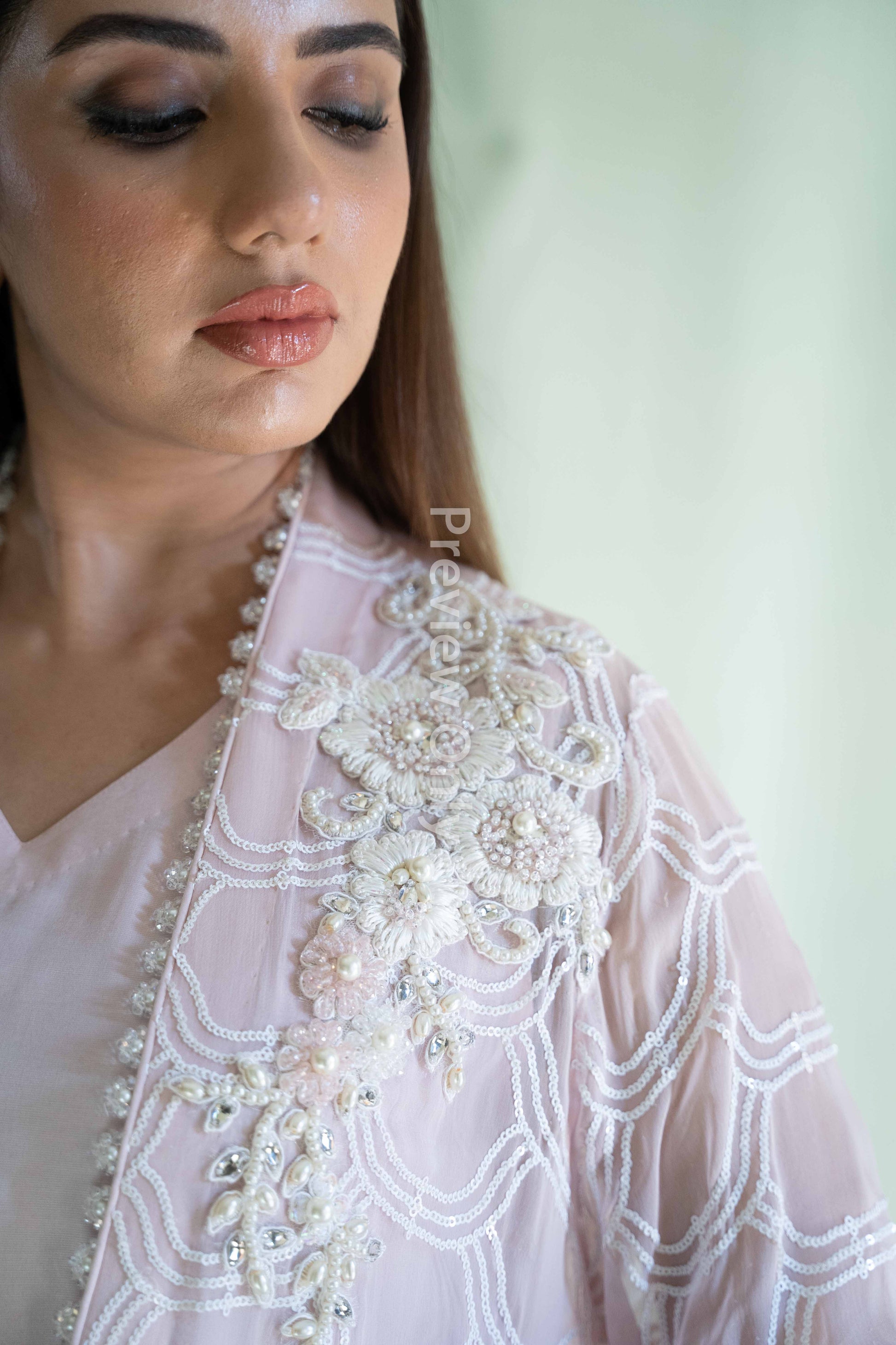 Effusing opulence! This stunning chiffon top is a masterpiece of luxury, featuring an intricate sequin pattern, beaded border and corded lace motifs, expertly worked with sequins, pearls, and crystals. Complemented by a matching silk ejaar and camisole, this one-of-a-kind piece drapes elegantly on the body, tailored for a comfortable and relaxed fit.