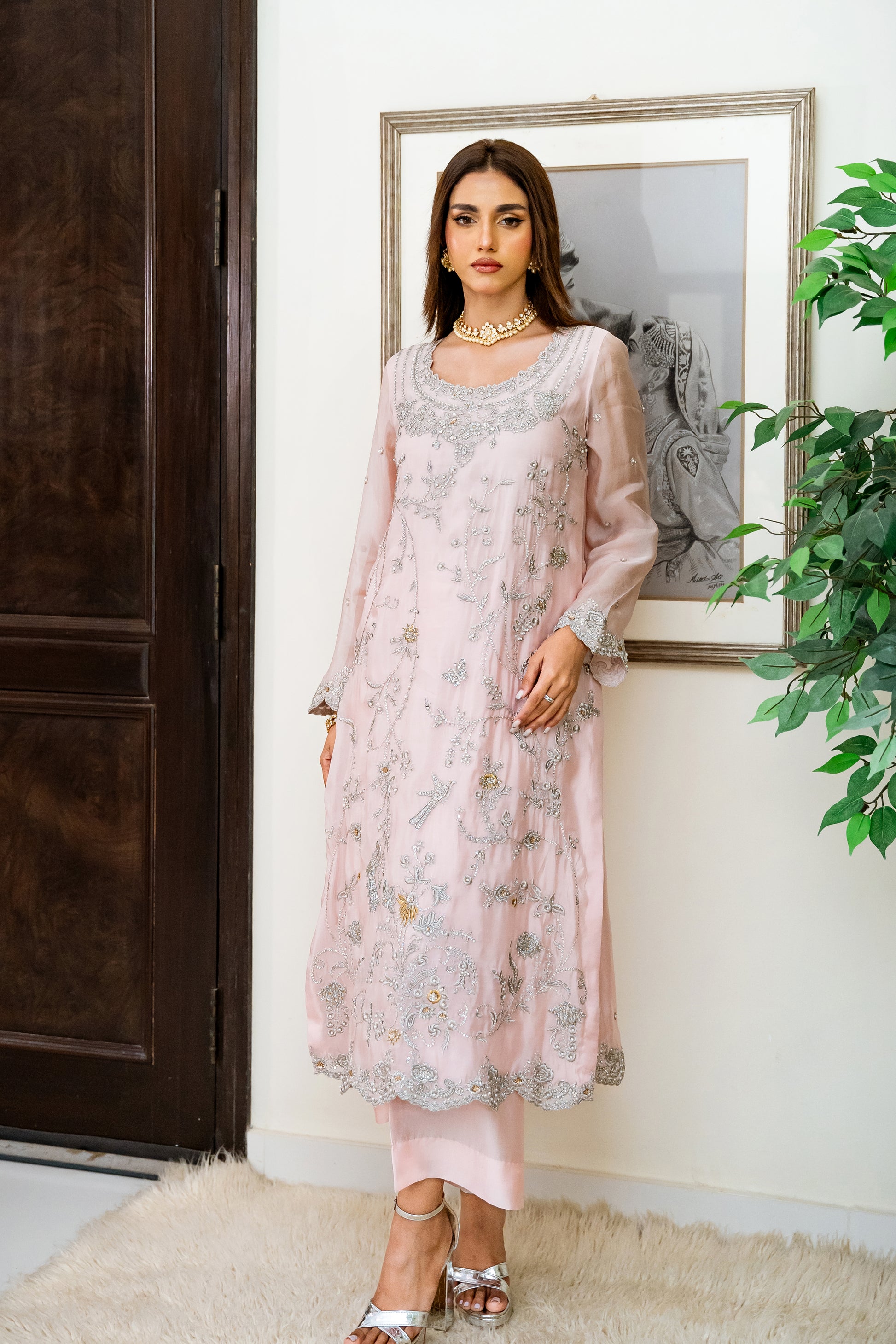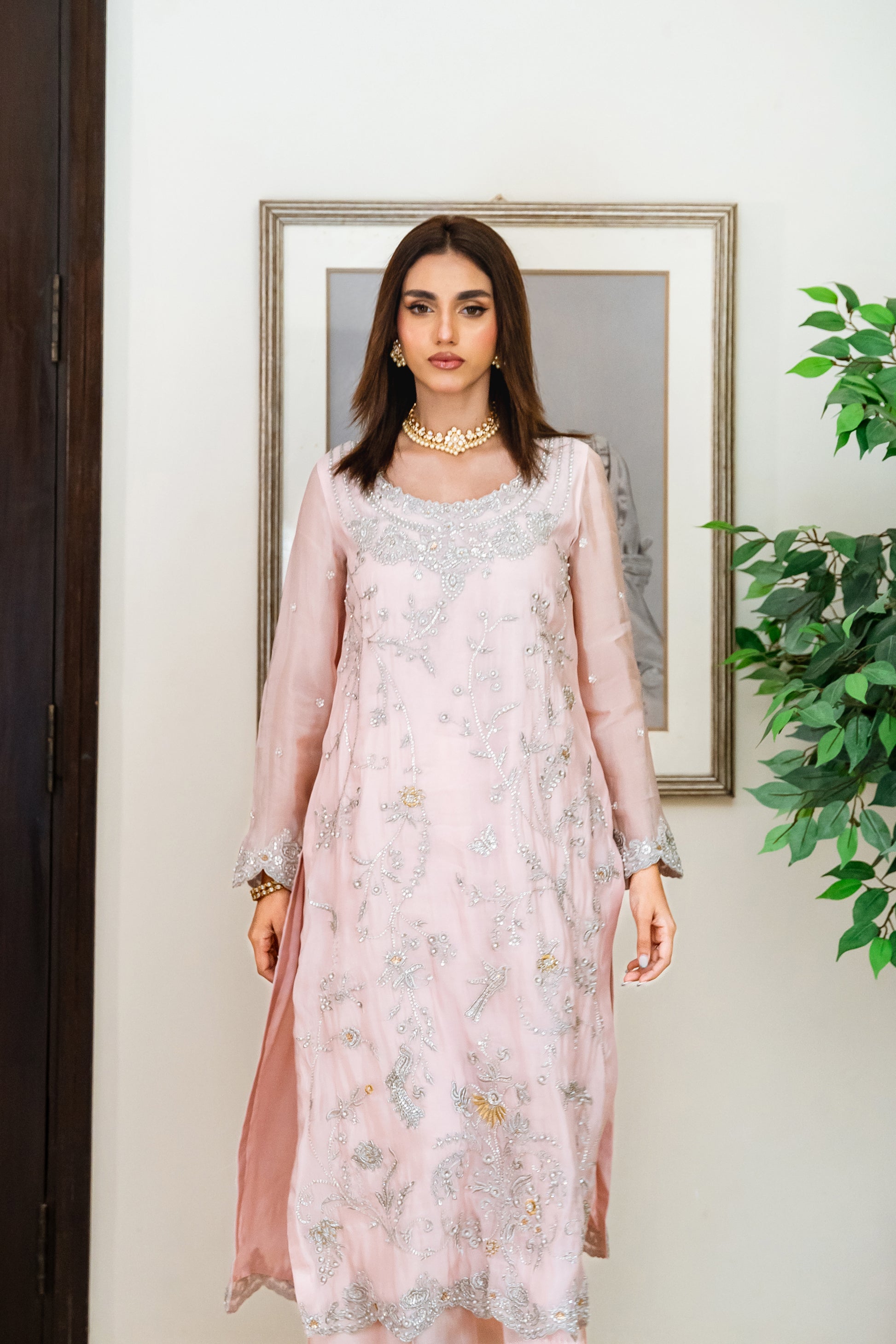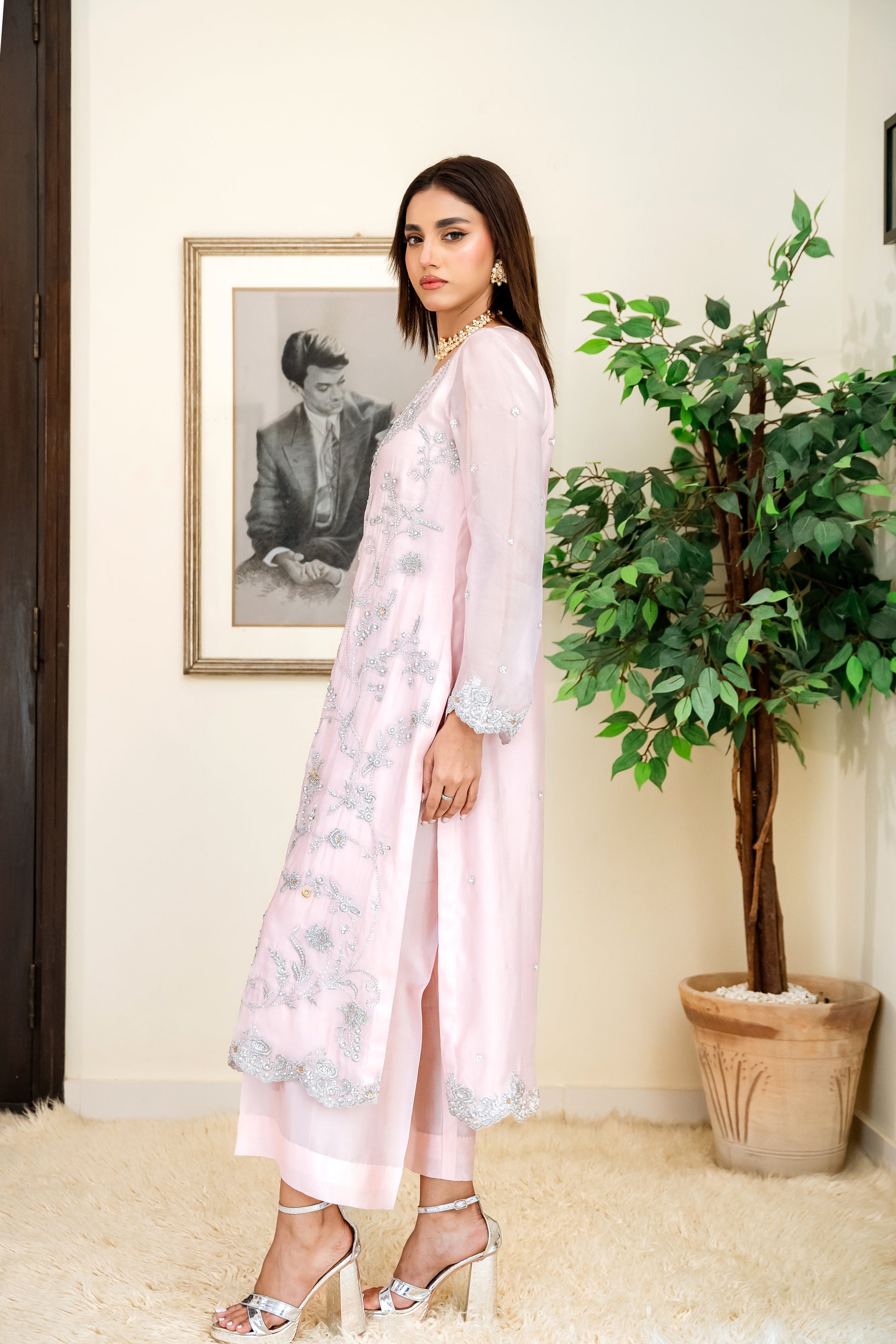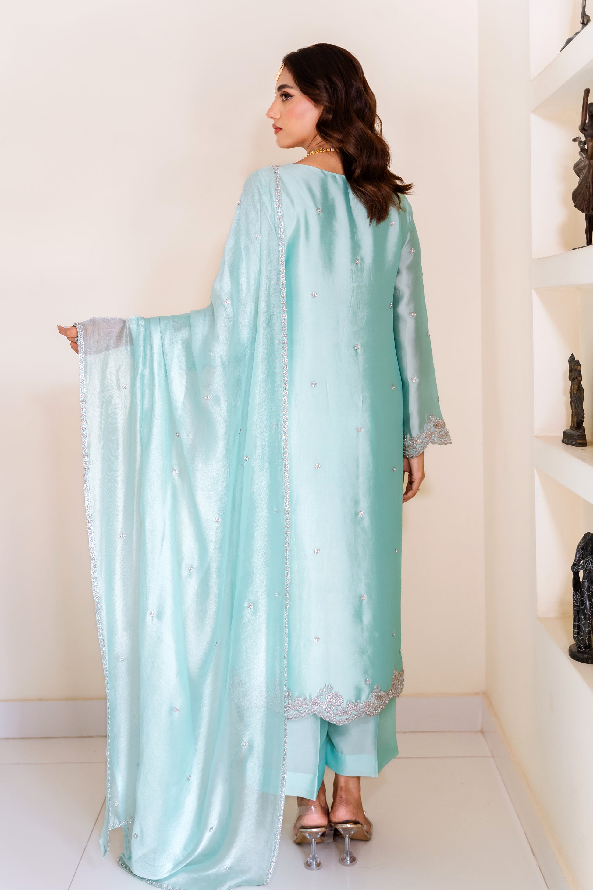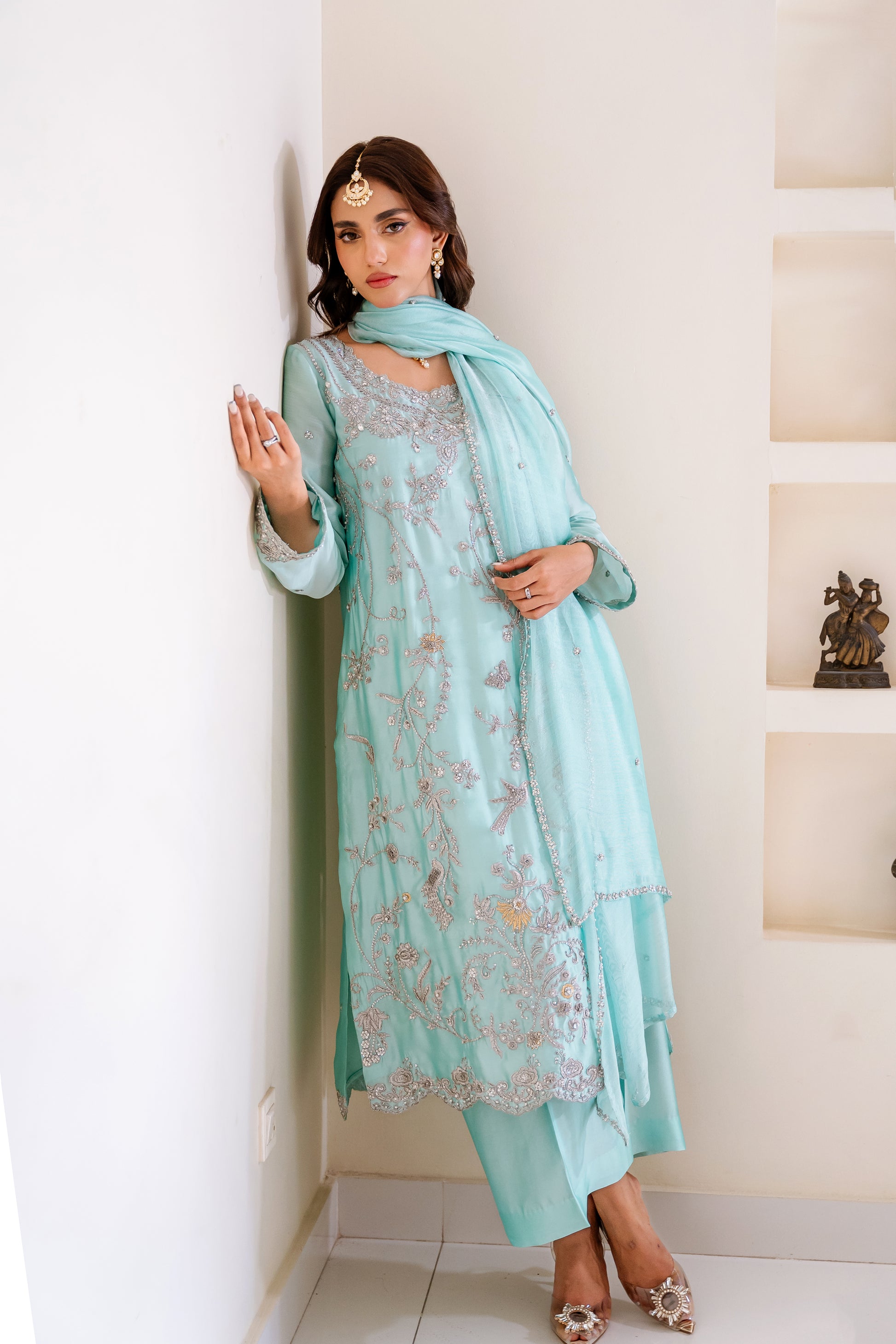 BEJEWELLED BEAUTYThe Bejewelled Beauty ensemble is a dazzling display of opulence and craftsmanship. Crafted from a choice of aqua sheesha silk or pink sheesha organza, the outfit showcases intricate silver kasab with gold accents, with exquisite zardozi embroidered jaal on the front with motifs & borders on the sleeves & back, evoking the majesty of a bygone era. Paired with a stunning spun silk net/ Sheesha organza dupatta featuring a jewel-encrusted border and scattered motifs, and completed with matching sheesha silk pants, this outfit shines with regal splendor.