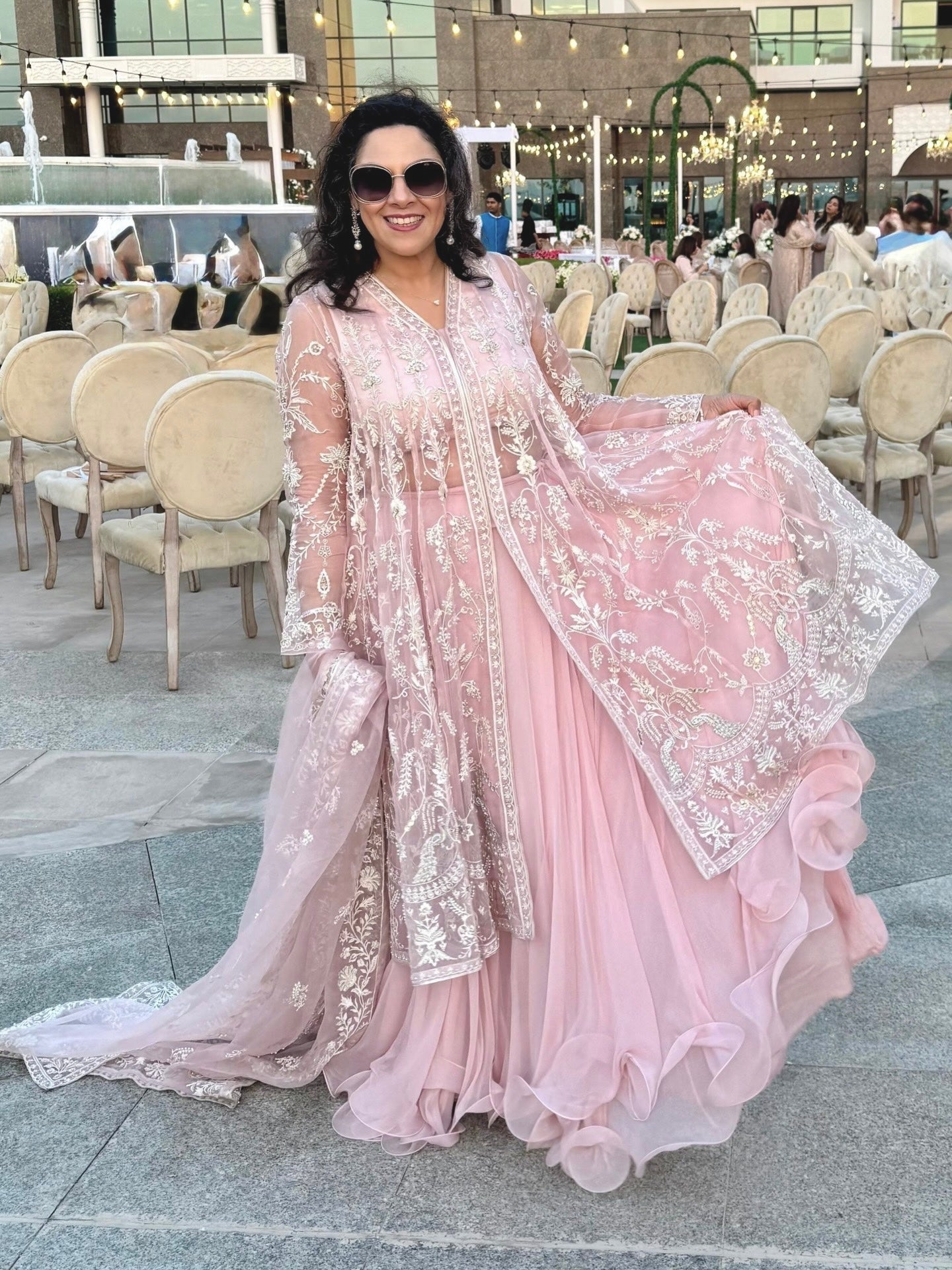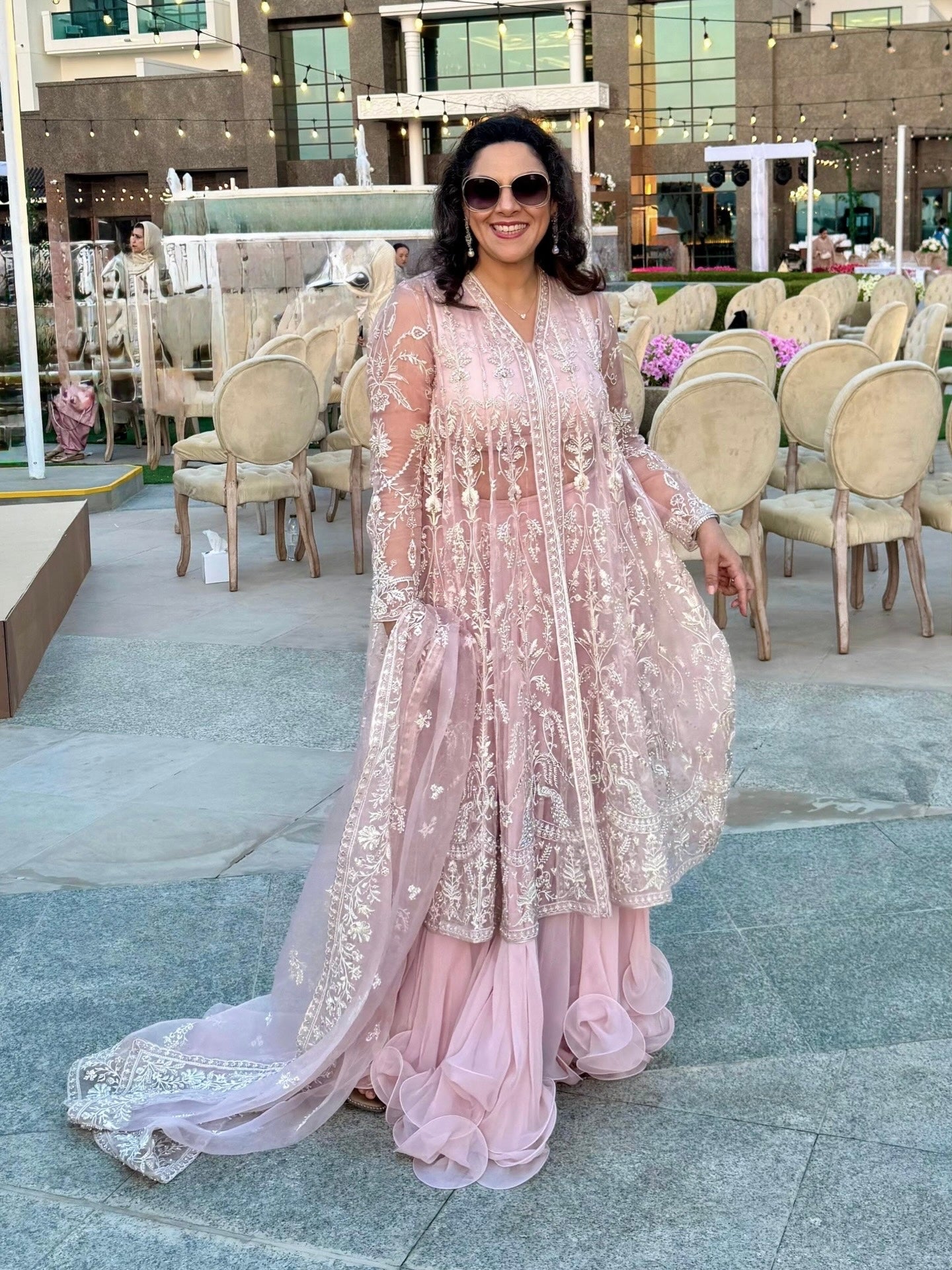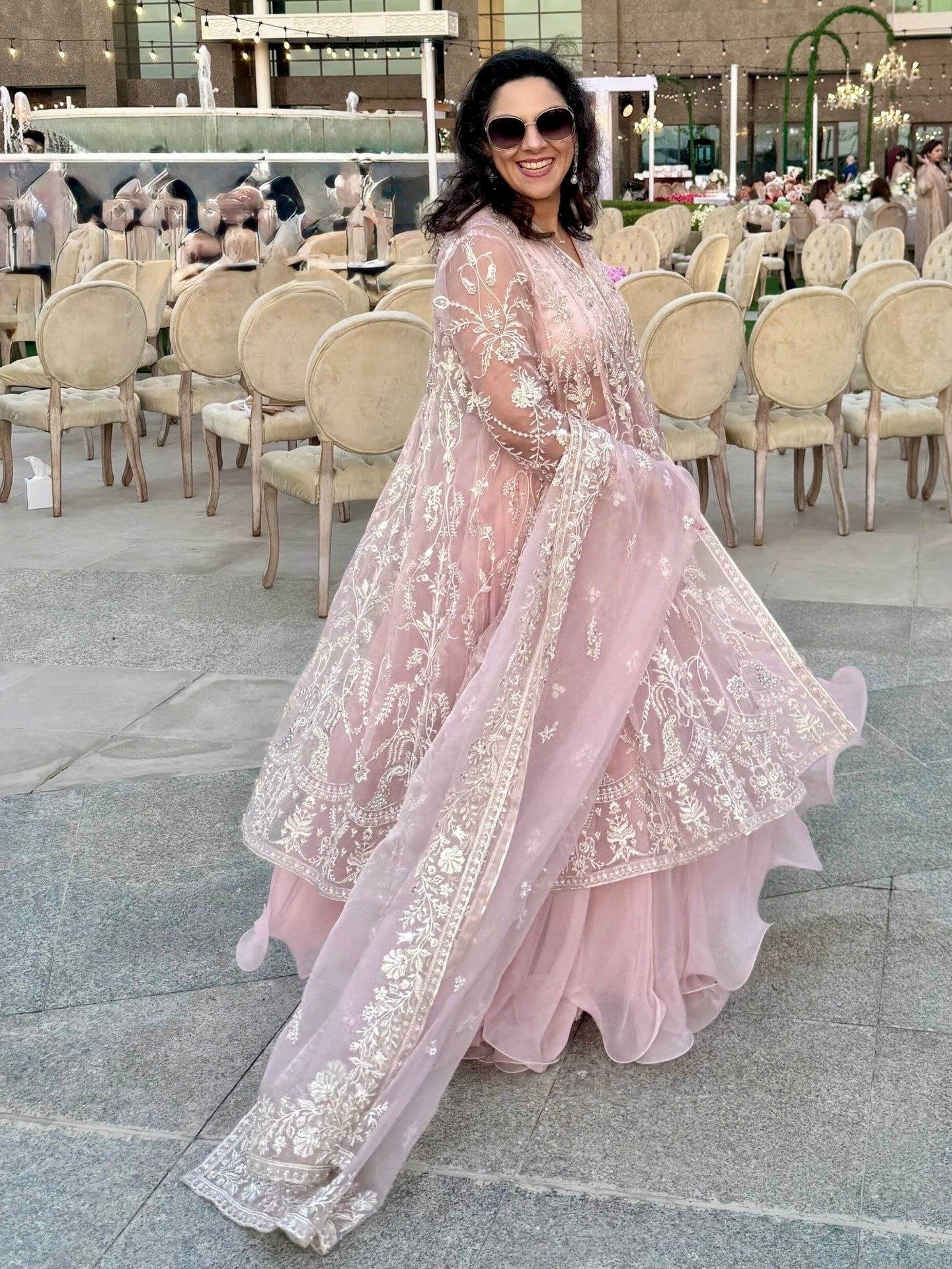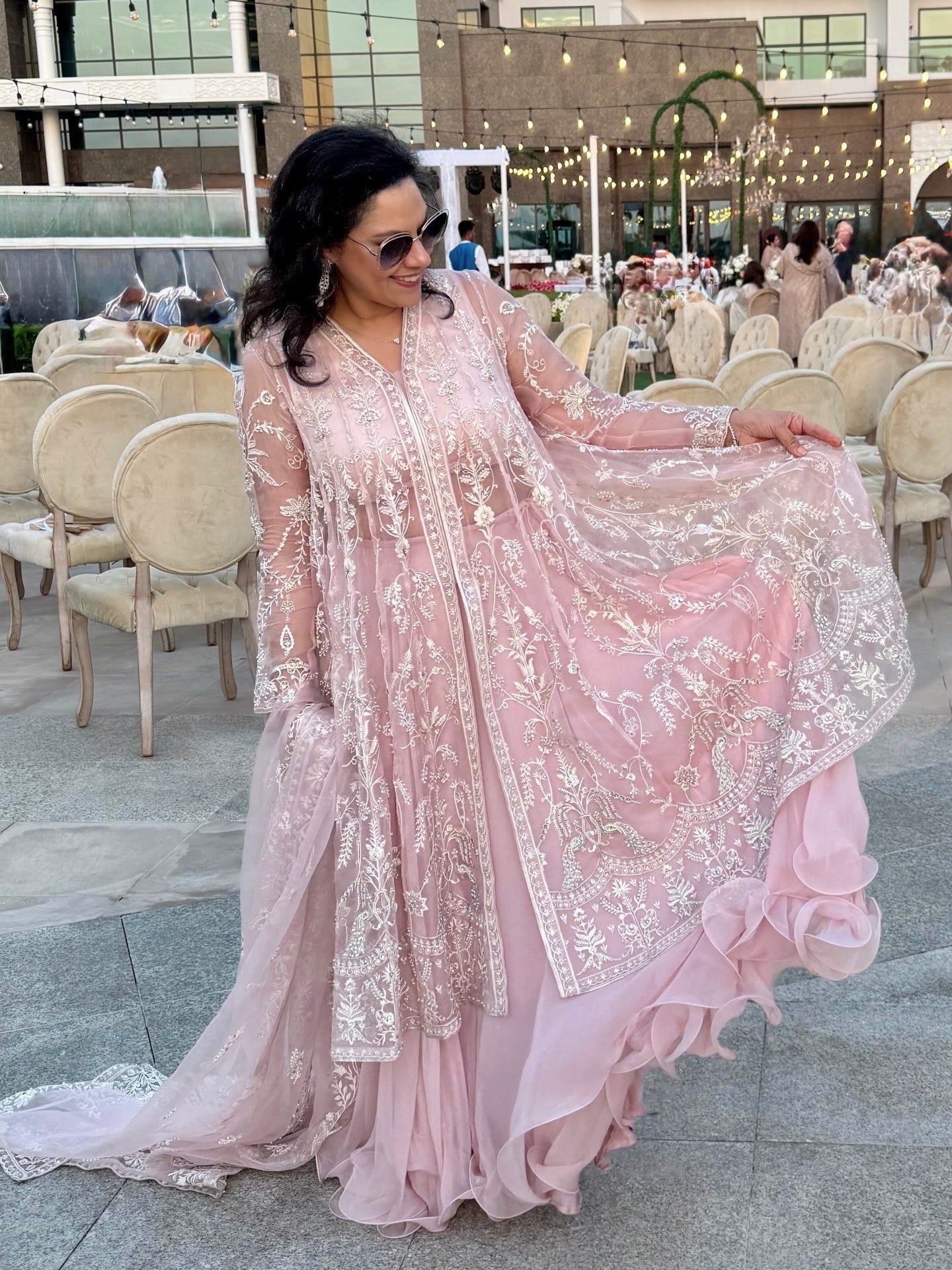 Nūr-e-Chaman – A tribute to timeless Mughal artistry, this organza ensemble features intricate ivory resham embroidery with delicate hints of silver and gold zari, enhanced with pearls, rhinestones, sequins, and dabka. Styled as a flowing long Kalidar with embroidered sleeves and a matching embroidered dupatta, it is paired with a double-layered chiffon swirly lehenga, blending opulence, elegance, and contemporary couture movement — perfect for any formal or festive celebration.