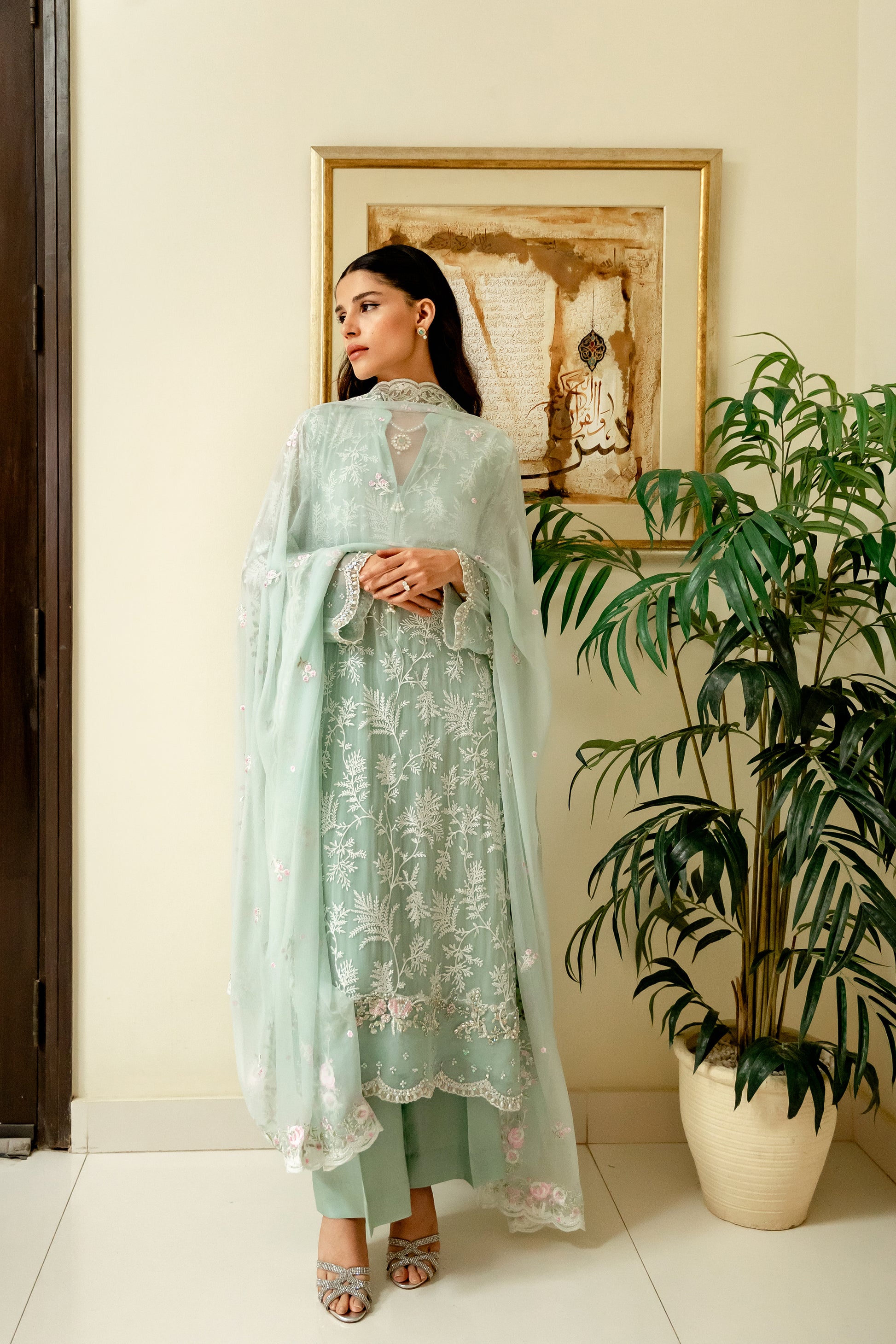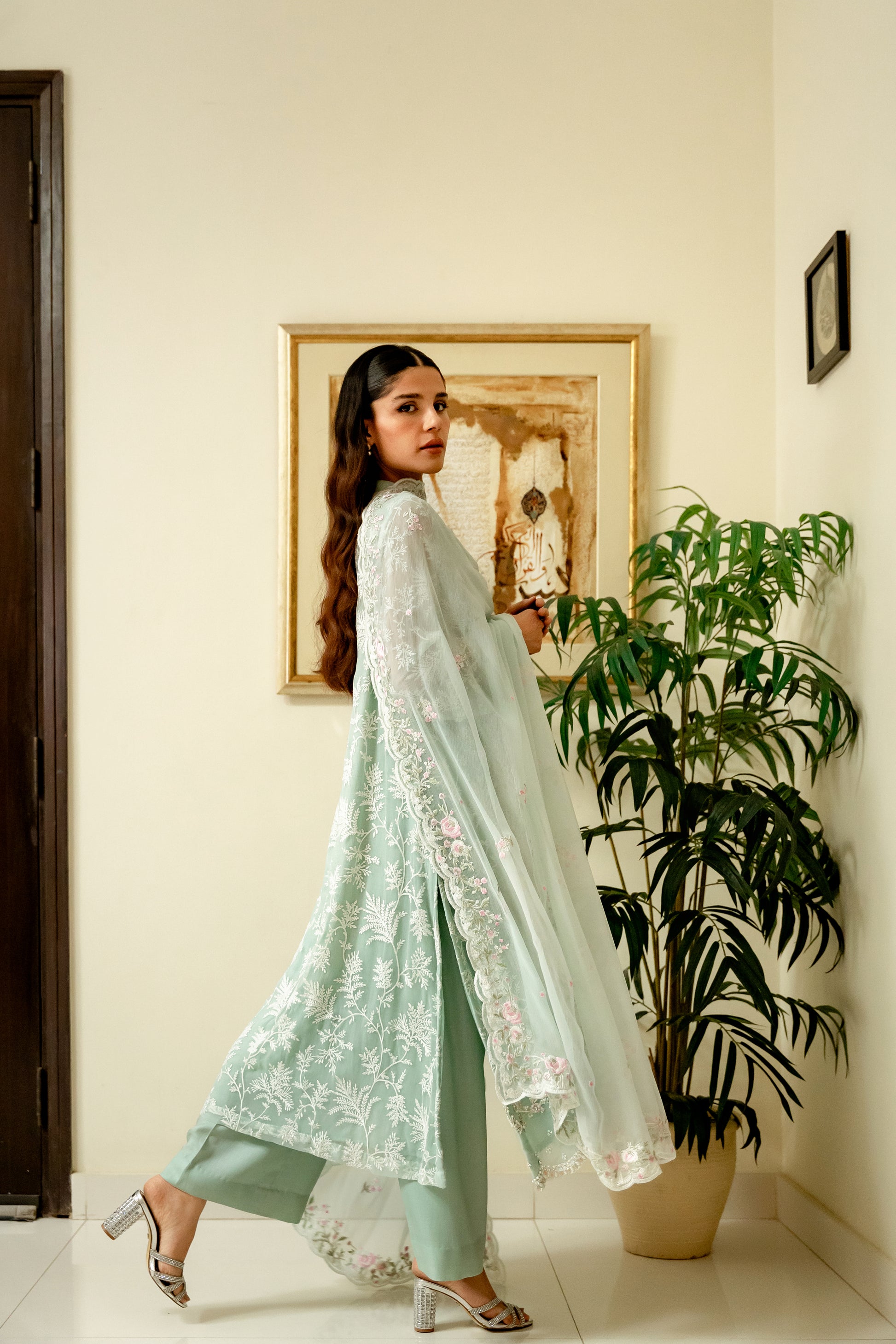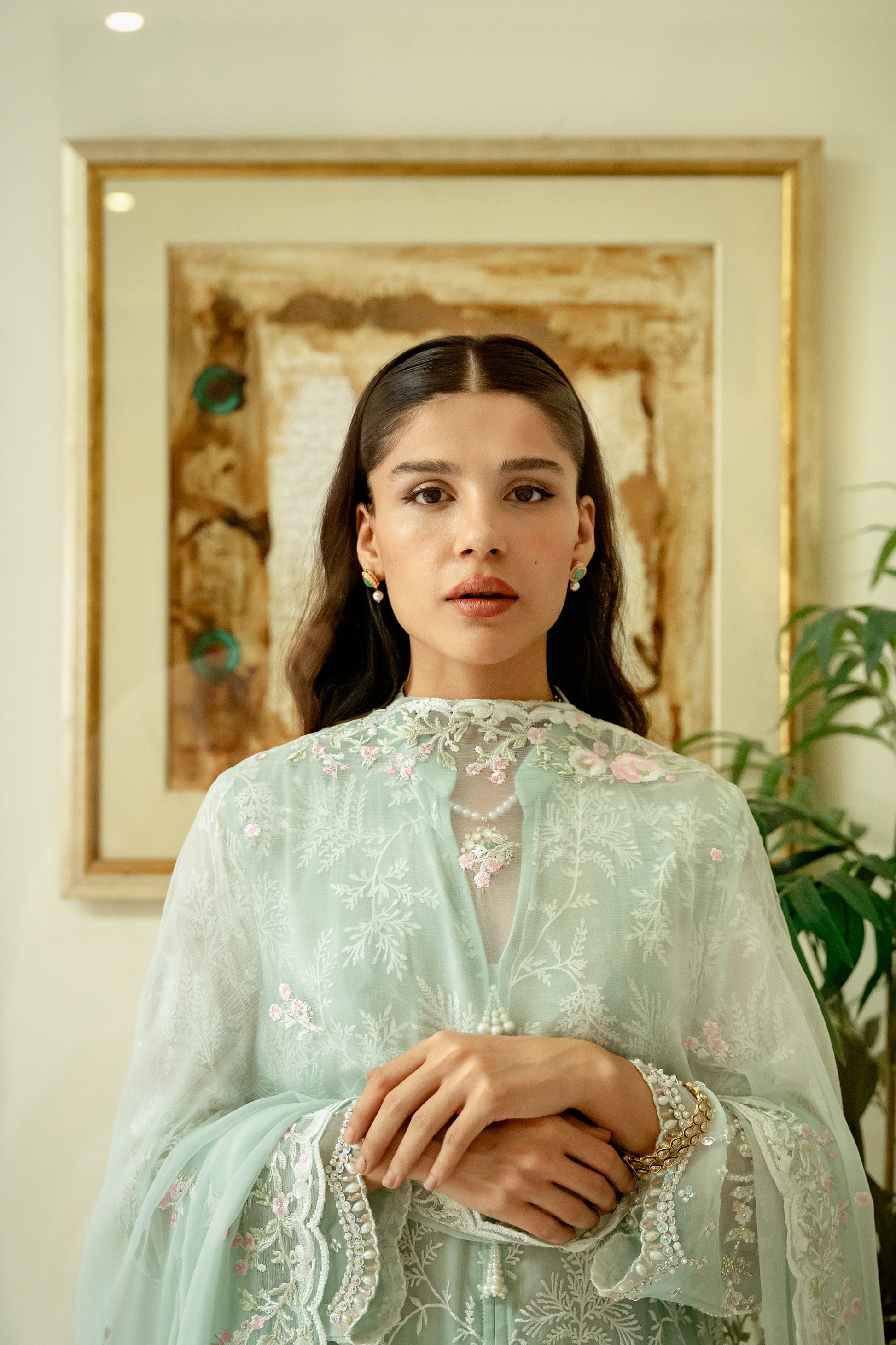 The classic, much loved feminine Dilkash A-line set is crafted using a myriad of techniques like appliqué work, silver zardozi, resham, pearls, glistening mirrors and jewels, paired with matching ejaar giving it a contemporary touch of freedom and ease.
