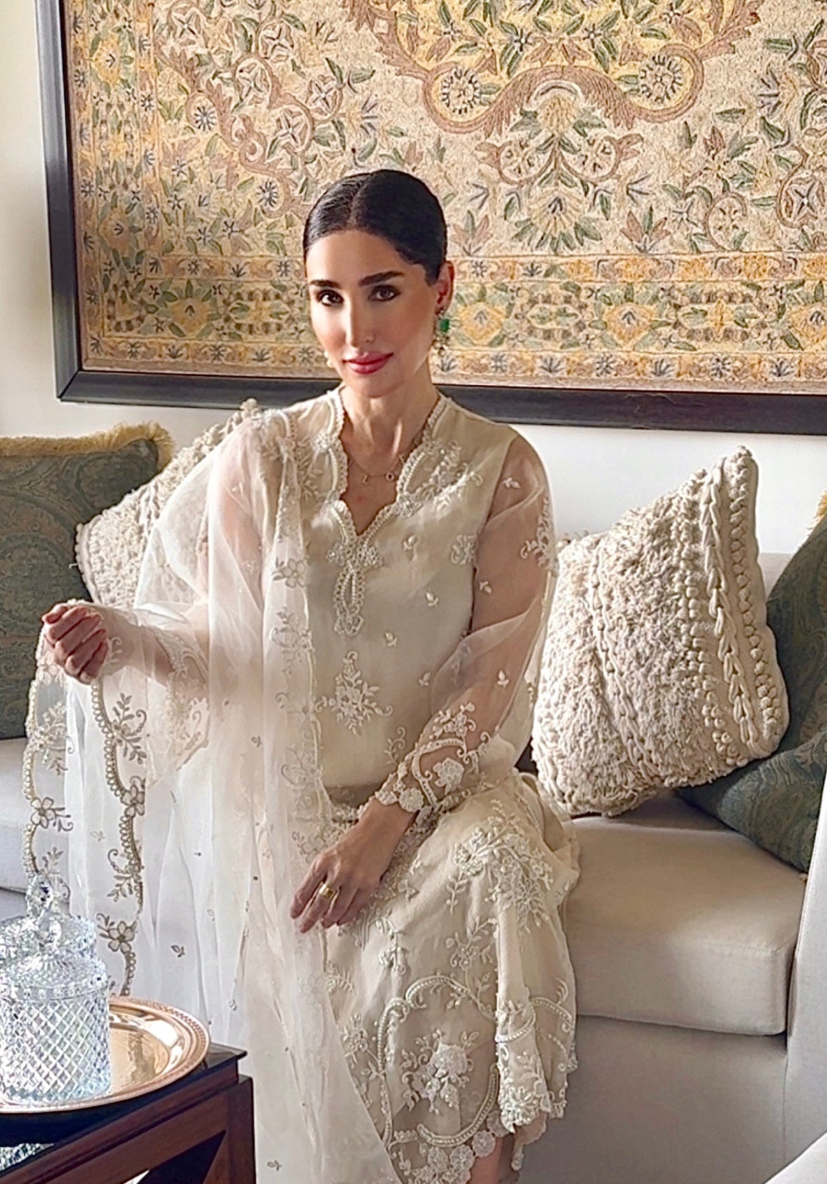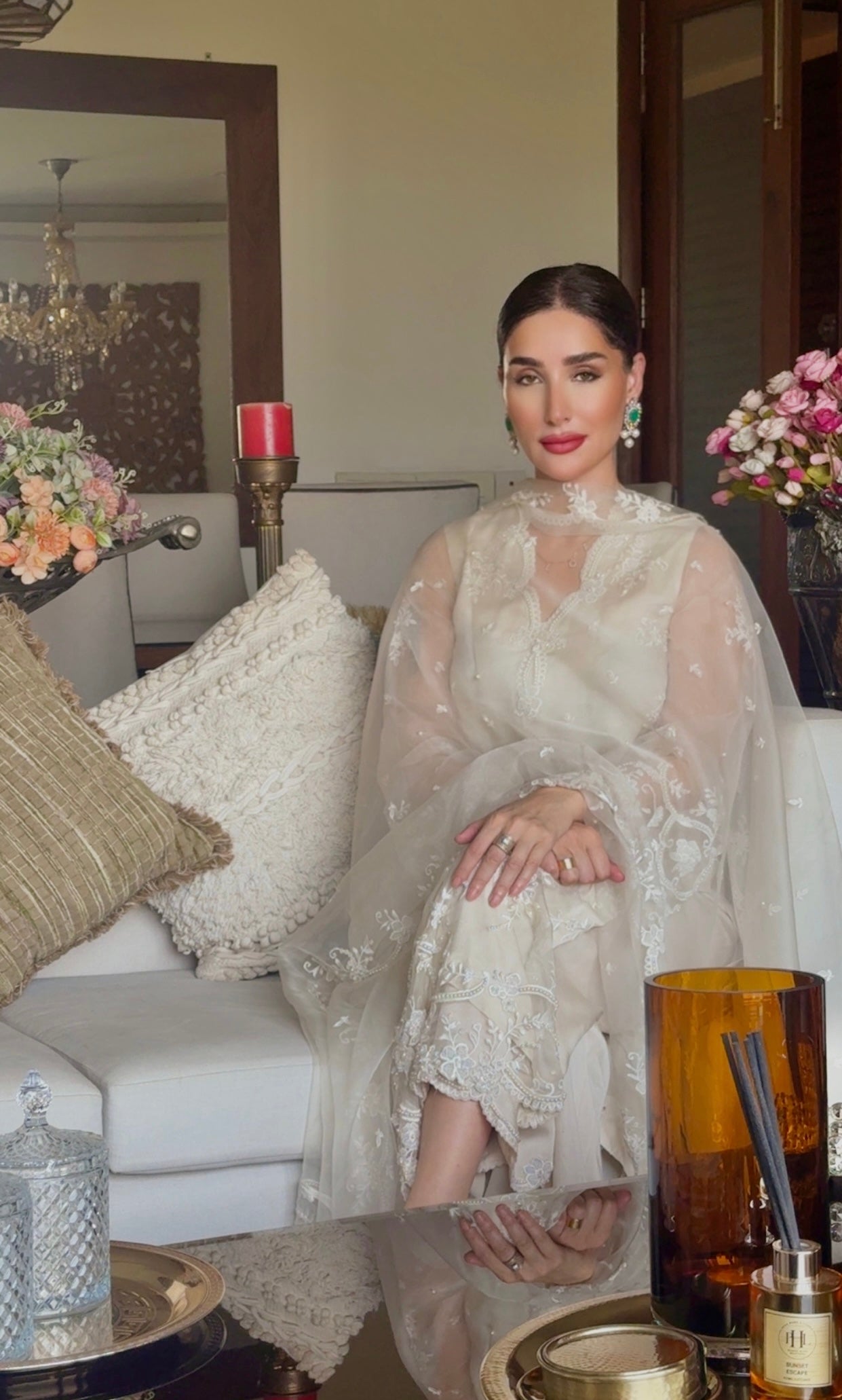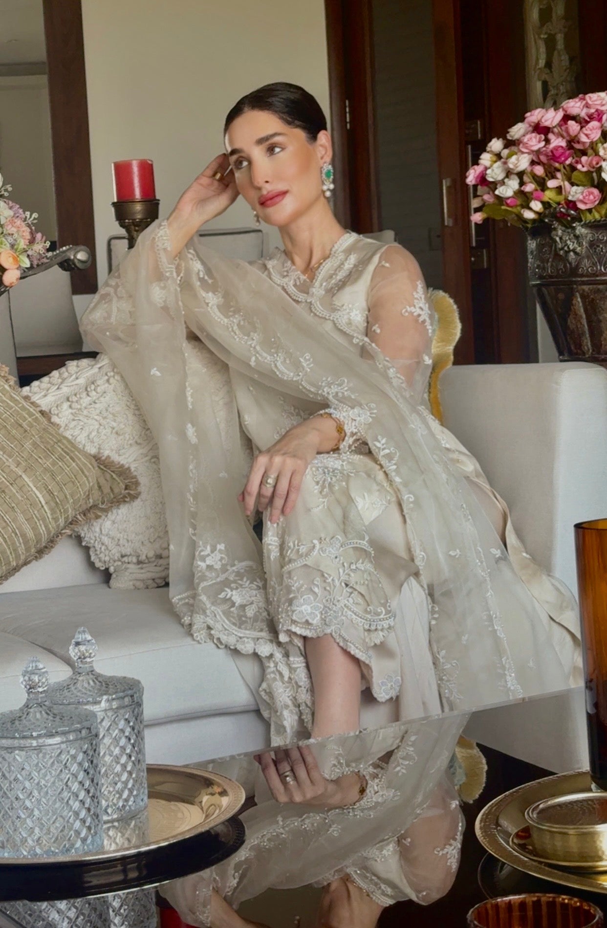 It is paired with a matching organza dupatta, echoing the kameez embroidery, detailed with a scalloped border and an accentuated pallu for a timeless, regal finish.
