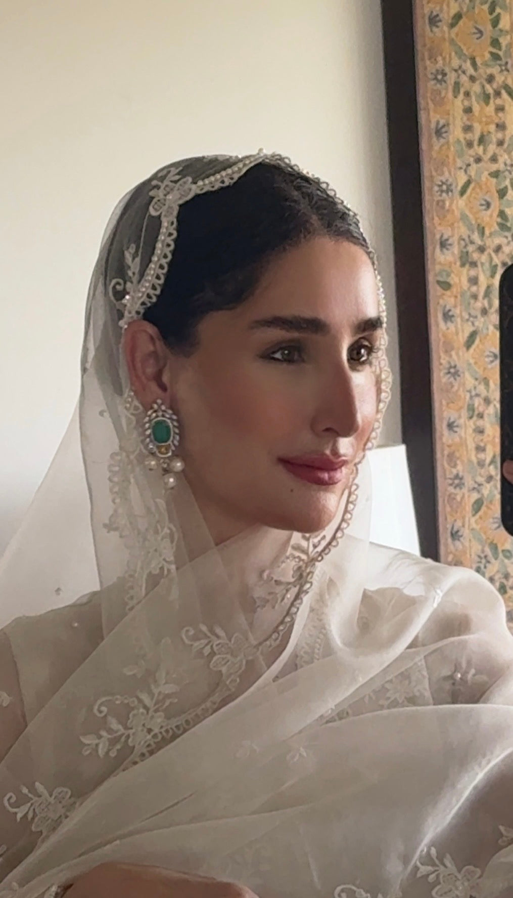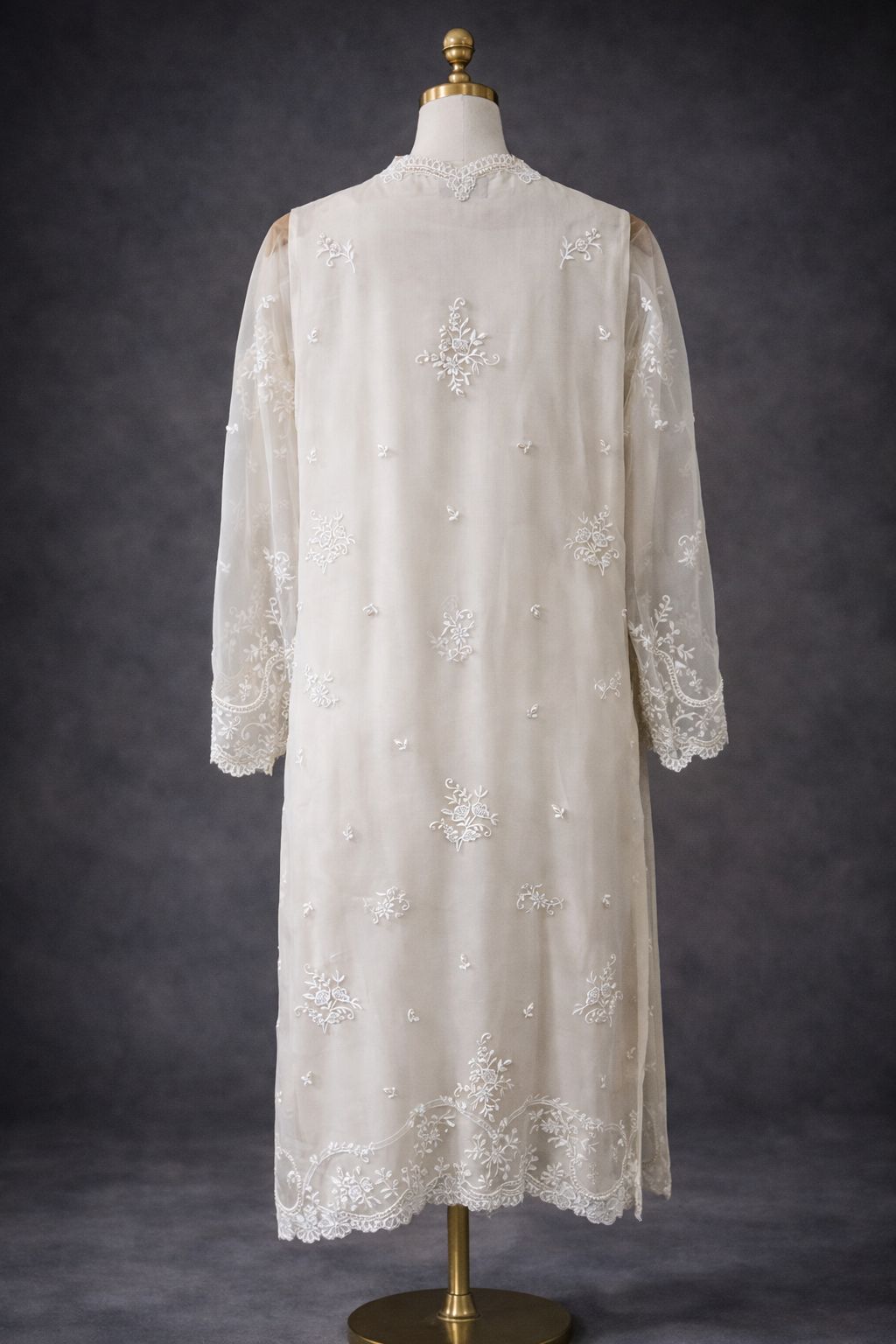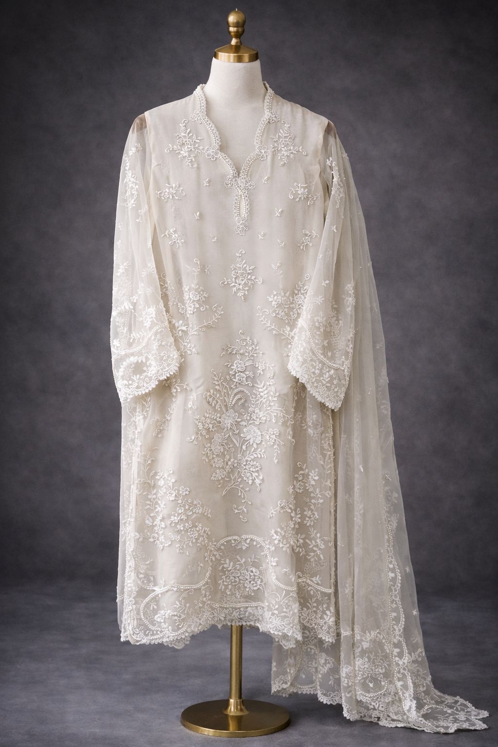Duchess is crafted in pure organza, adorned with delicate ivory embroidery inspired by vintage lace—featuring graceful scallops, florals, and trailing leaves. The surface is richly encrusted with pearls, sequins, crystals, and rhinestones, adding a refined, luminous depth. Intricate scalloped cutwork defines the neckline, sleeves, and ezaar, while the front and back daman are finished with elegant cutwork edges.