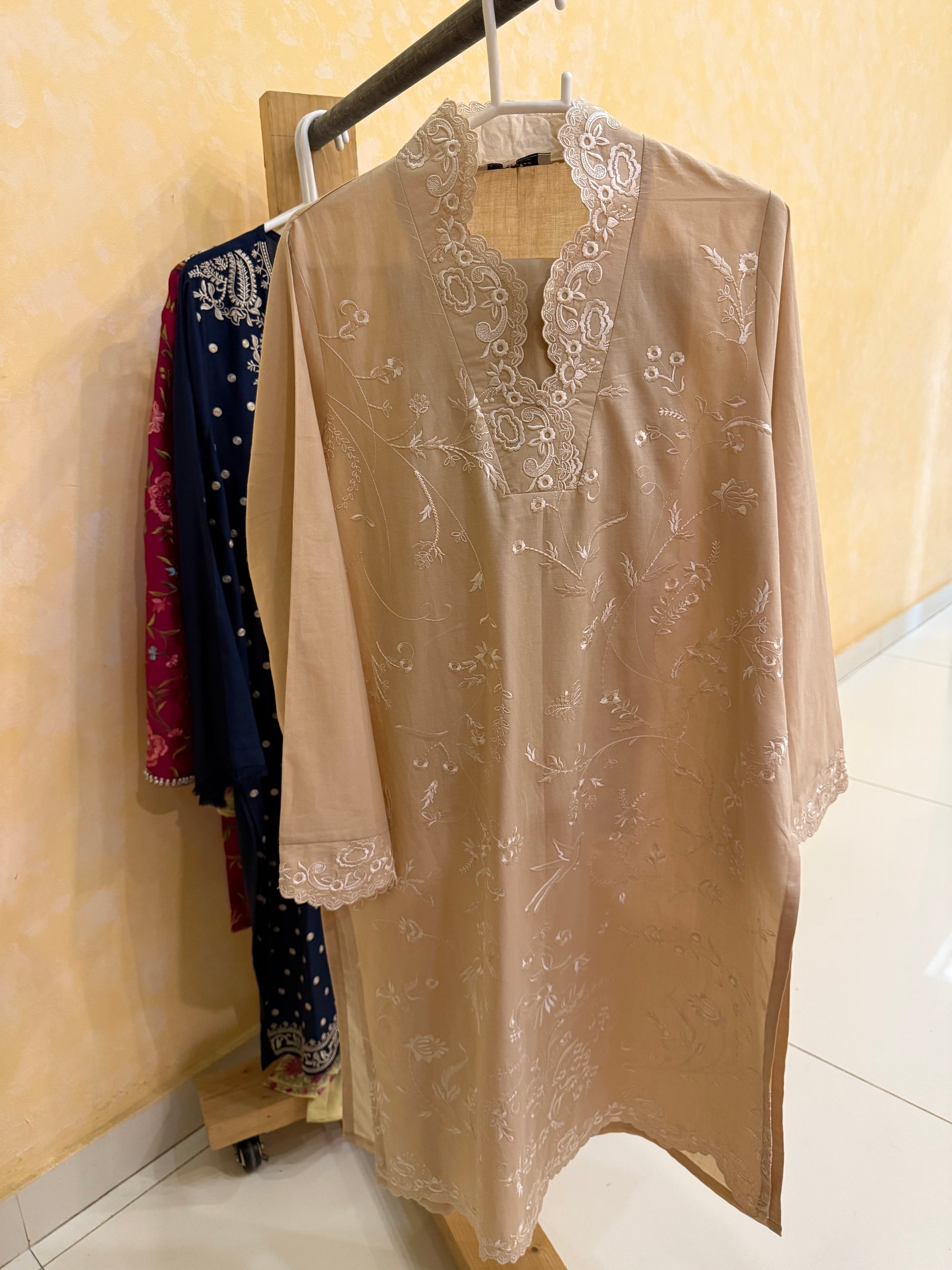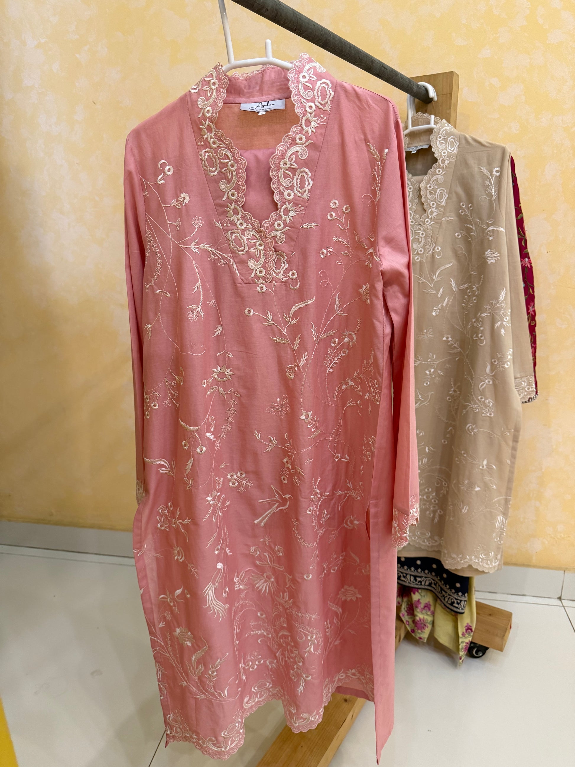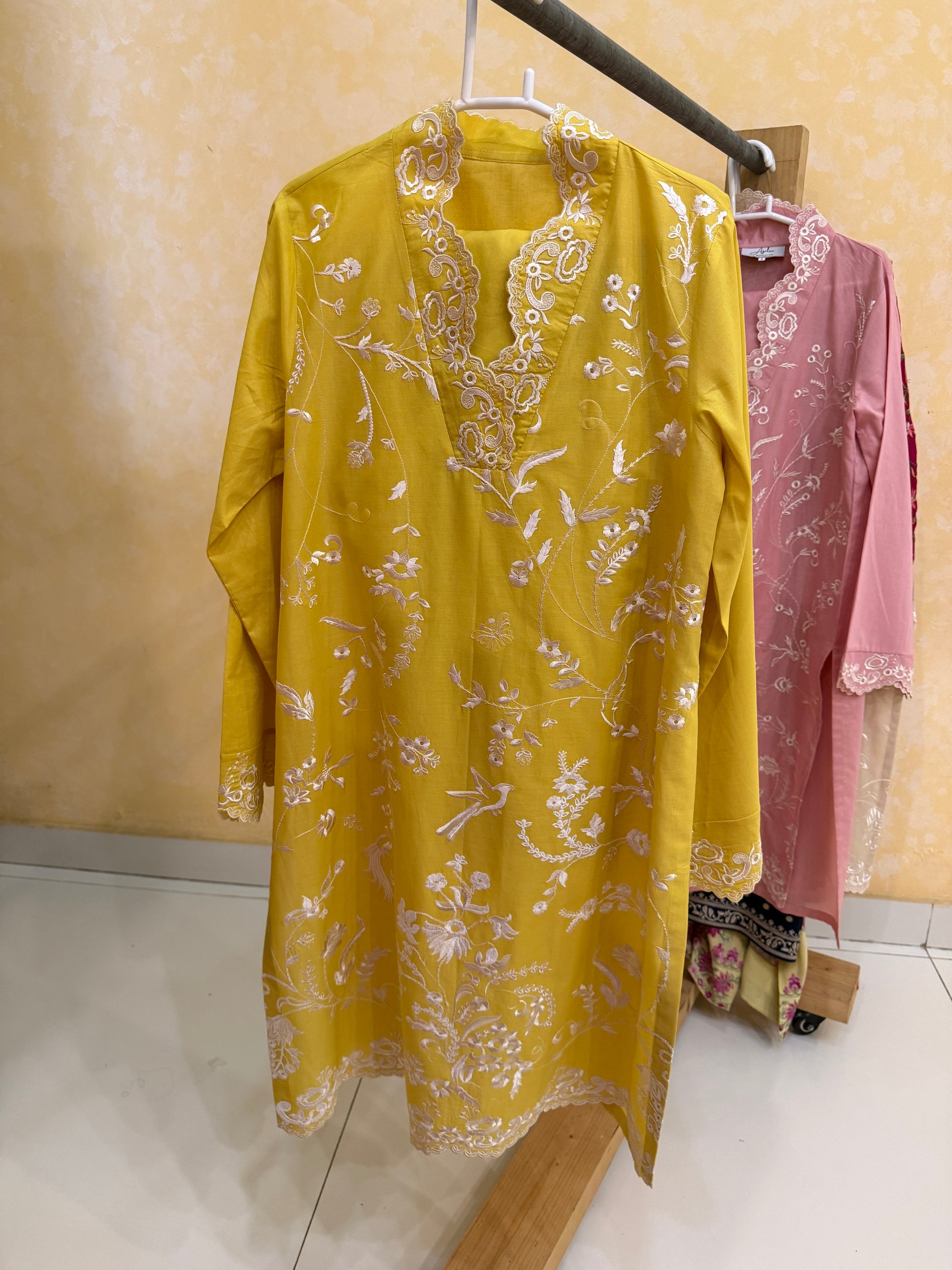 This stunning lawn kurti features nature-inspired embroidery featuring florals, birds, and peacocks, beautifully crafted in ivory resham, and is framed by a delicate border with scalloped edges on the neck, daman and sleeves. Paired with skinny shalwar, this set is available in various colour variations, making it perfect for any occasion in warm weather with it’s lightweight and breathable lawn fabric.