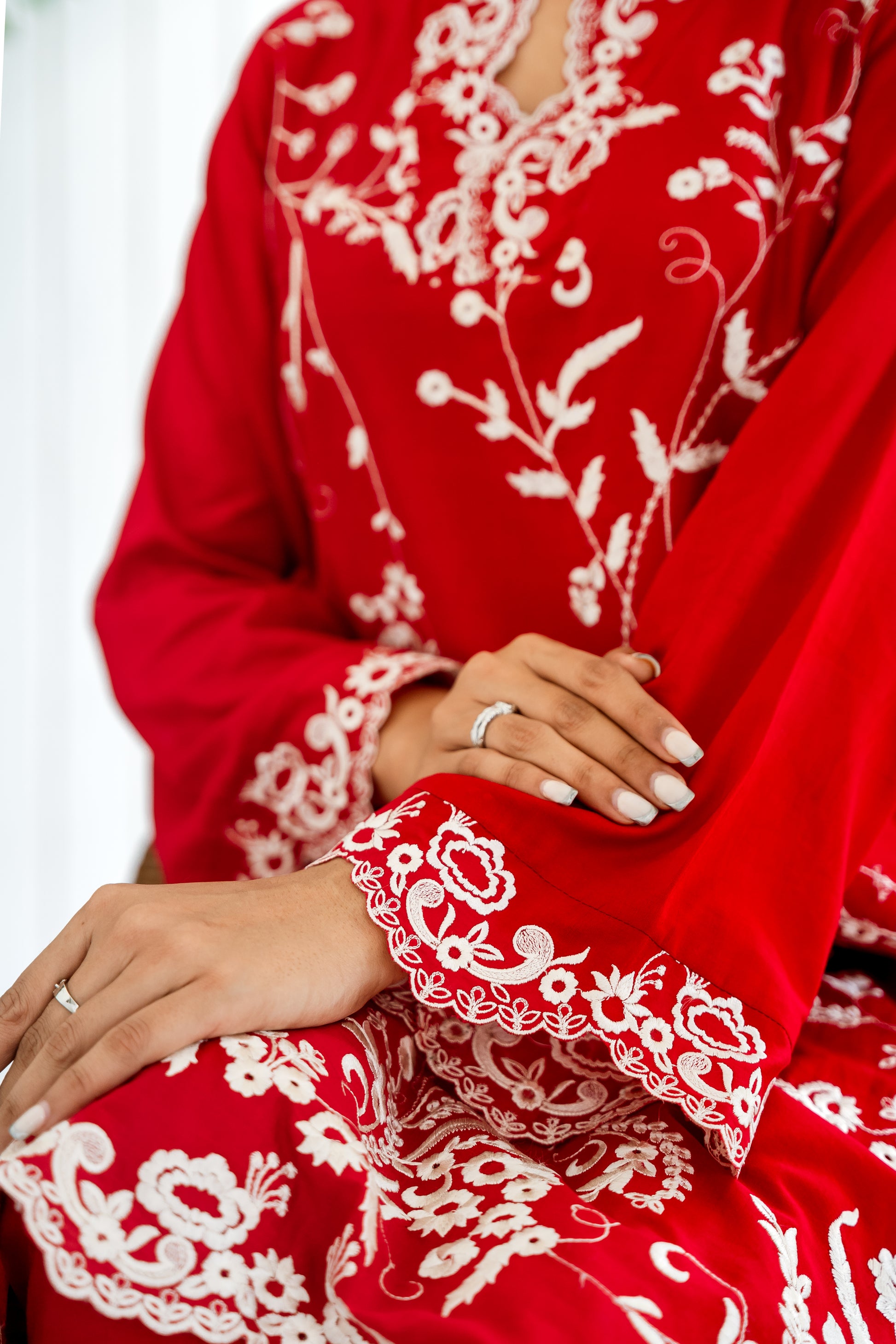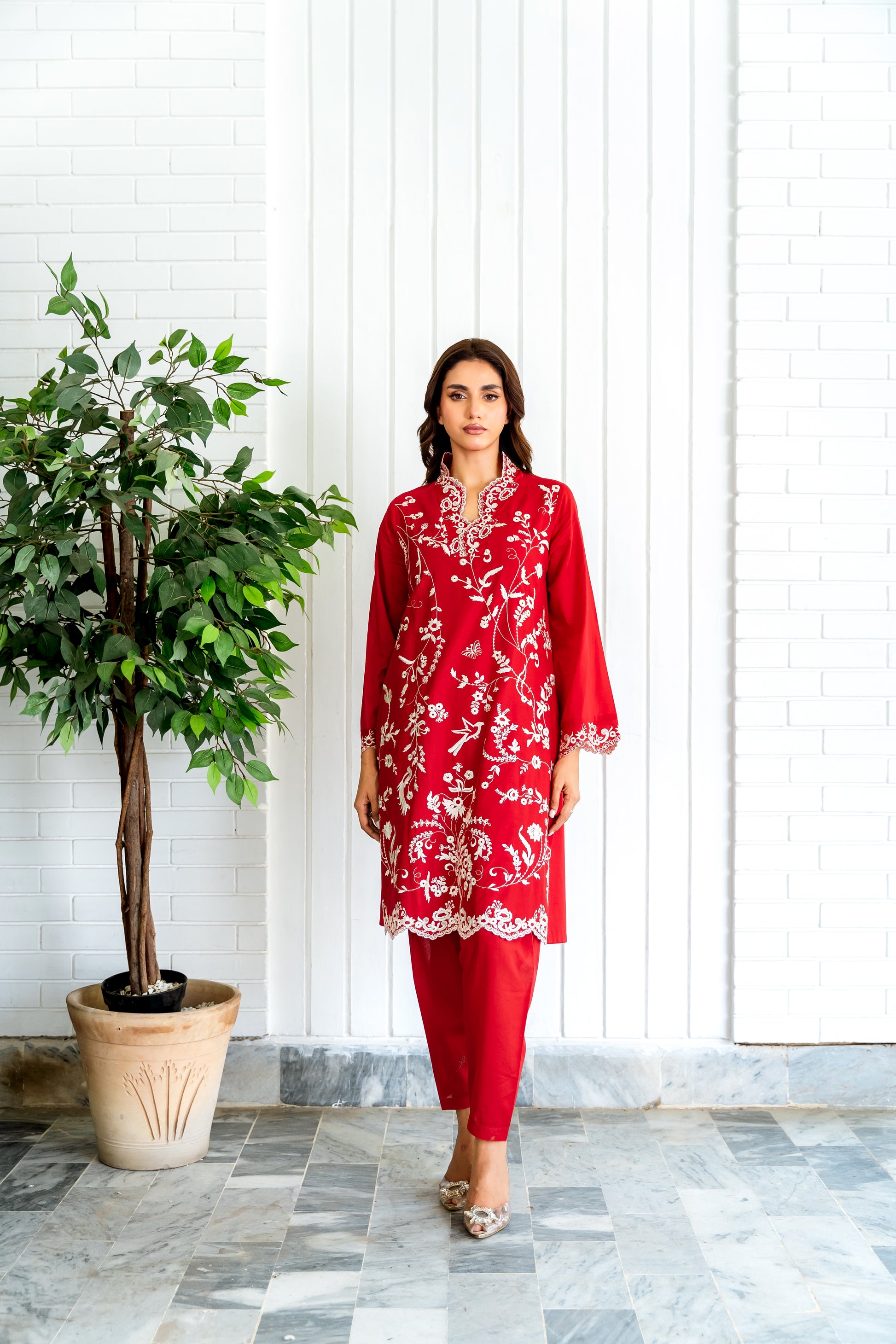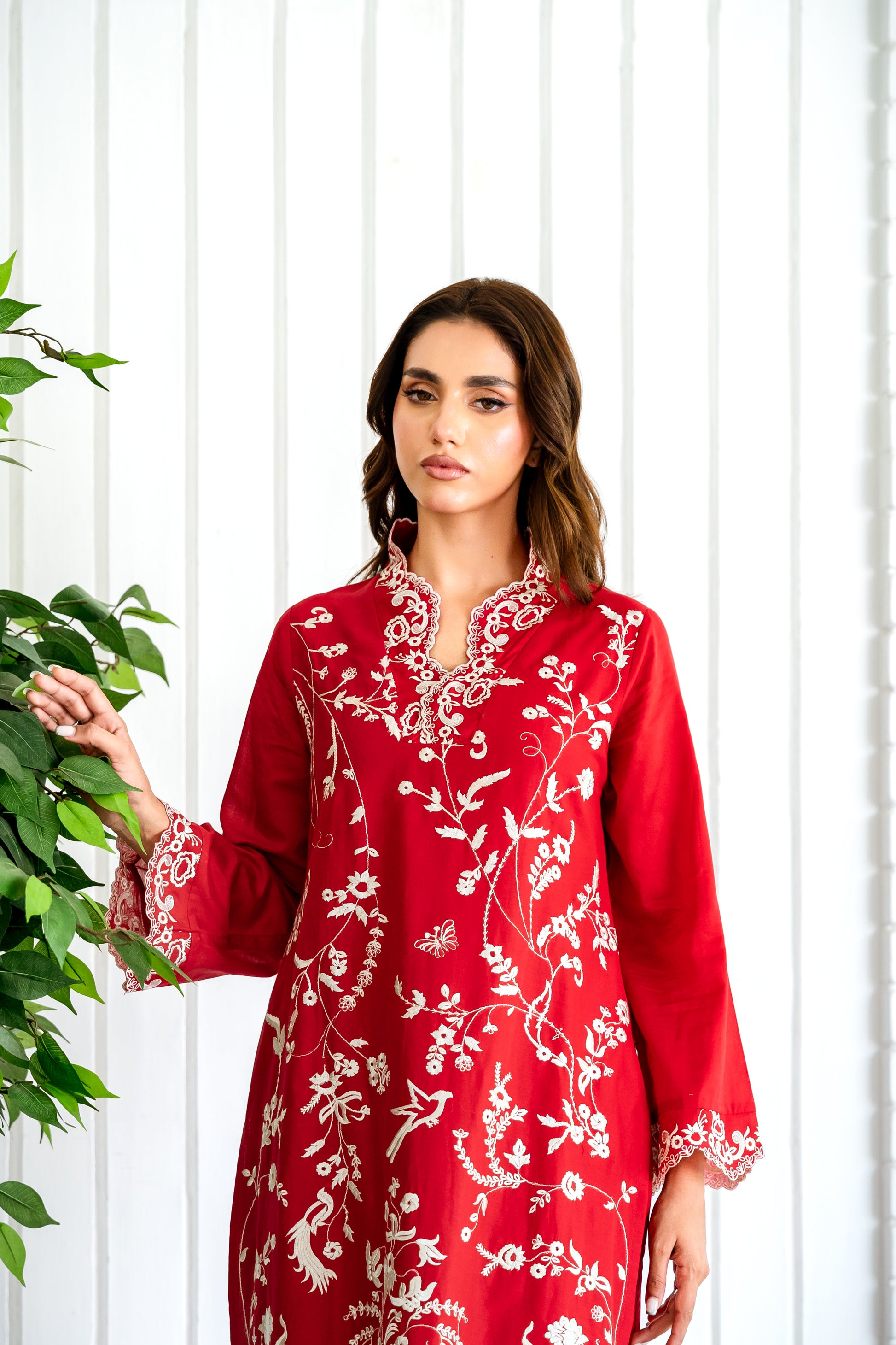 This stunning lawn kurti features nature-inspired embroidery featuring florals, birds, and peacocks, beautifully crafted in ivory resham, and is framed by a delicate border with scalloped edges on the neck, daman and sleeves. Paired with skinny shalwar, this set is available in various colour variations, making it perfect for any occasion in warm weather with it’s lightweight and breathable lawn fabric.