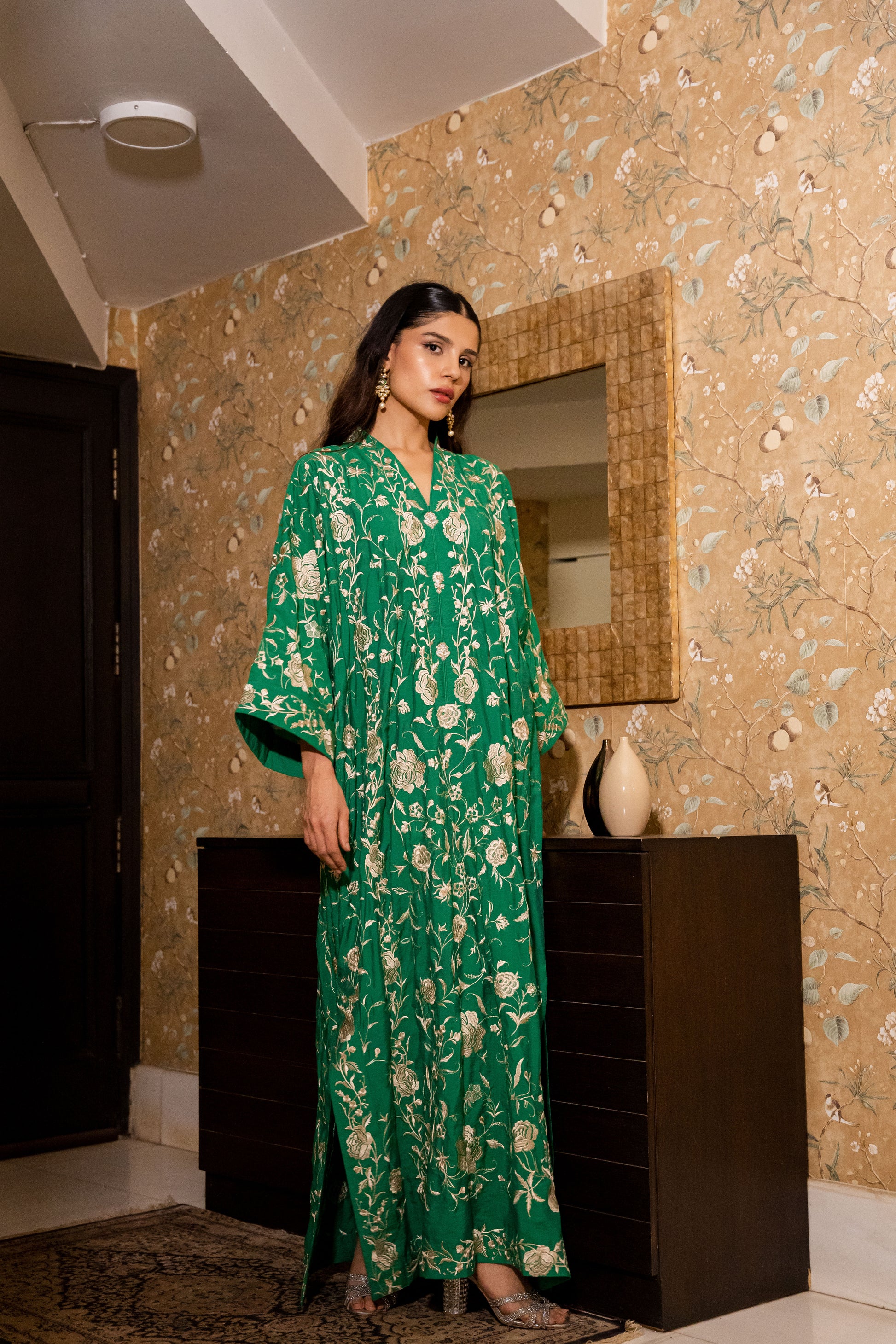 A smouldering dark canvas is offset with fine needlework that takes inspiration from the richly detailed ‘Mantones de Manila’ shawls of Spain. Cut from Pure Silk, this Maxi Kaftan features ivory embroidery on the front, back & sleeves with hand-made buttons detail. The Flamenco Grandé is designed to make an effortless statement.