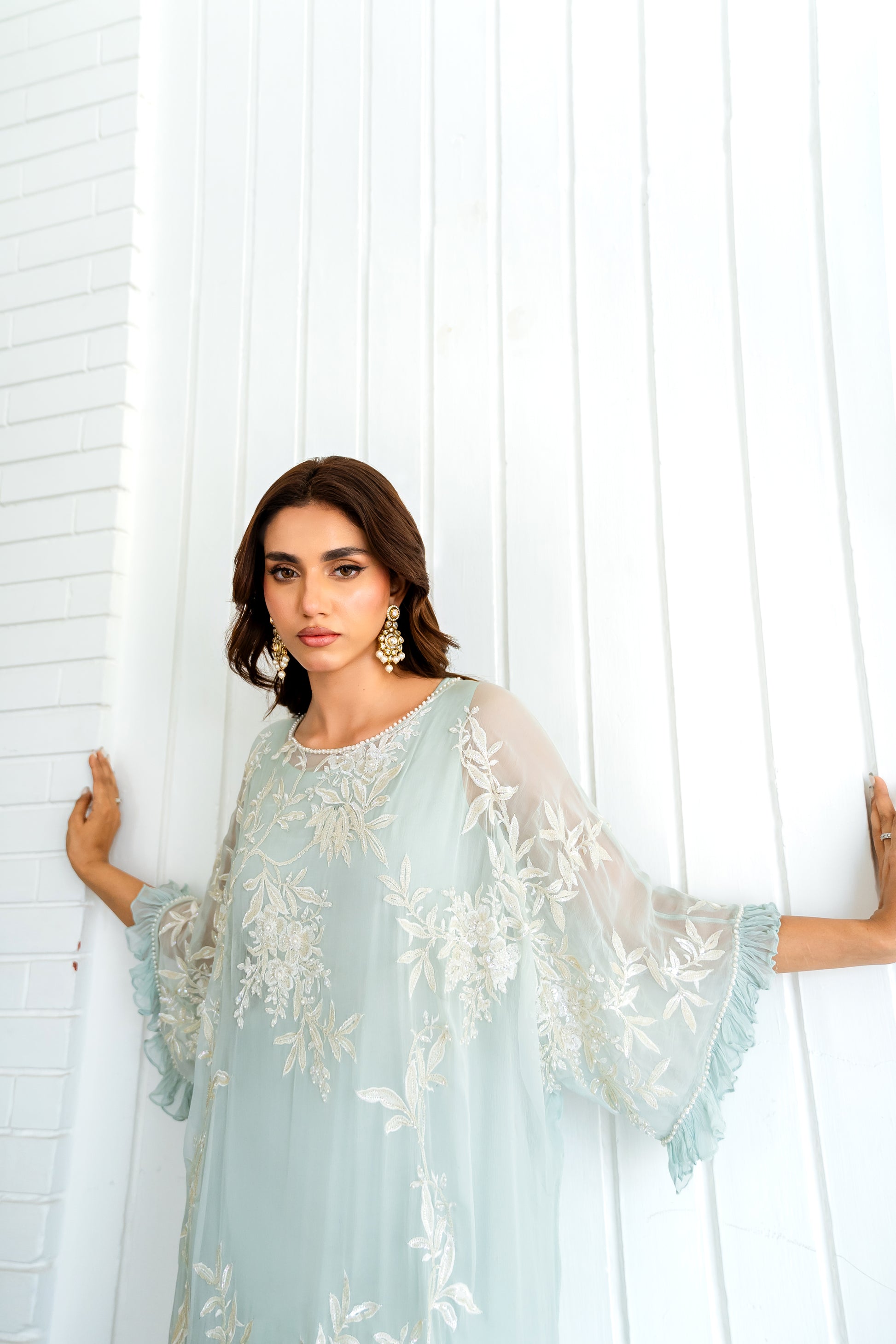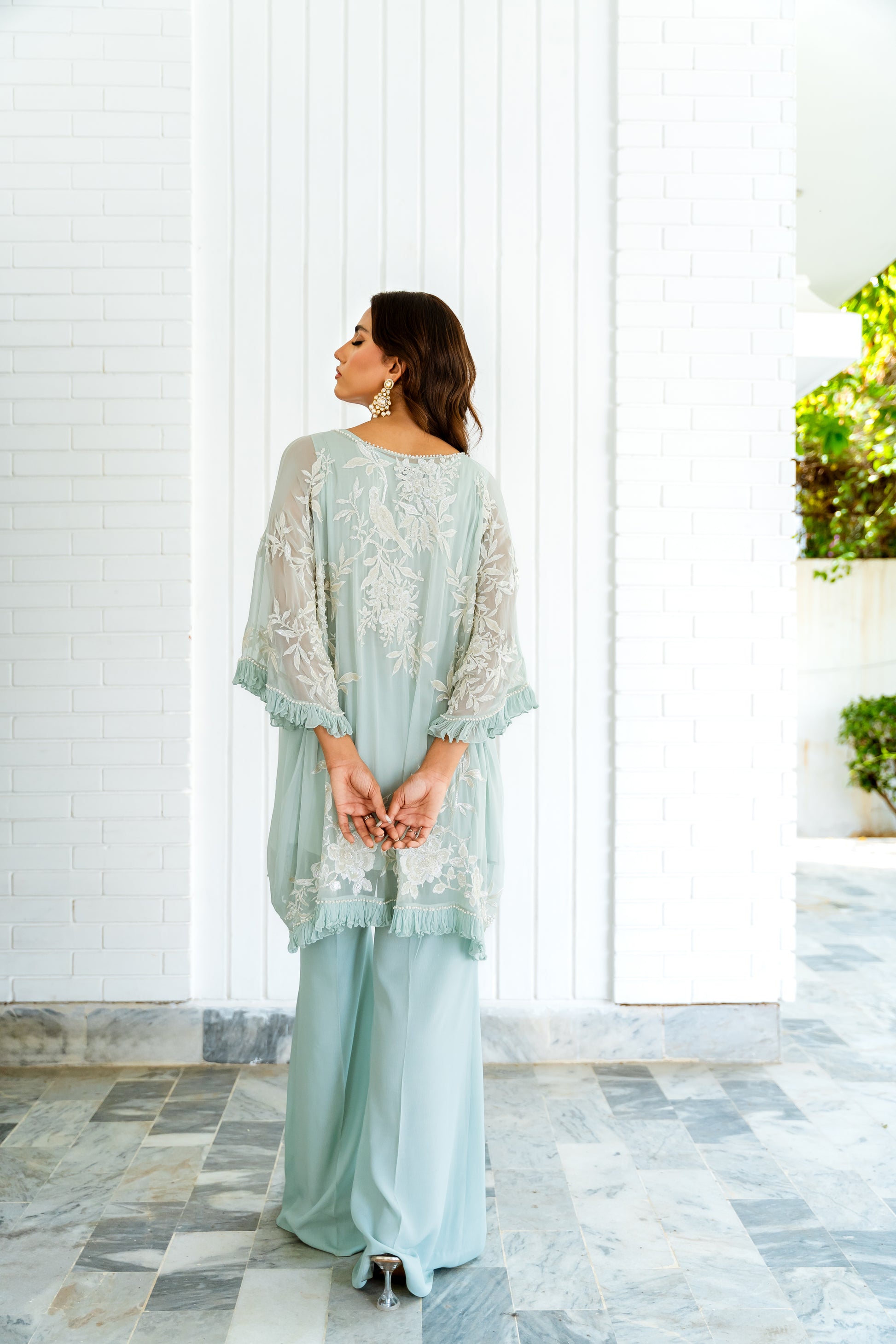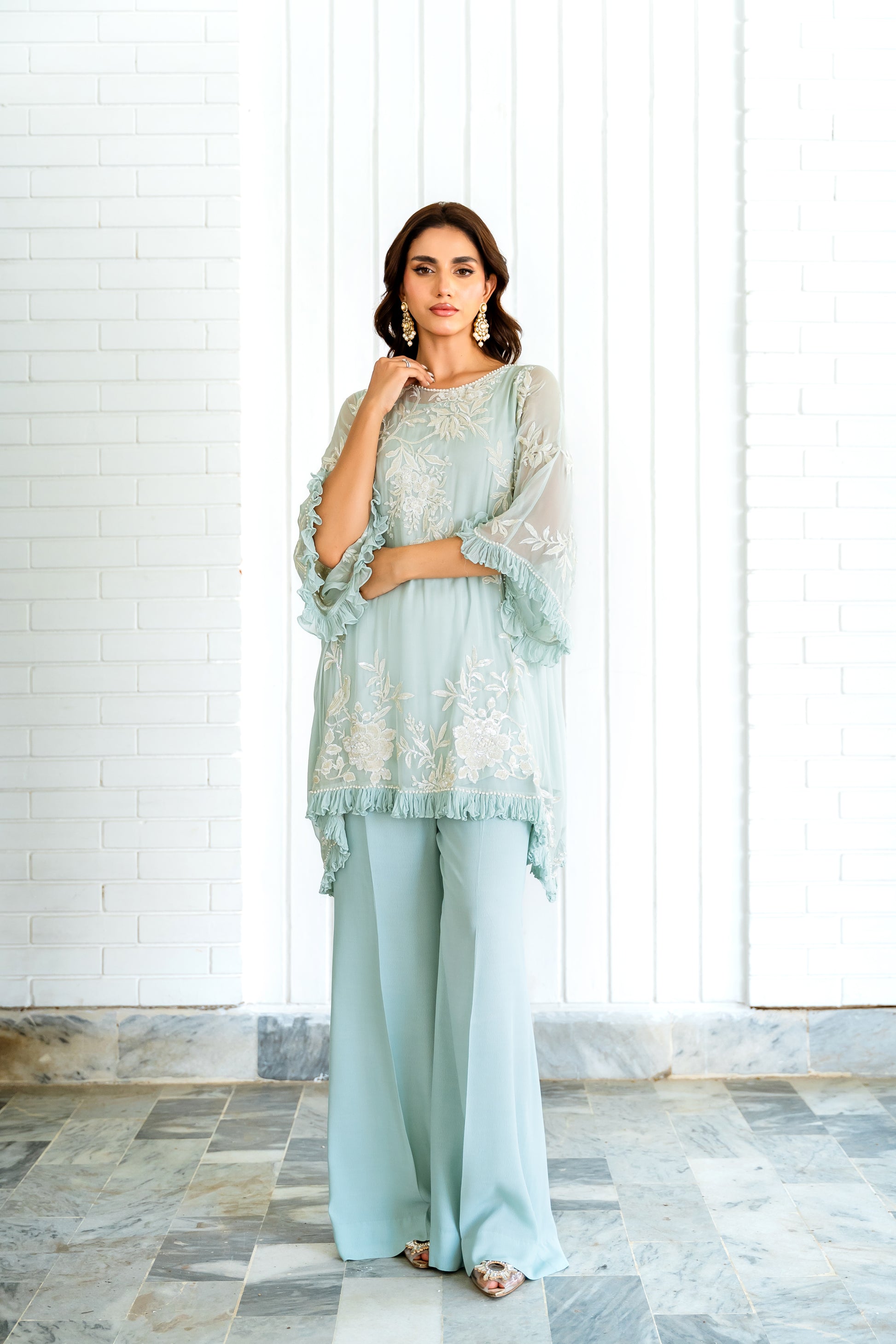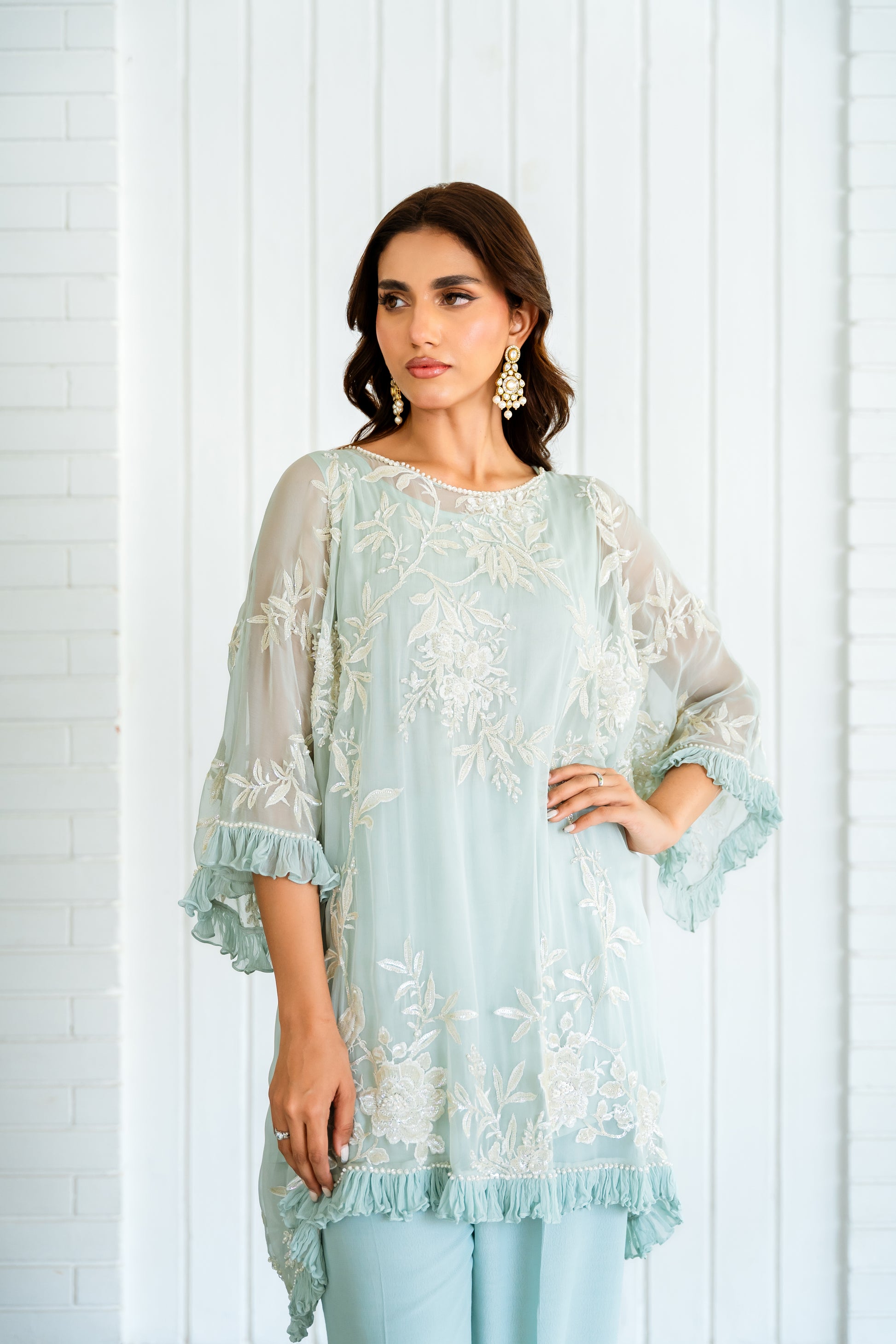 The short top features intricate resham embroidery with a whimsical botanical design, beautifully accentuated with sequins, pearls, and beads.
