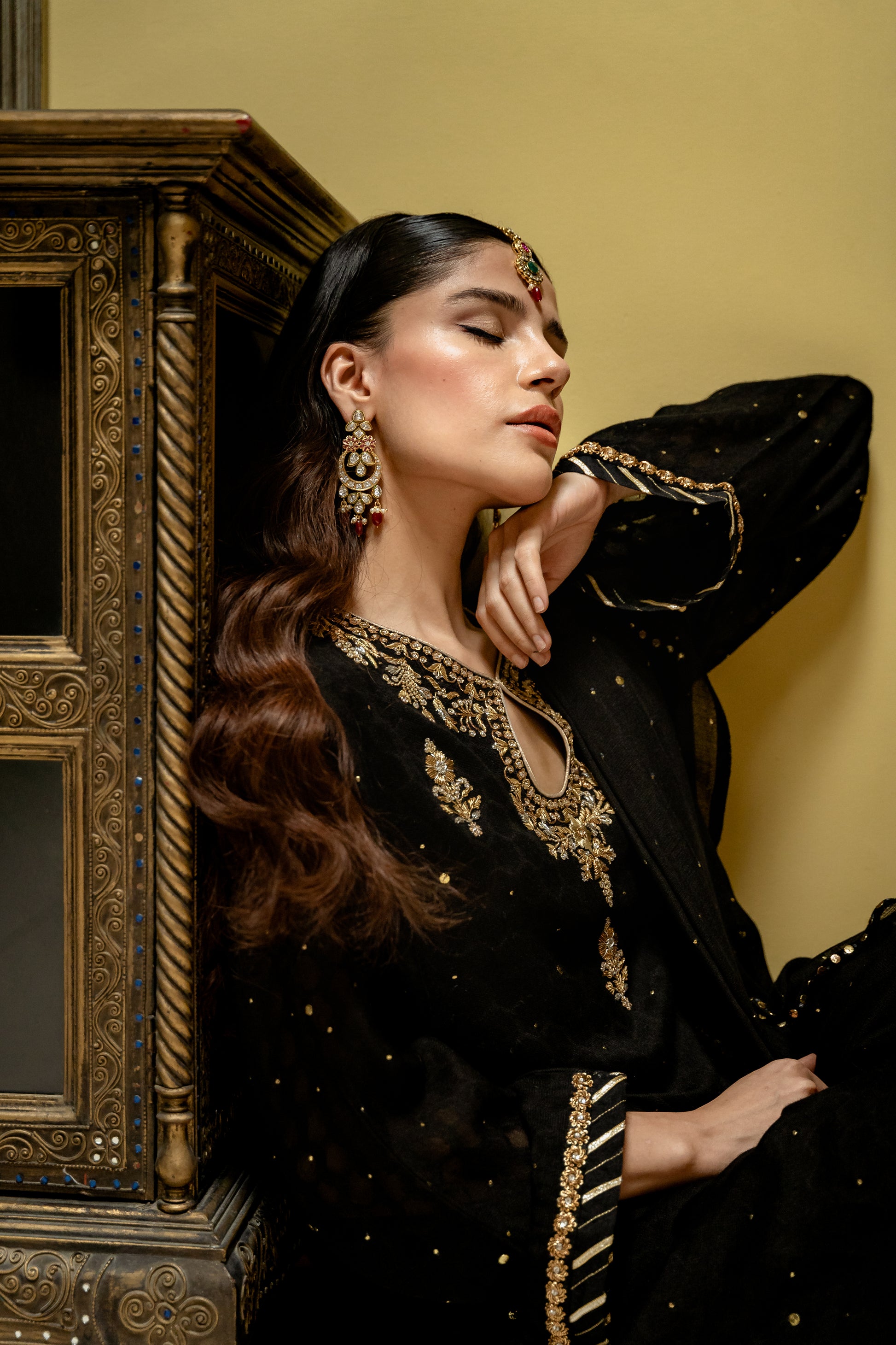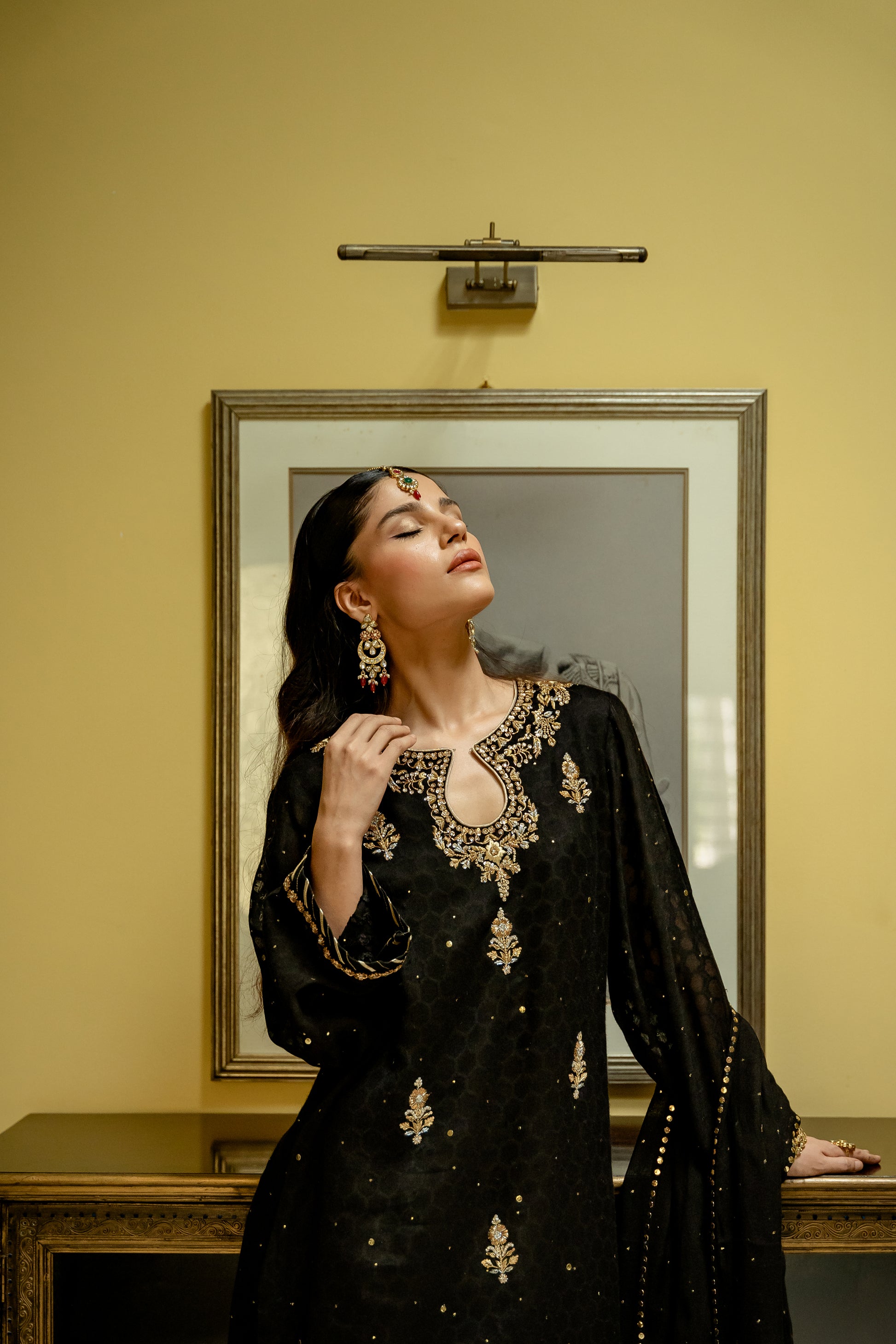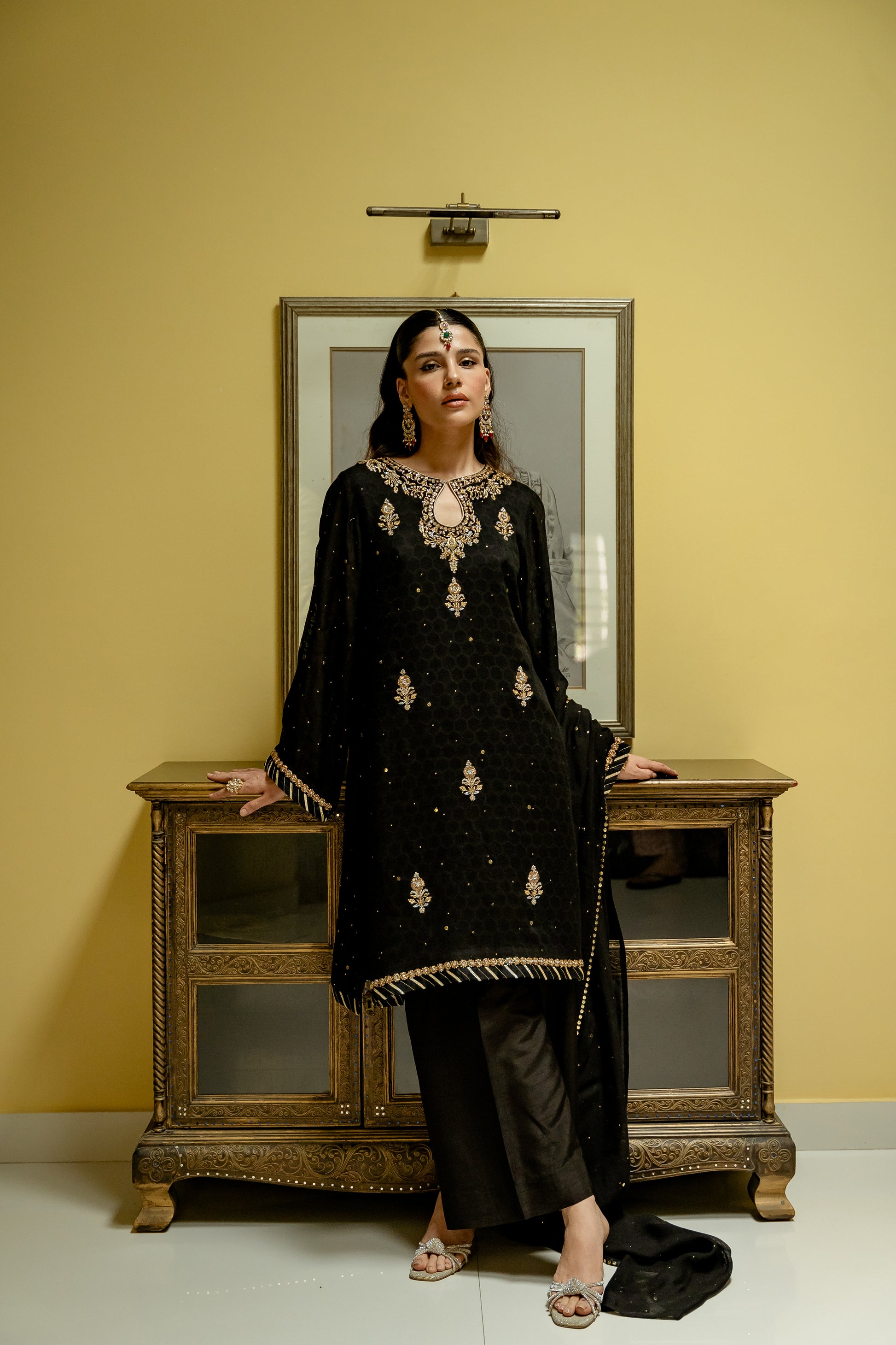 Cut from structured khaddi net, the Gulzar Kurti is crafted using a myriad of