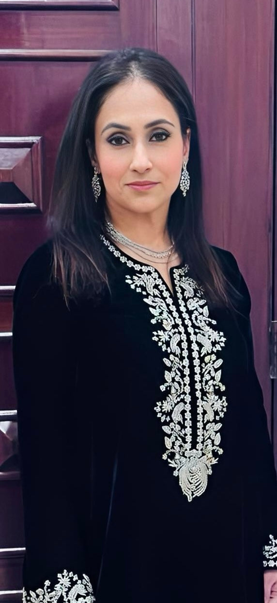 The Interstellar Kaftan exudes timeless bohemian elegance in perfect hues to set your heart aflutter! The relaxed, much loved silhouette has a universally flattering neckline, adorned with delicate floral border featuring silver & gold elements using dabka, nakshi, sequins, kasab & jewels accents. Cut from flowy premium velvet, it is designed for a forgiving loose fit, making it a universally flattering evening choice.