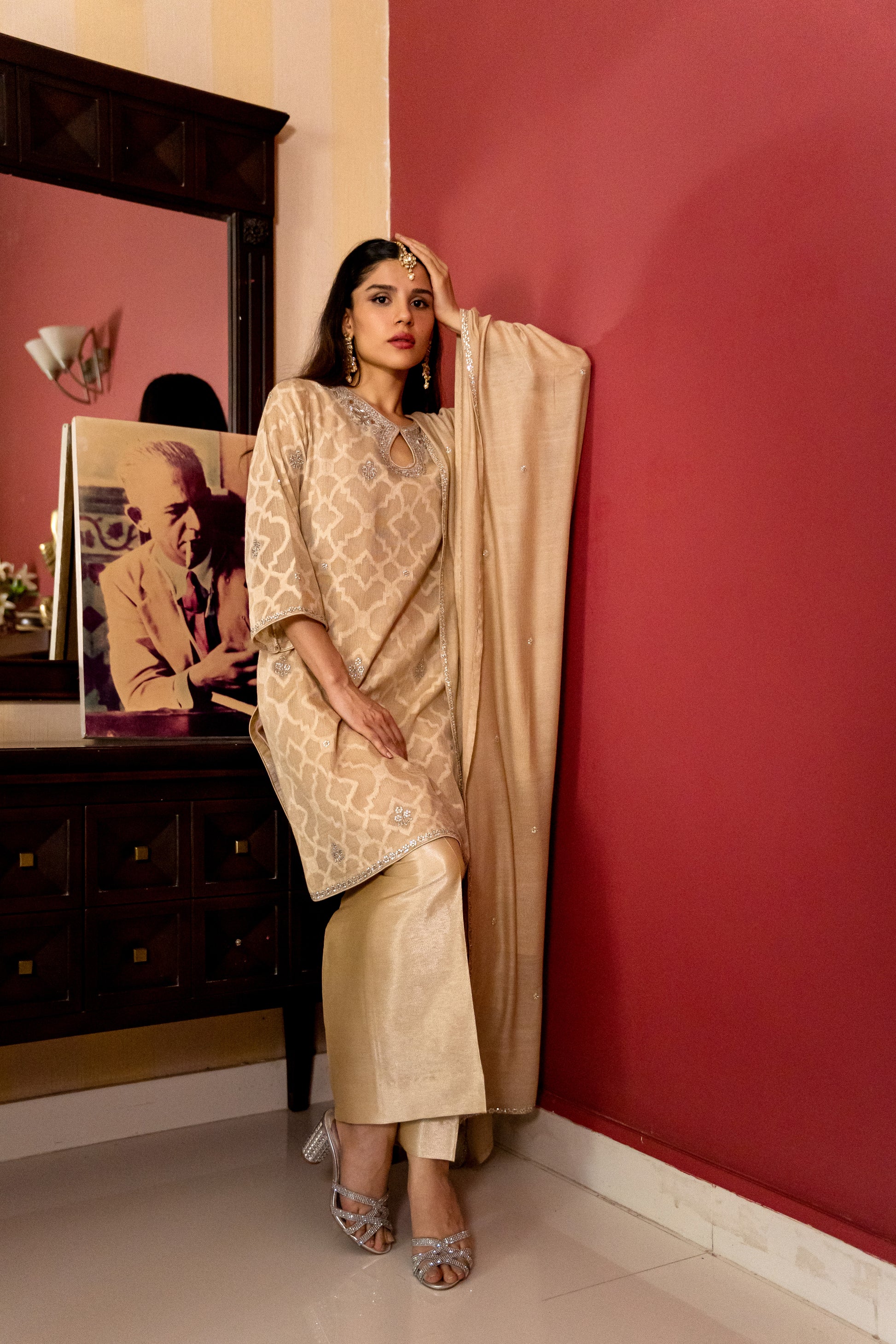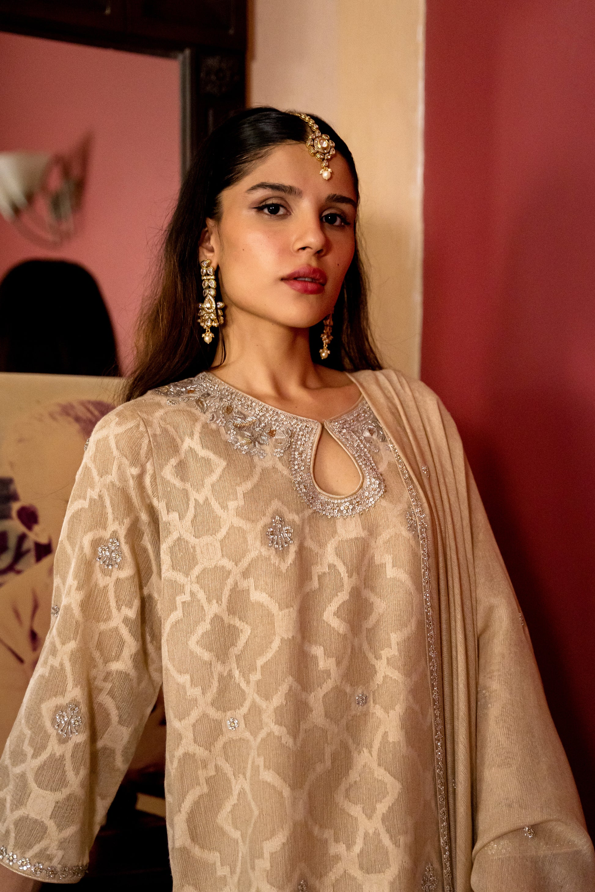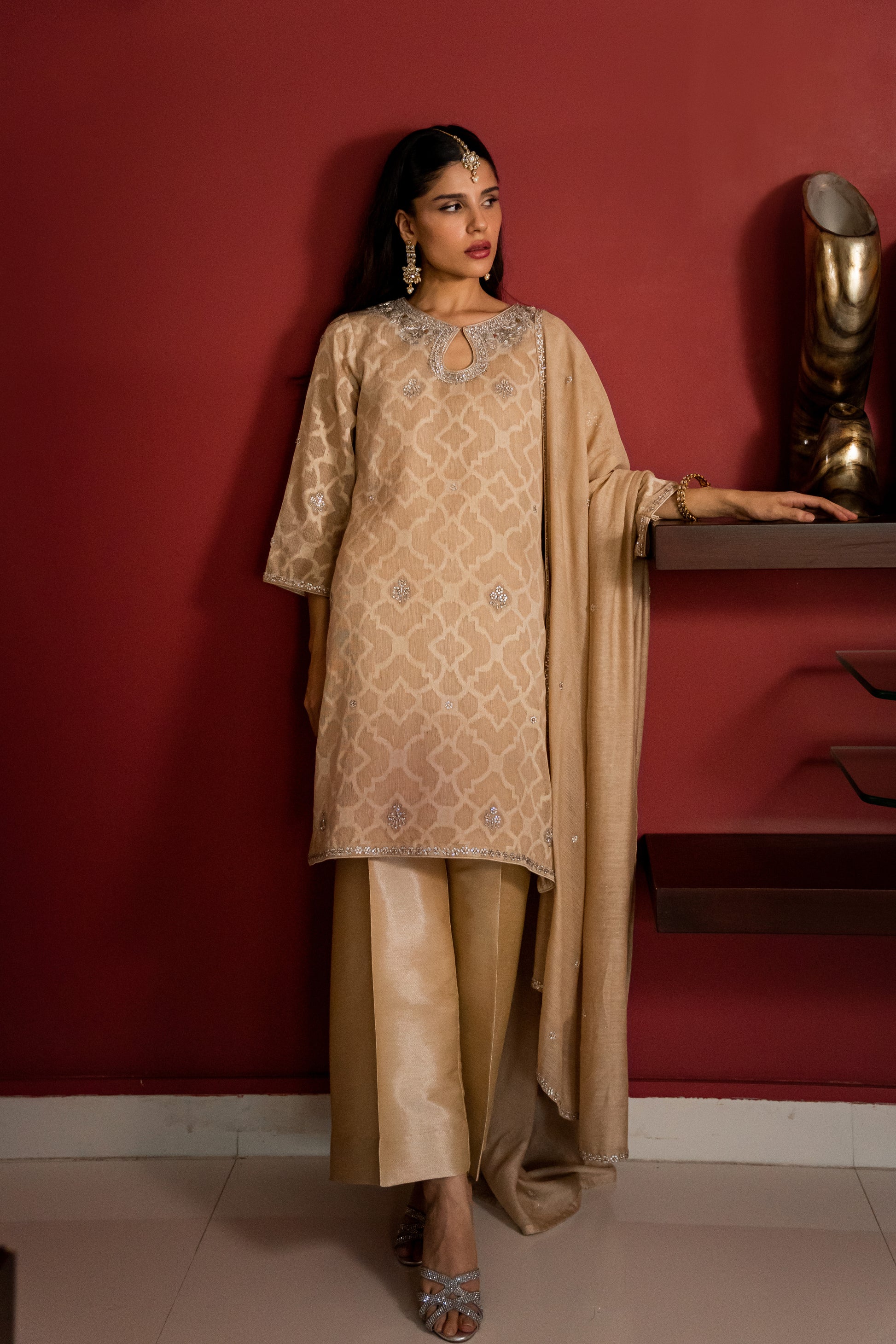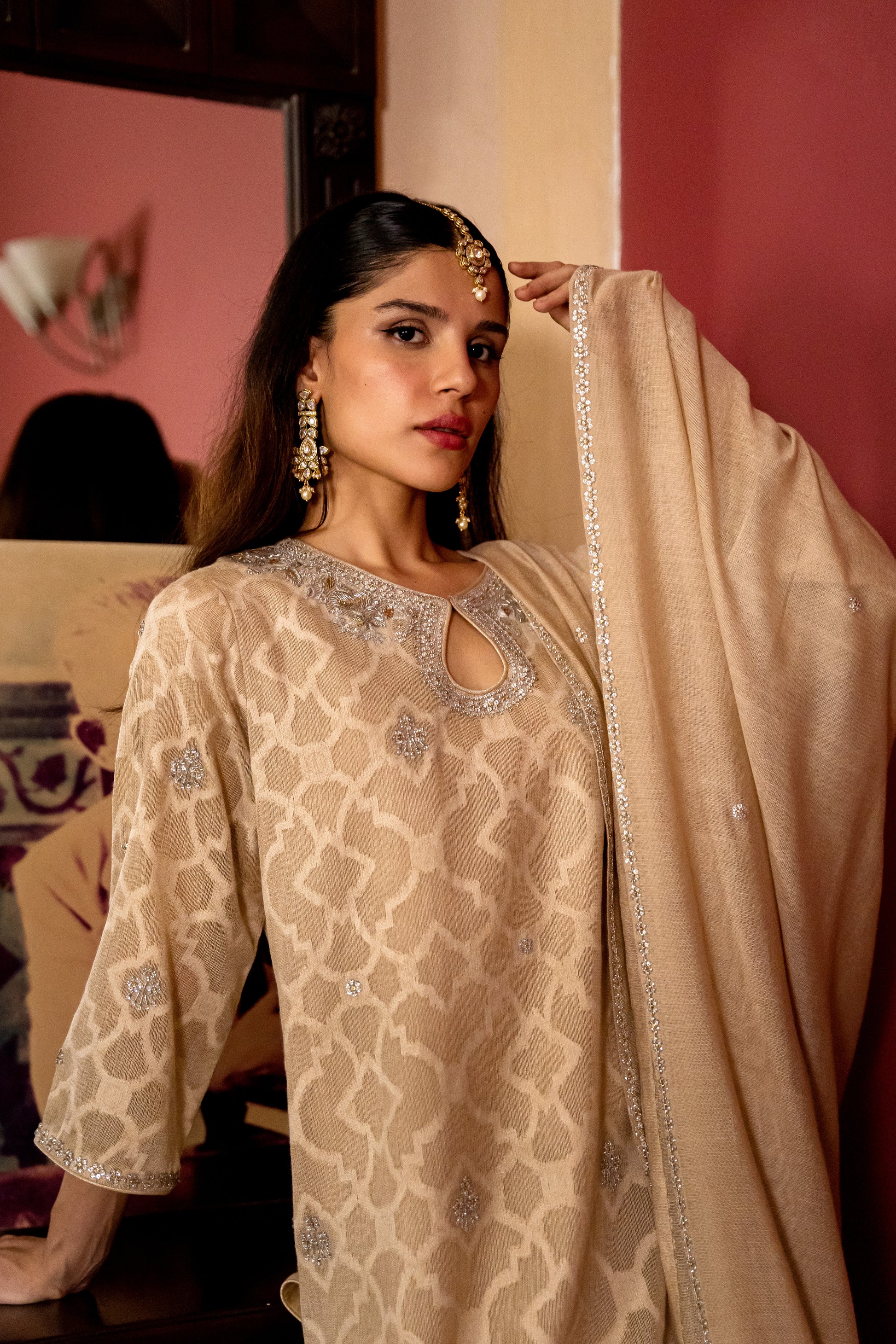 Paired with matching silk pants & pure khaddi net dupatta, beautifully worked with silver & gold jewel border & motifs.