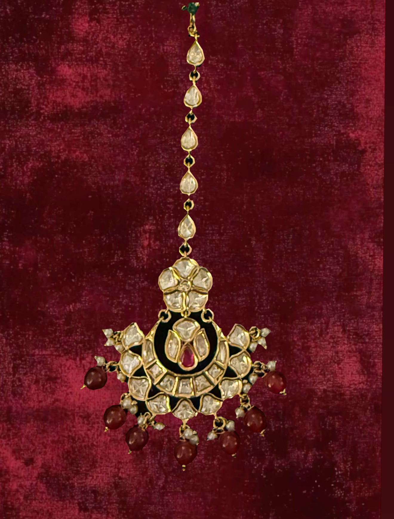 Elevate your wardrobe with the LUNA TIKA, a stunning KUNDAN (VILANDI) TIKA featuring a GOLDEN POLISH on a COPPER base and available in striking RUBY (RANI- RED). Store it in a sealed bag and avoid exposure to liquids and perfume spray for optimal maintenance. Expertly crafted for a flawless finish.