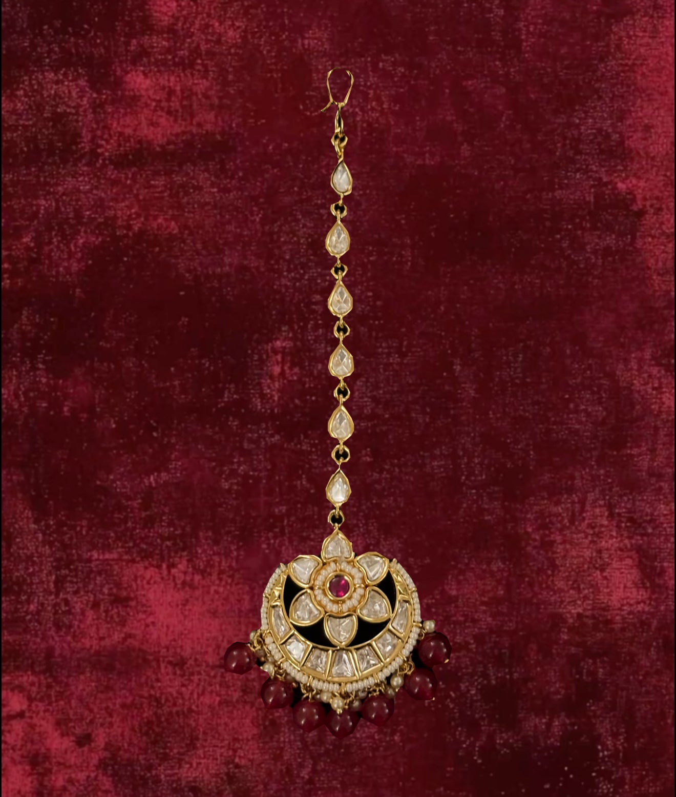 Elevate your wardrobe with the MAH-E-GULZAR TIKA, a stunning KUNDAN (VILANDI) TIKA featuring a GOLDEN POLISH on a COPPER base and available in striking RUBY (RANI- RED). Store it in a sealed bag and avoid exposure to liquids and perfume spray for optimal maintenance. Expertly crafted for a flawless finish.