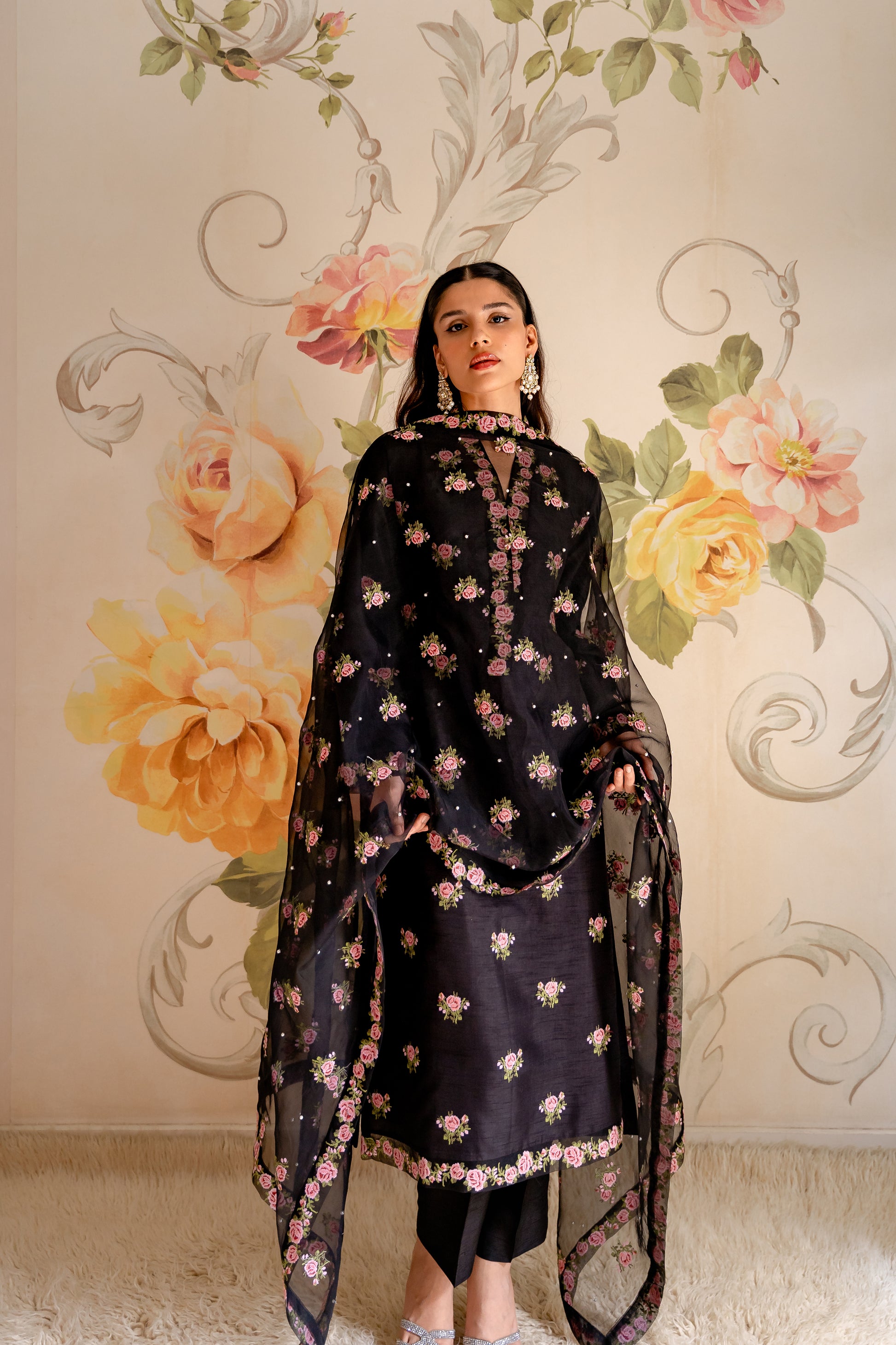 Crafted from organza, the Miniflora Dupatta features delicate cross stitch motifs & border with pearl chan detail.