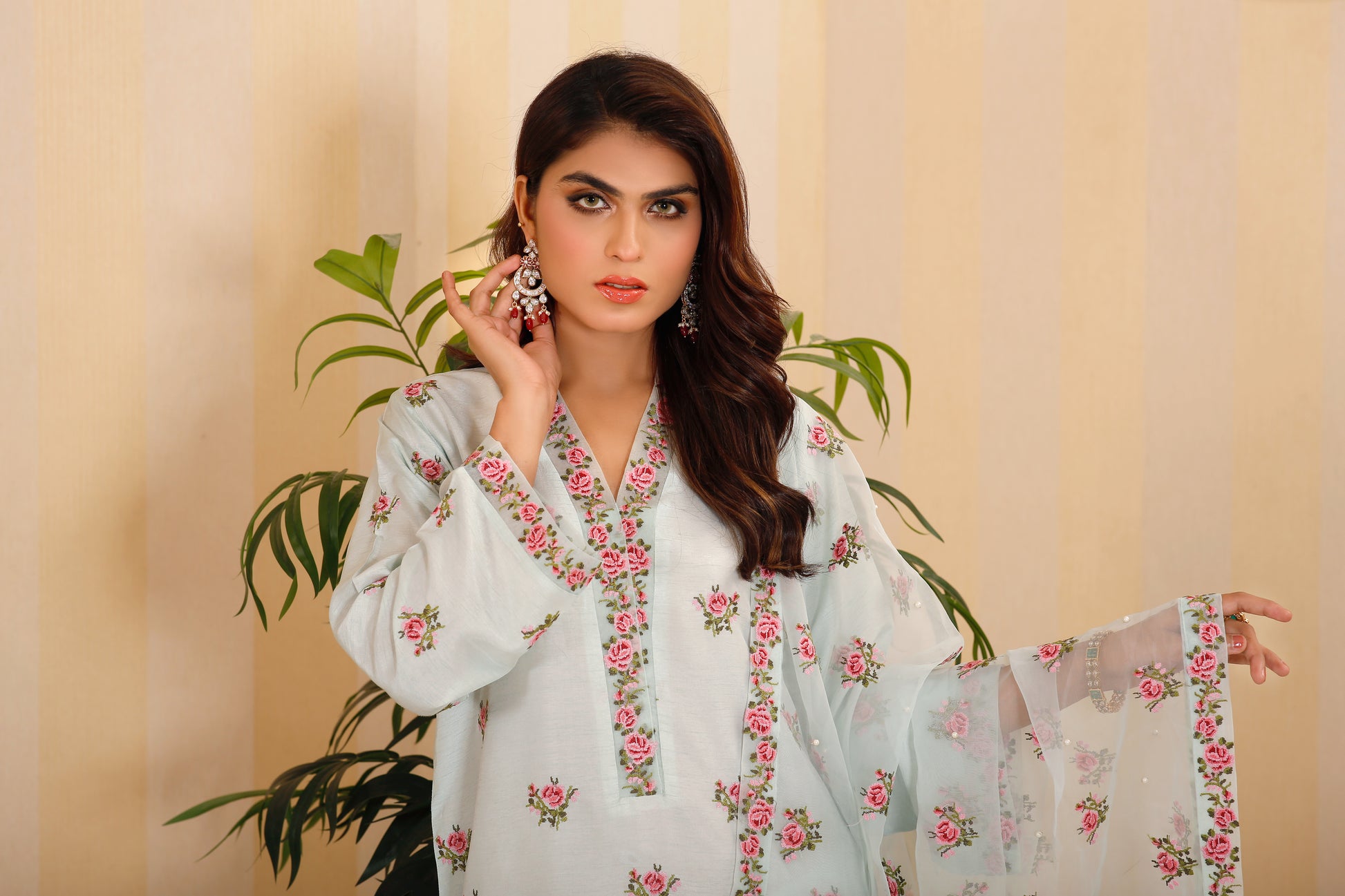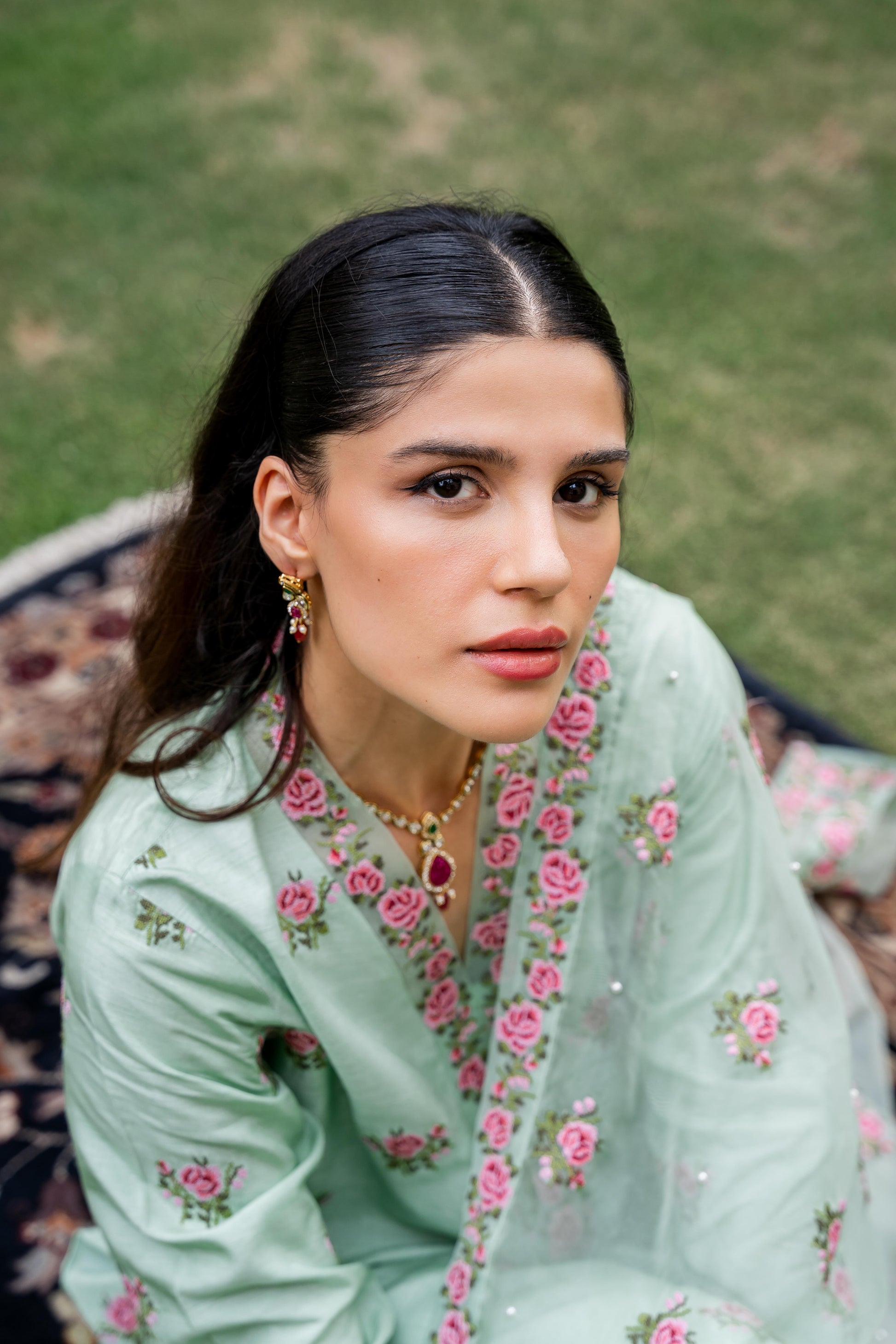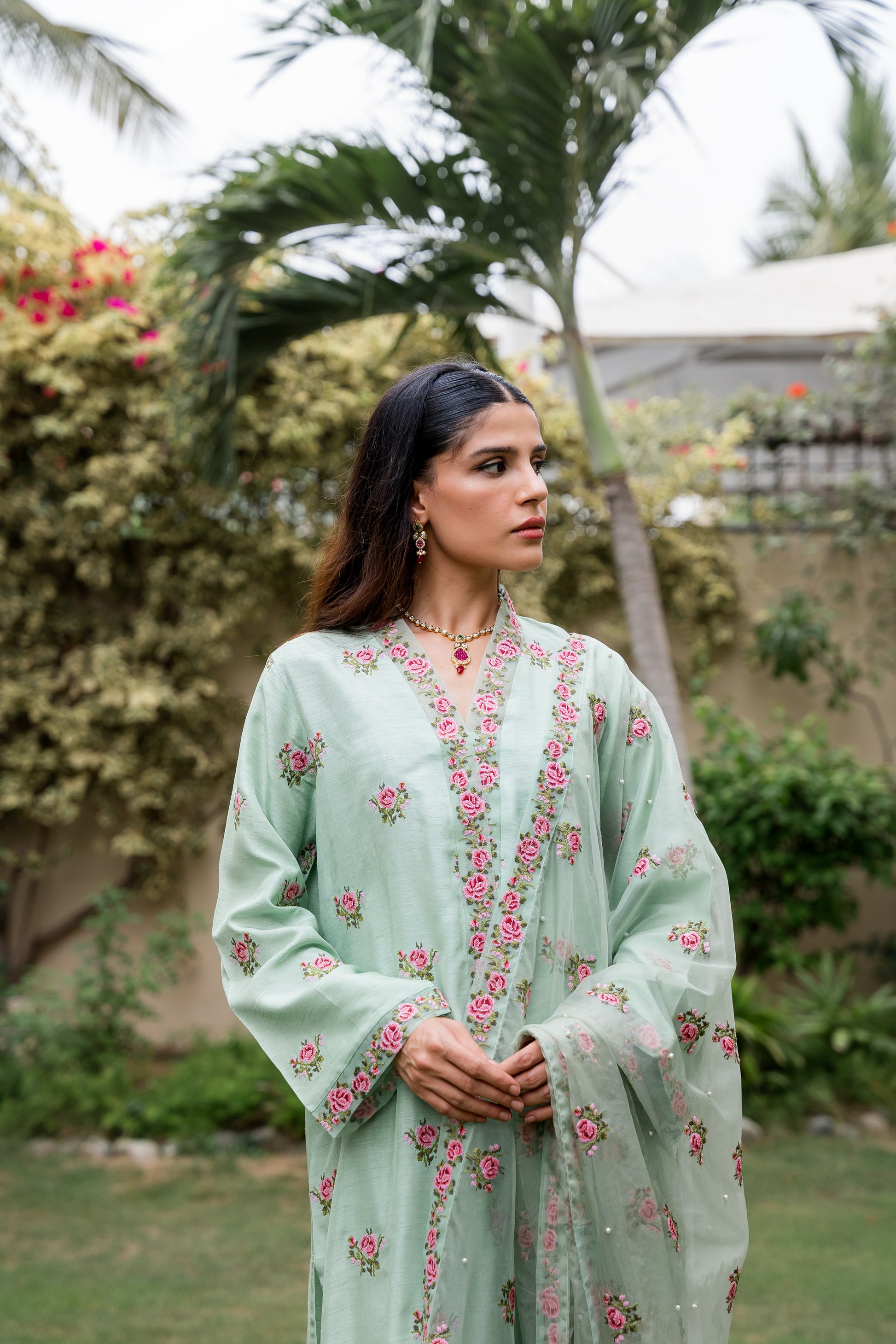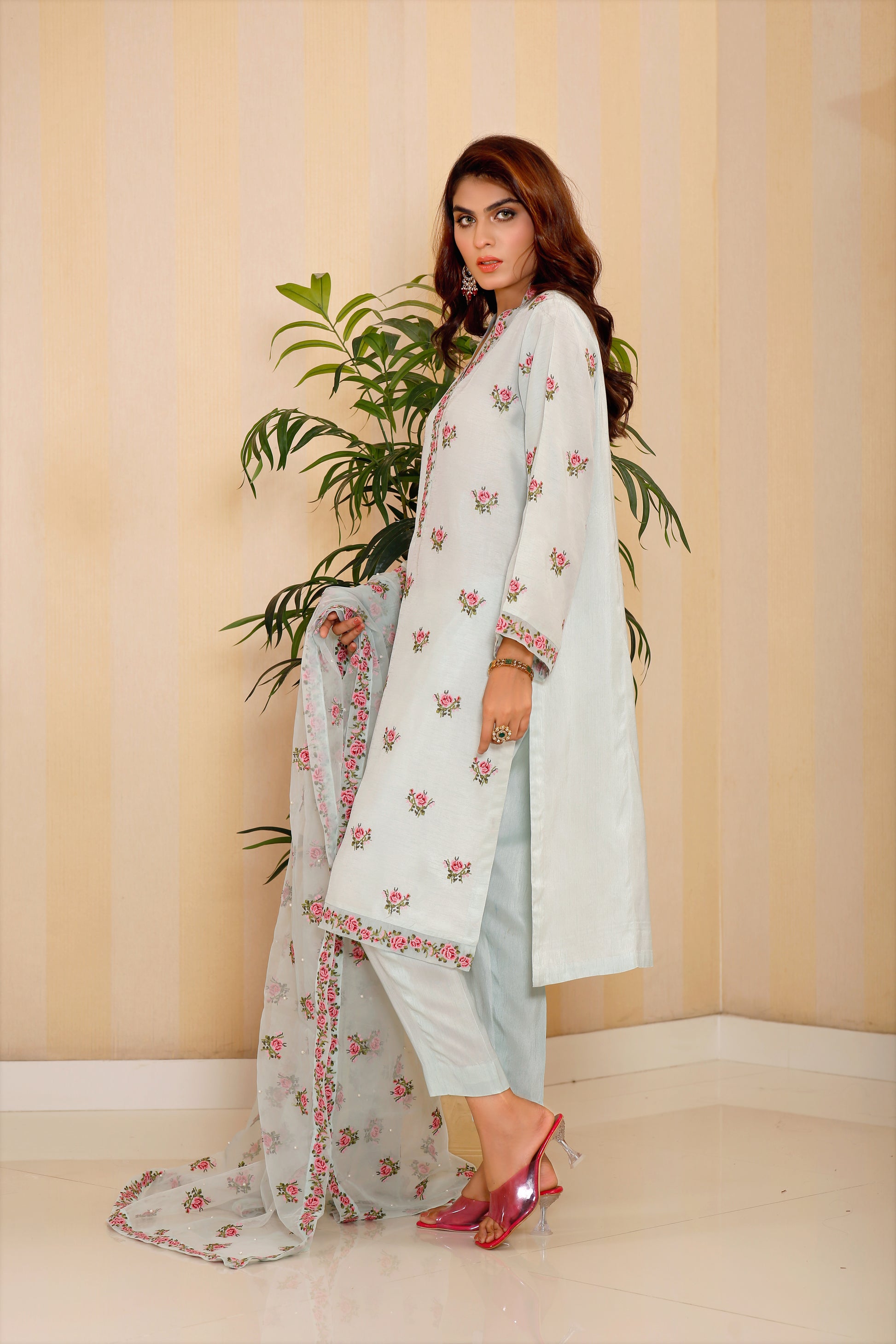 Crafted from luxurious Pakistani raw silk, the Miniflora kurti showcases vibrant multicolour cross-stitch motifs and intricate embroidered borders adorning the neck, hem, and sleeves. Complete with matching pants, this stunning set is a must-have for the new season, offering a chic and polished look for any occasion.