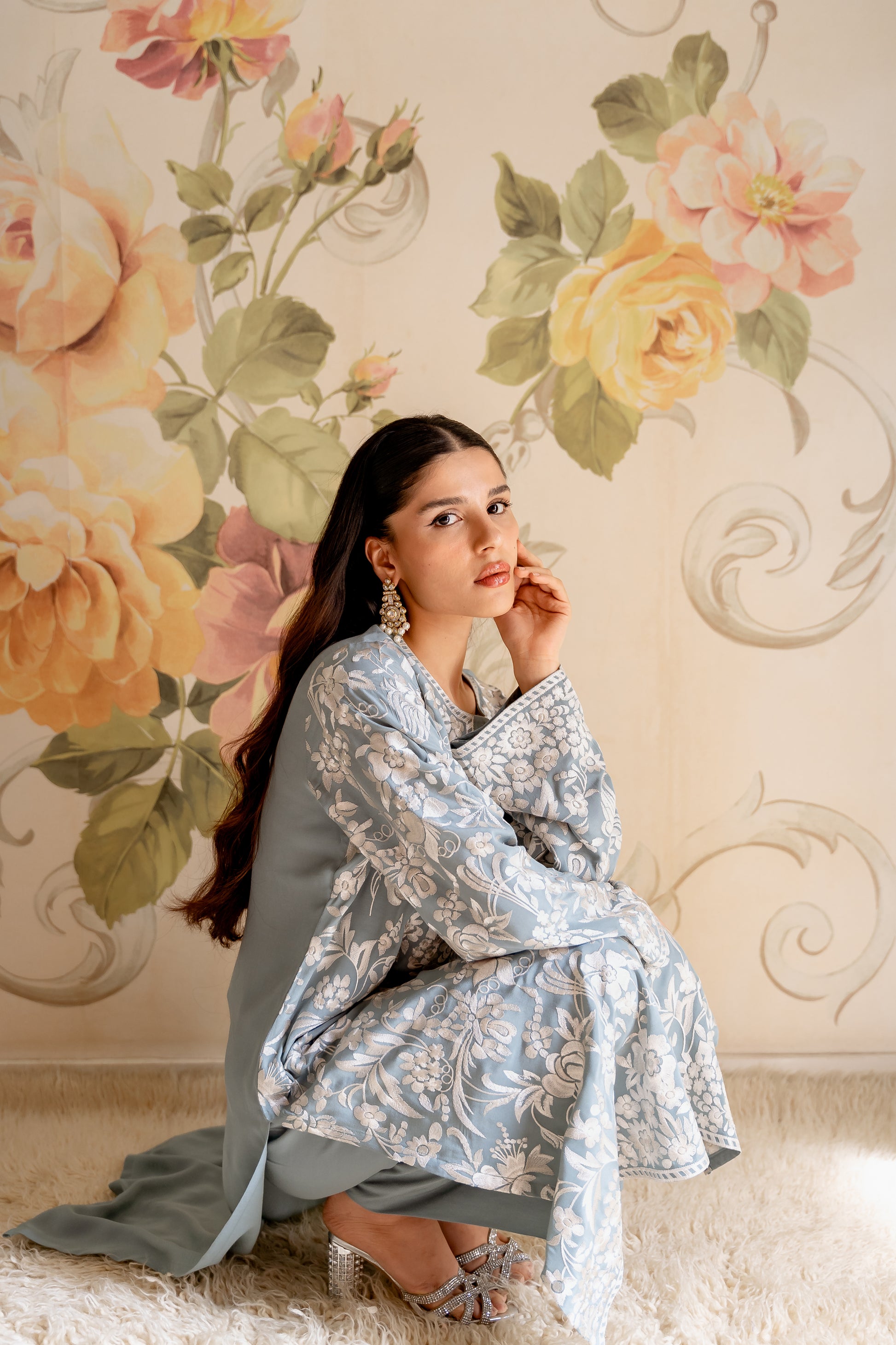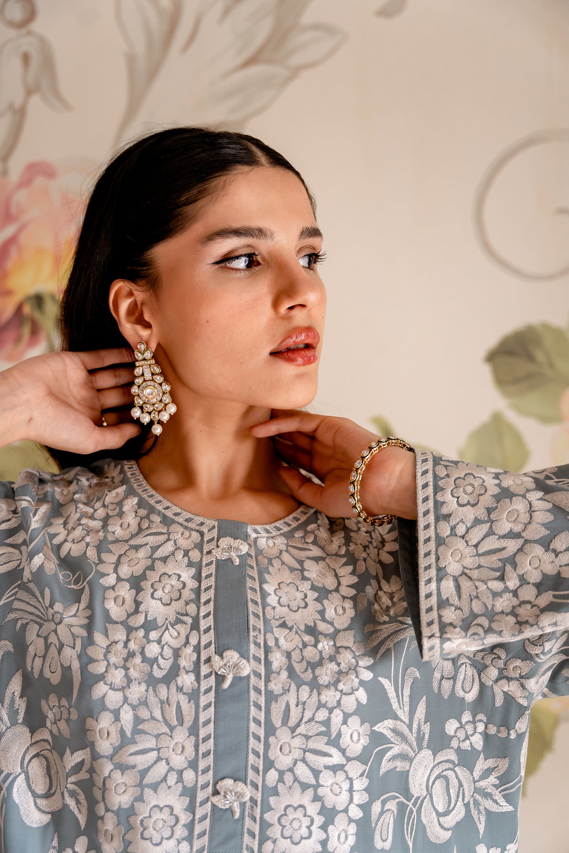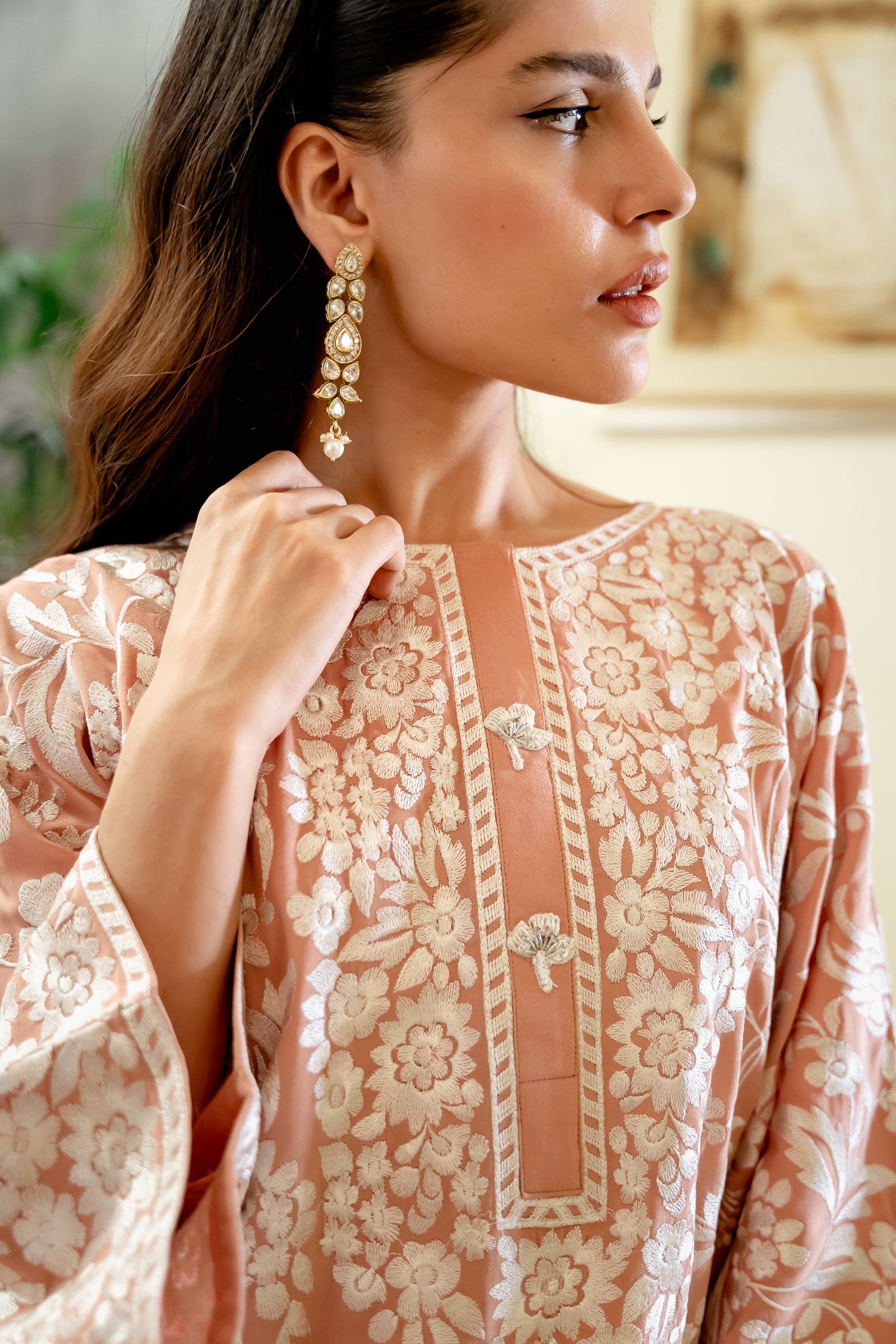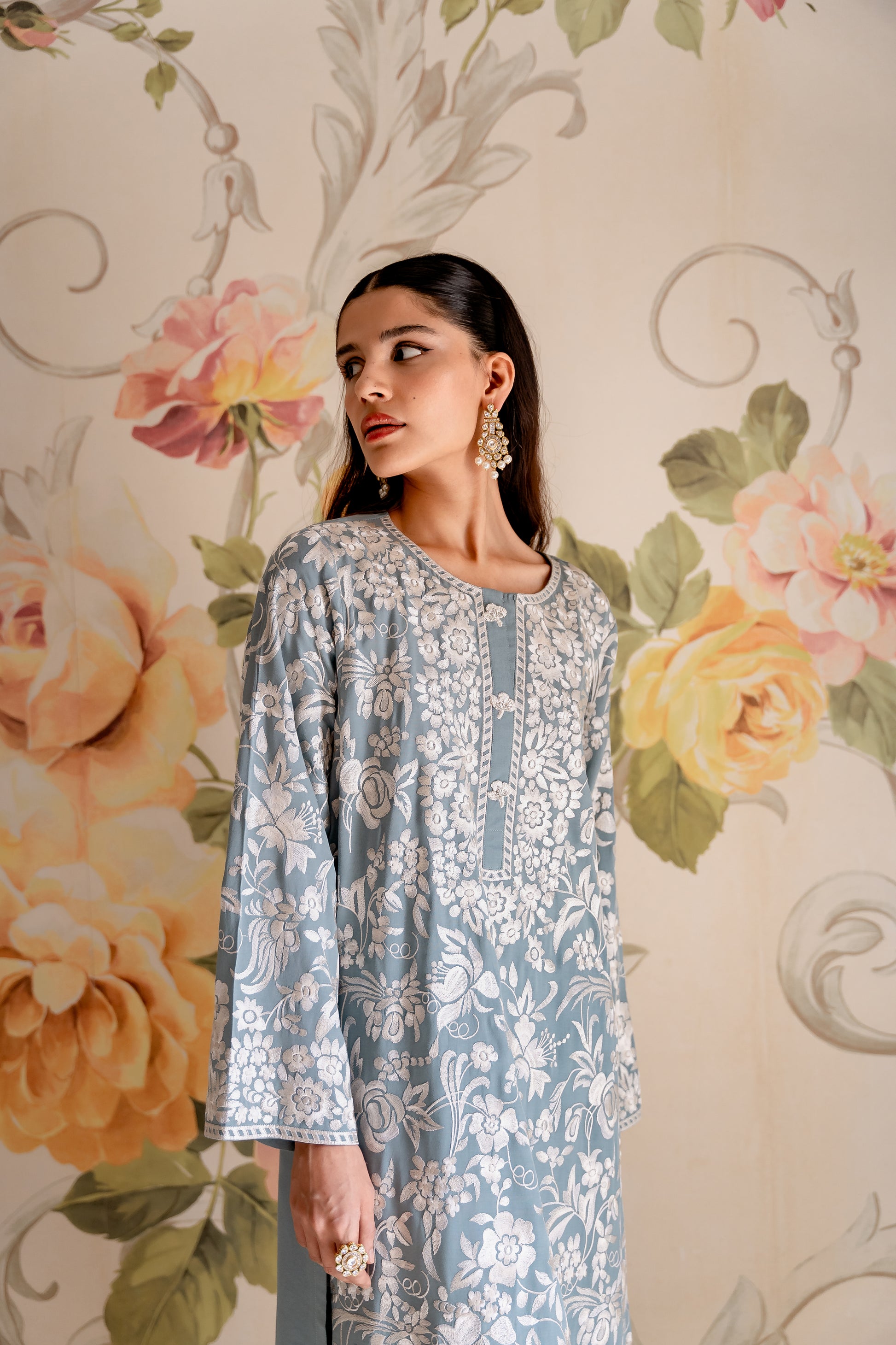The long top is styled with loose fit Ezaar to make an effortless statement.