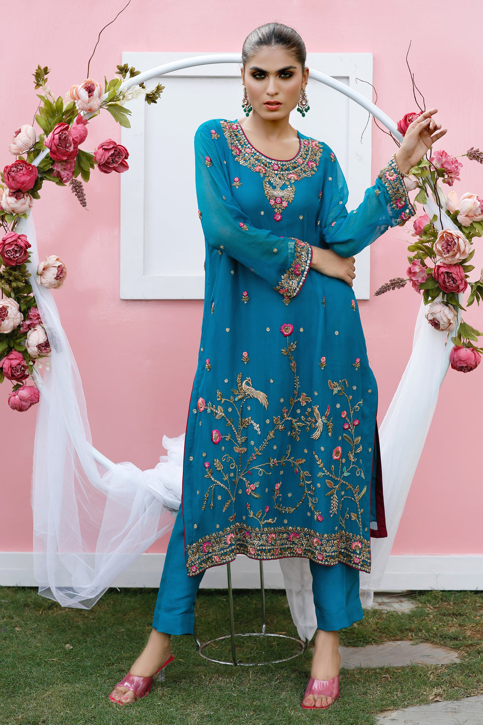 The Nur e Hayat ensemble exudes timeless elegance featuring fine quality needlecraft to create looks that are steeped in old-world charm. Tailored from pure chiffon