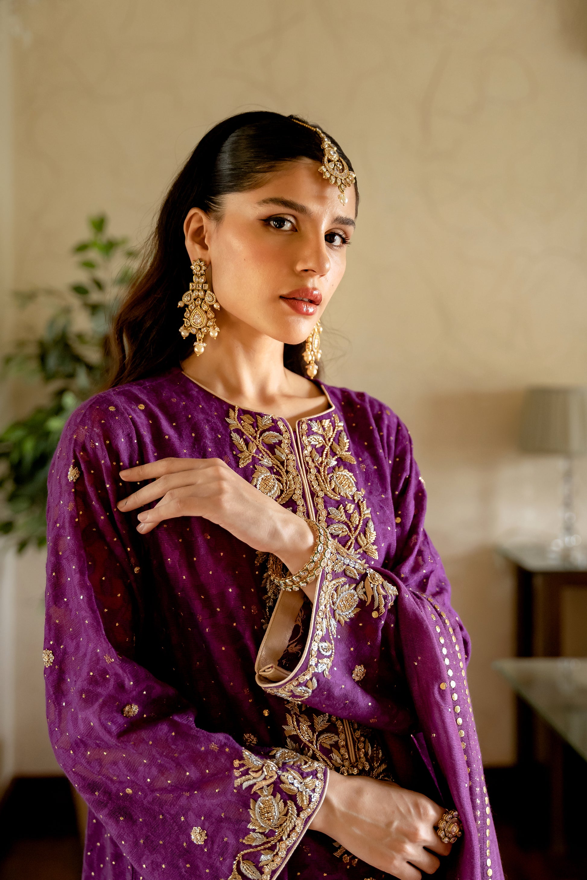 Purple Reign is rendered in a striking shade of purple with fine quality needlecraft in antique gold & silver zardozi embroidered borders & motifs with dispersed gold kamdani. It is paired with a pure khaddi net dupatta with kamdani borders & chan & matching silk ejaar. This piece is a perfect addition to your festive armoire.