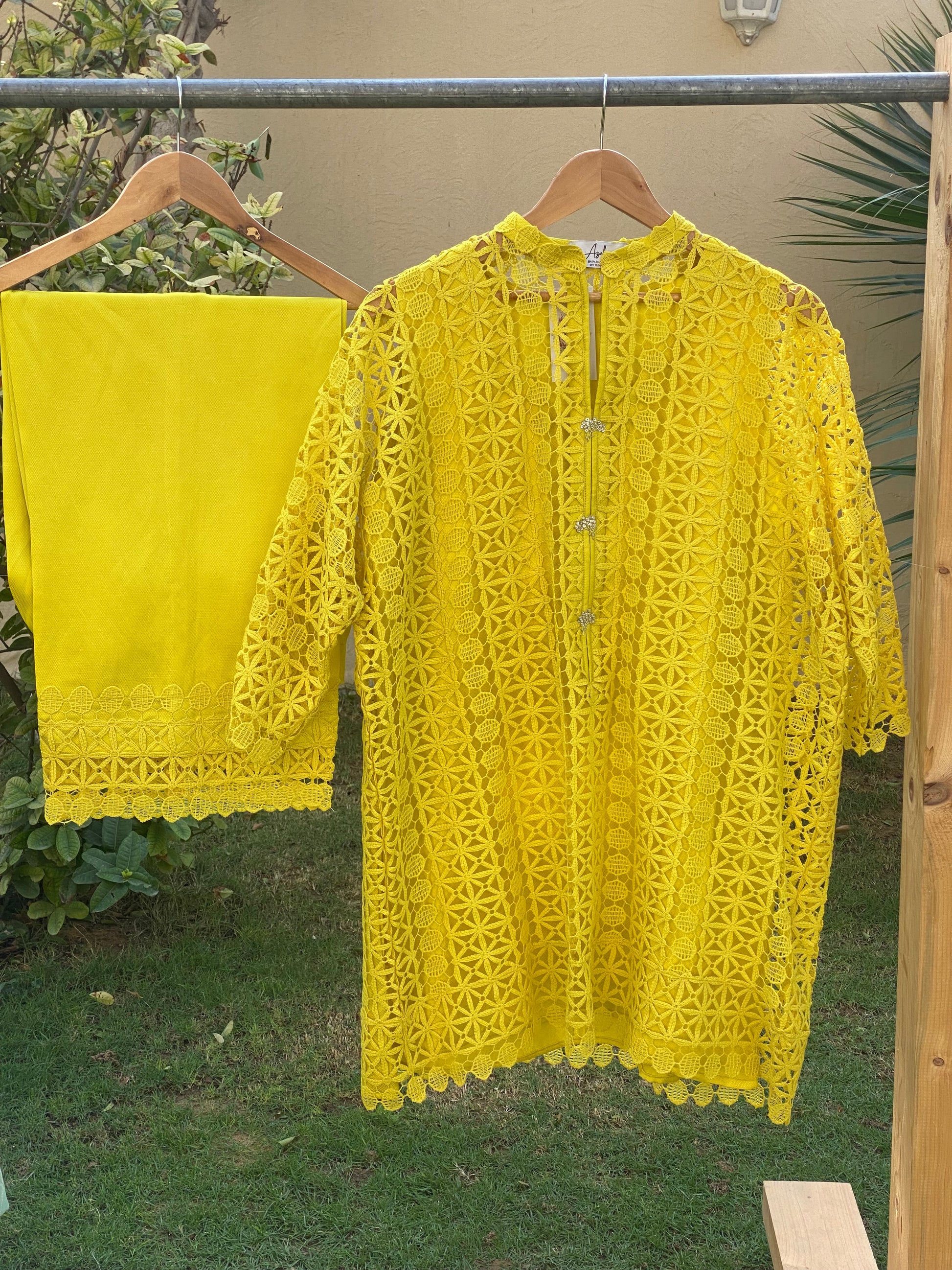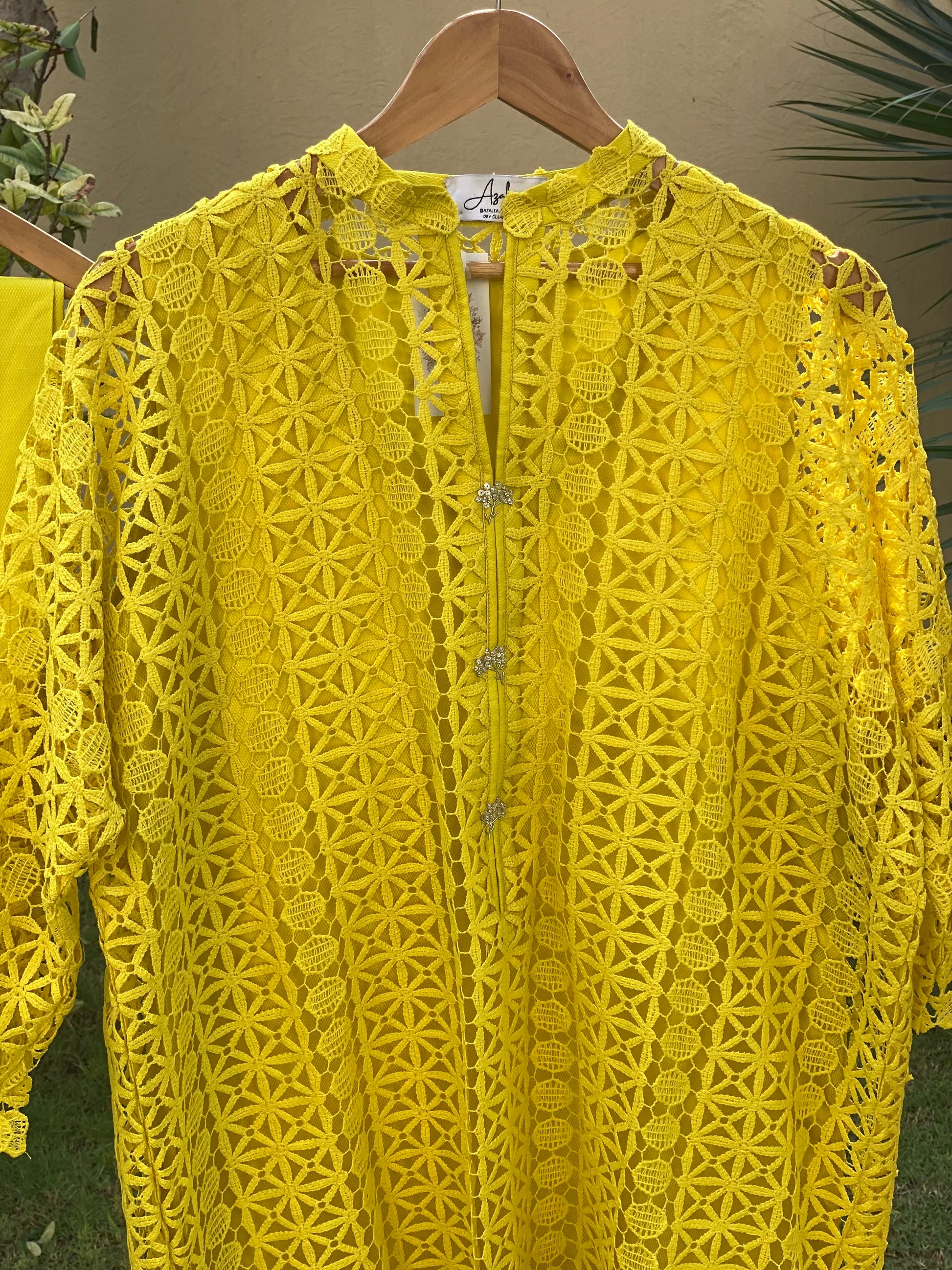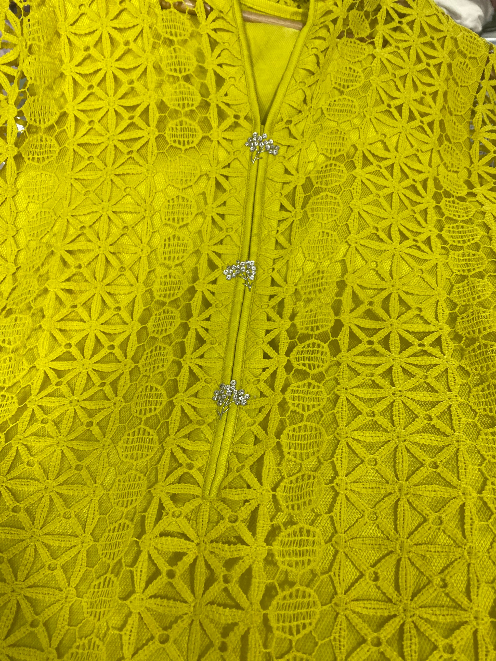 embellished with hand-made buttons on the neck pati with cutwork detail on the collar, daman &