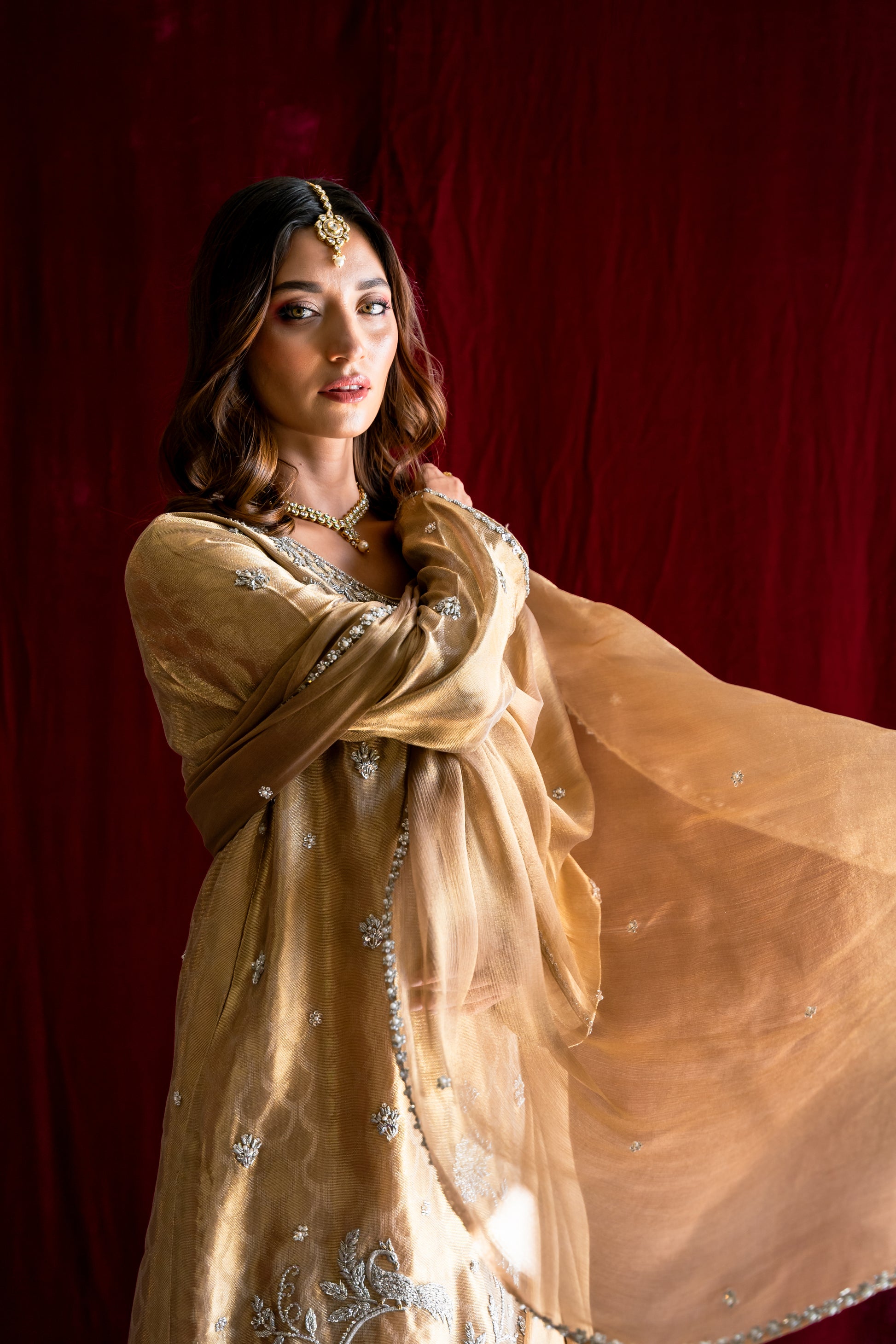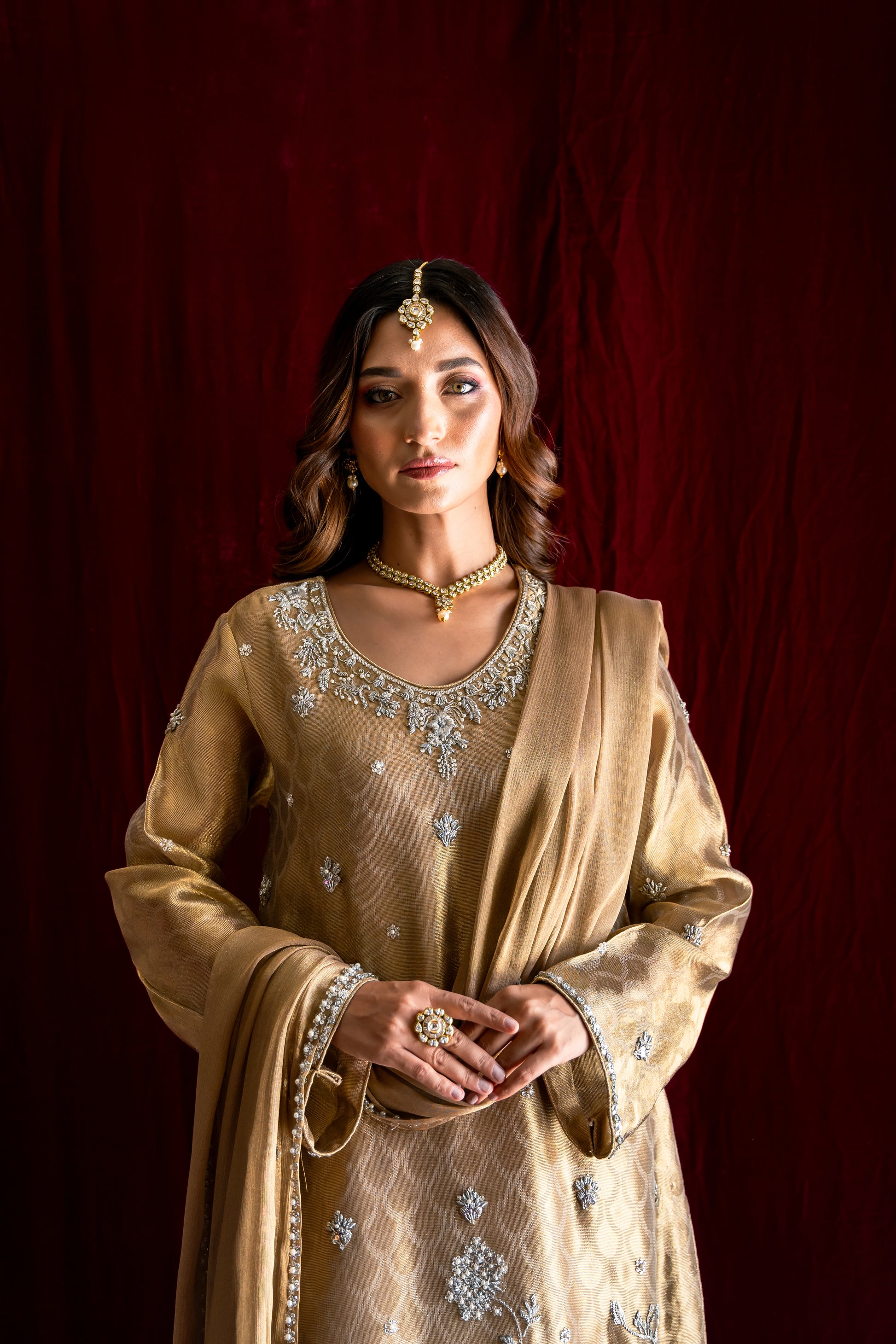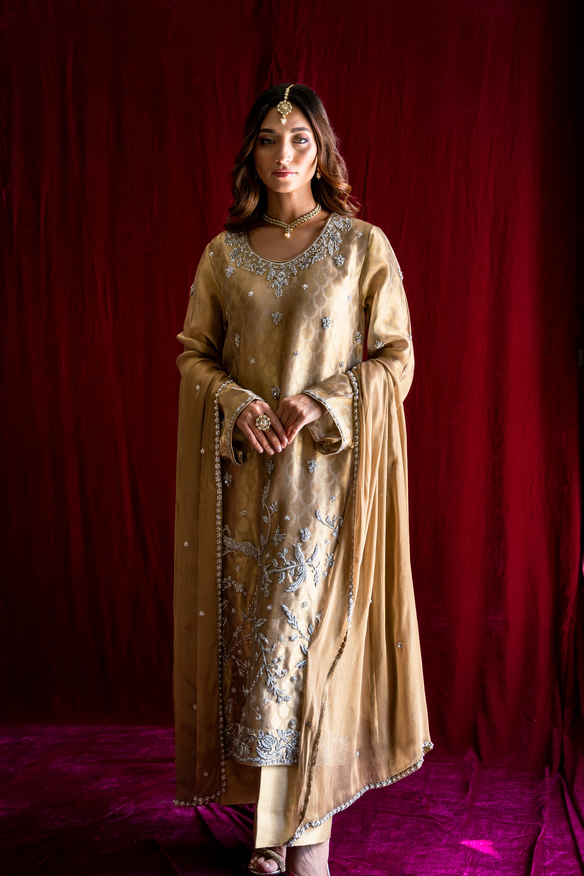 Reigning in Gold” is a timeless ensemble that exudes classic elegance. Cut from structured pure tissue, this exquisite piece showcases masterful techniques and a harmonious blend of kasab, ari, zardozi, and jewel embellishments. The outfit includes gold shimmer pants and a stunning gold Maisori chiffon dupatta, beautifully adorned with dispersed motifs, finished with intricate borders, making it a true masterpiece.