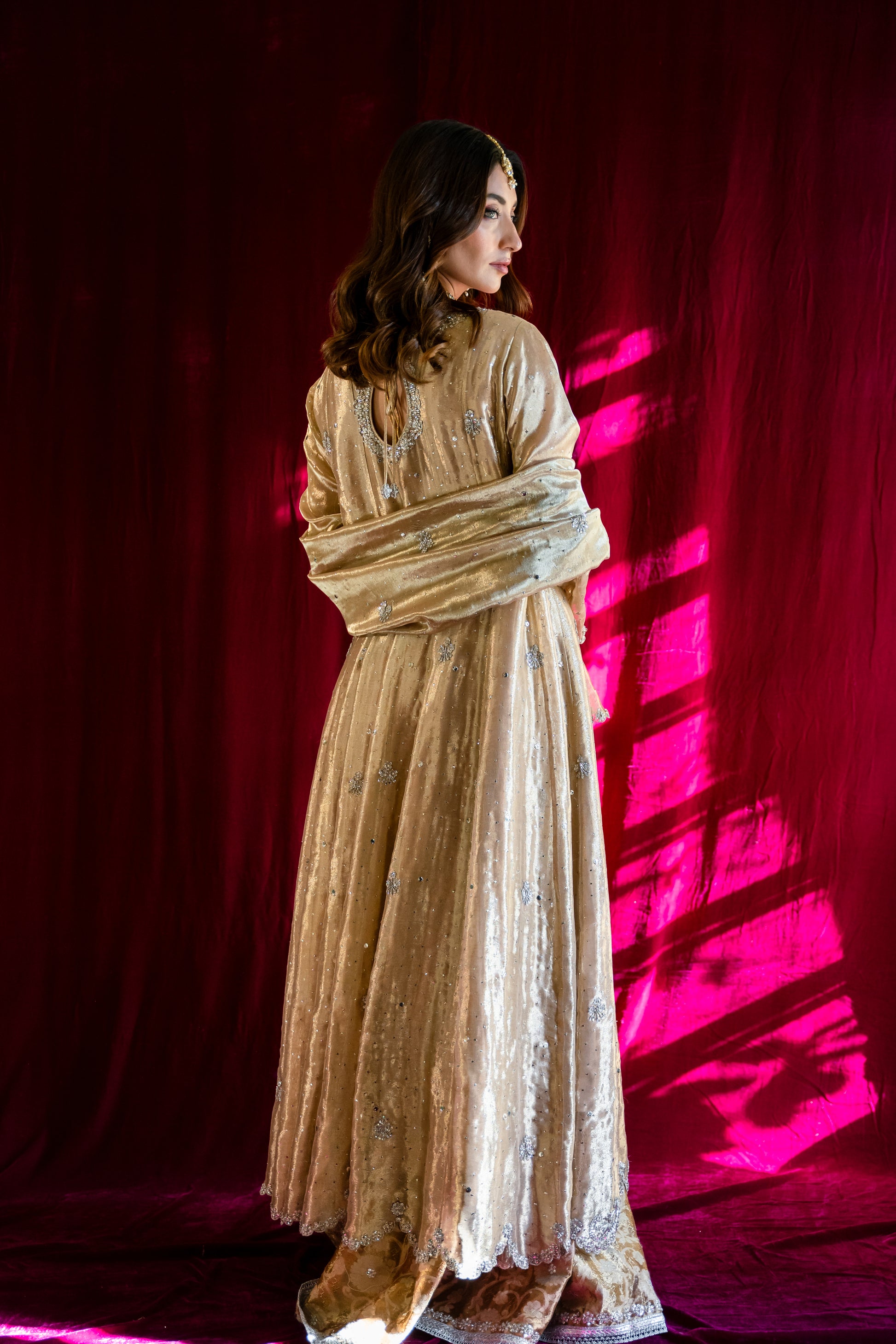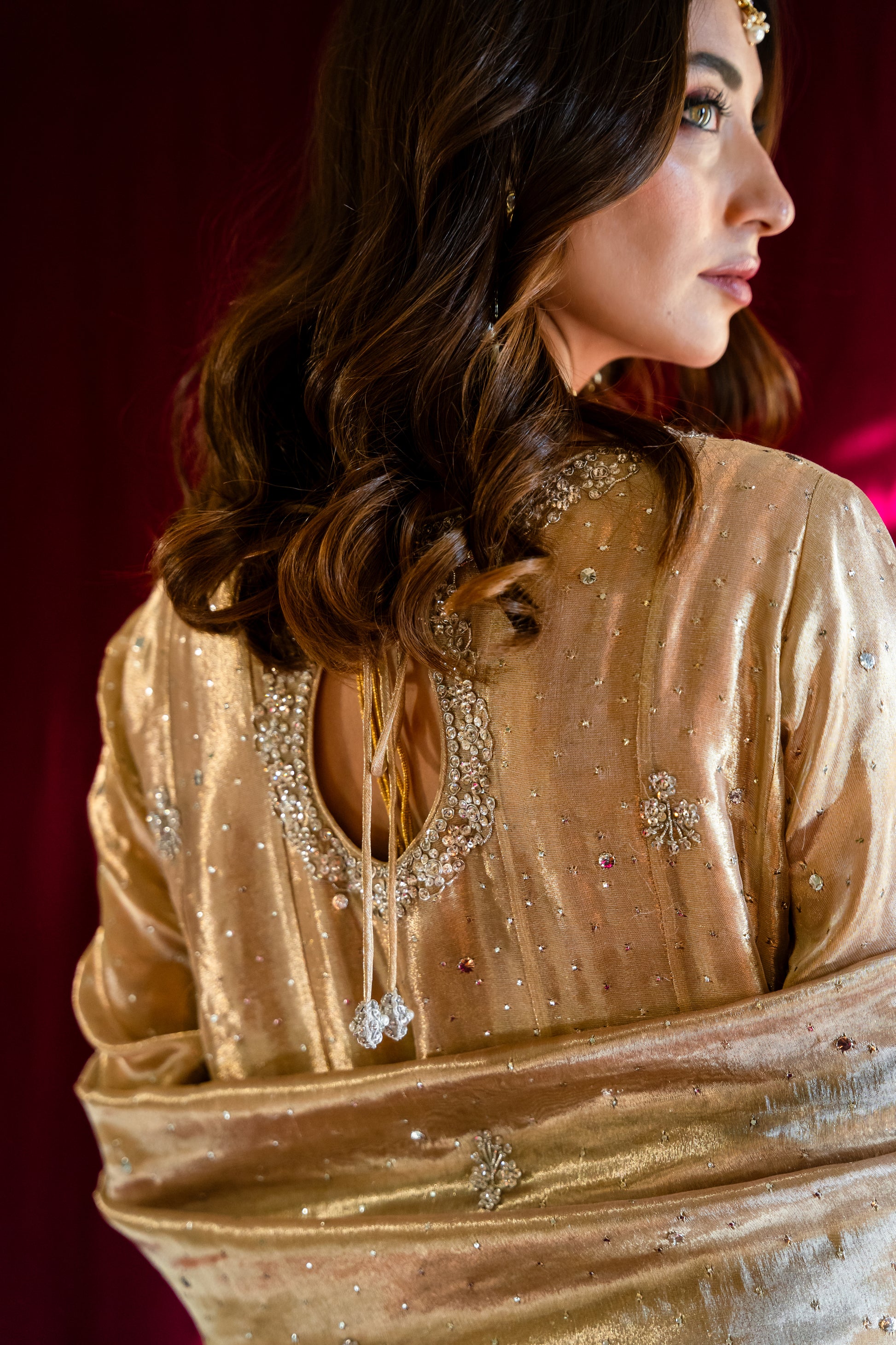 This resplendent gold tissue Kalidar is a masterpiece of unparalleled craftsmanship, showcasing intricate silver embroidery that features exquisite kasab, zardozi, and jewelled elements. This majestic ensemble is elevated by the masterful blend of traditional techniques, culminating in a truly regal presence. Paired with an embellished woven banarsi silk Dhaka pyjama that adds a touch of modern sophistication and a flowing tissue dupatta adorned with delicate scallop border with dispersed zardozi motifs & silver kamdani, 'Royal Revival' embodies a harmonious balance of opulence and refinement, making it a show-stopping testament to haute couture excellence.