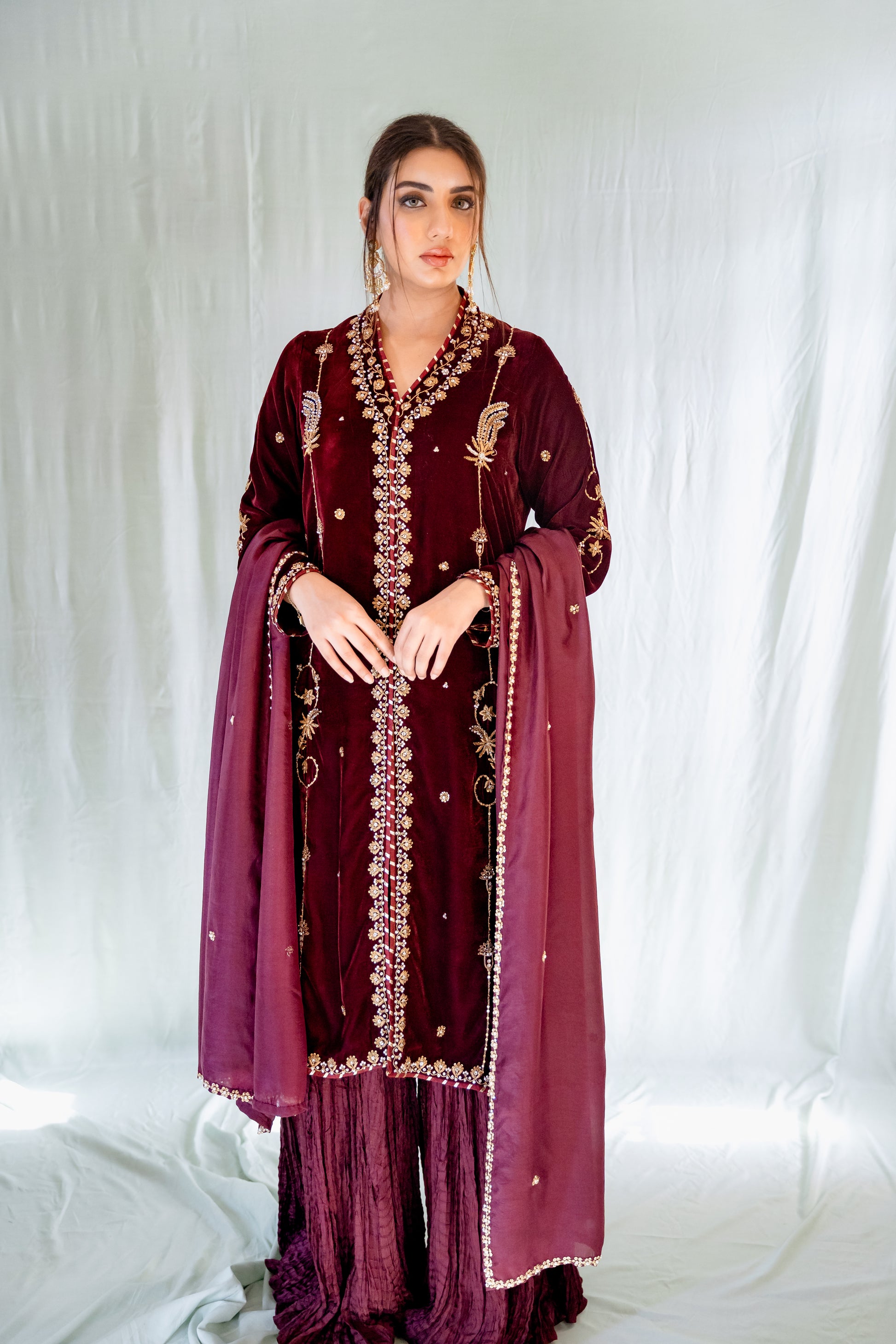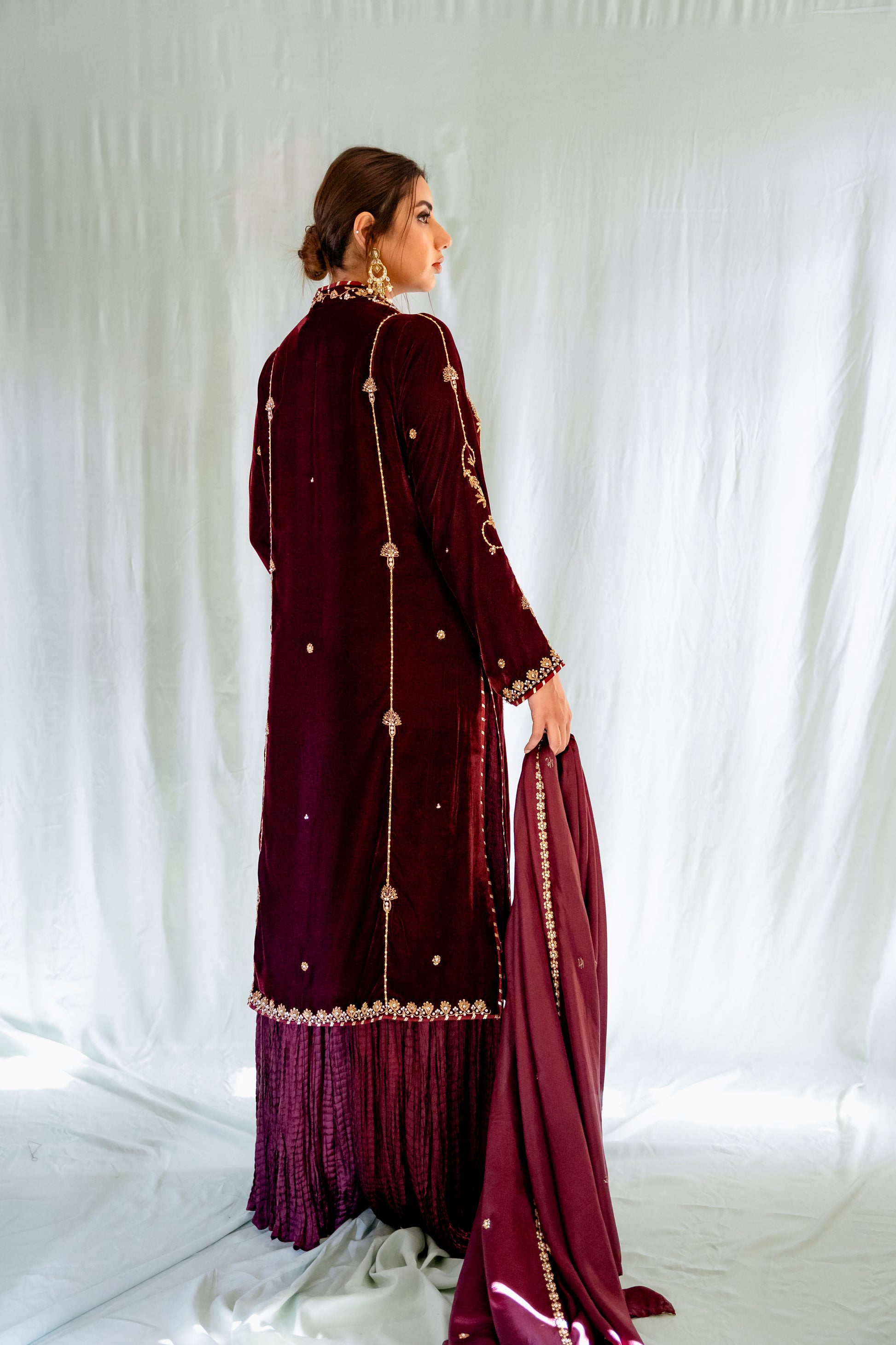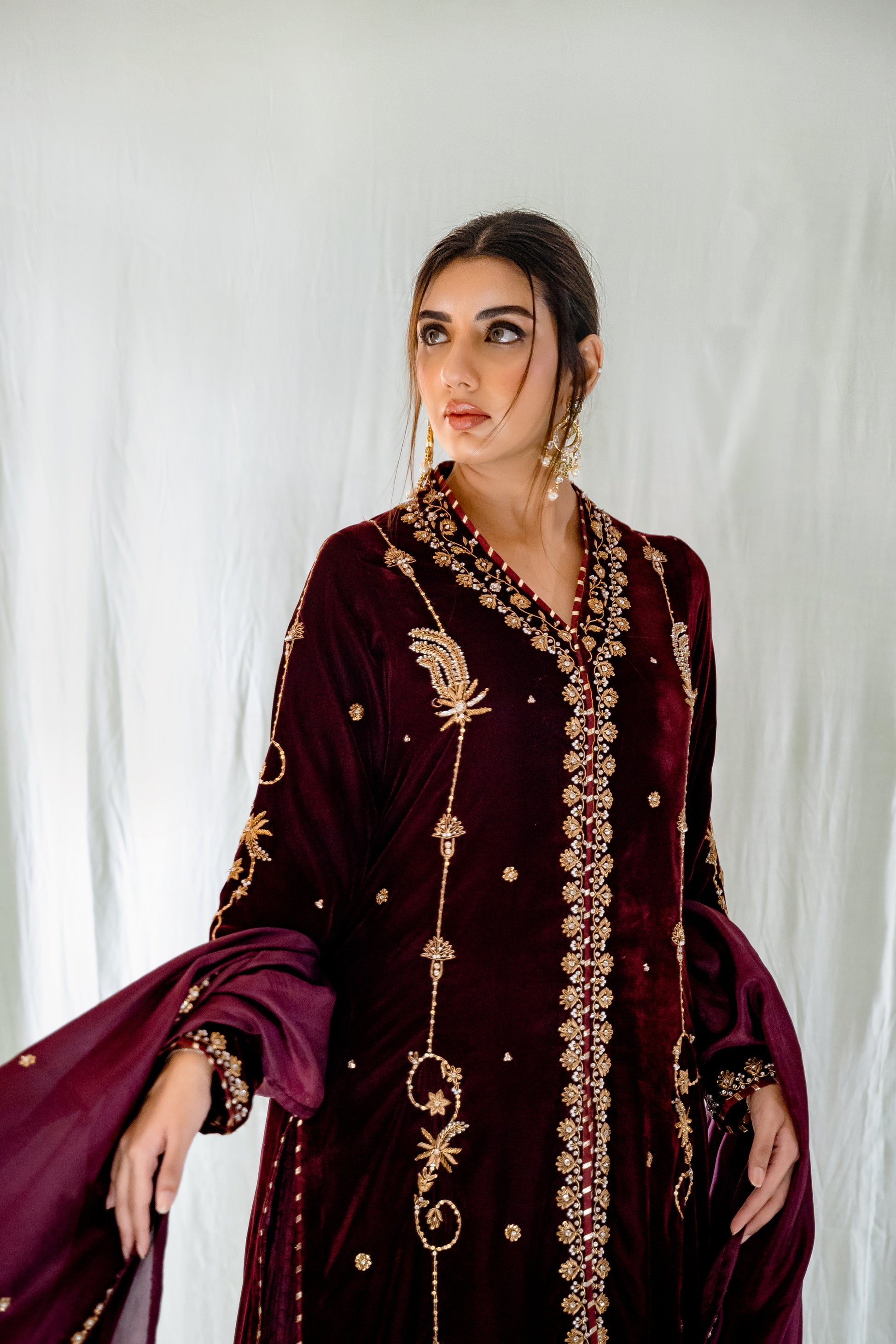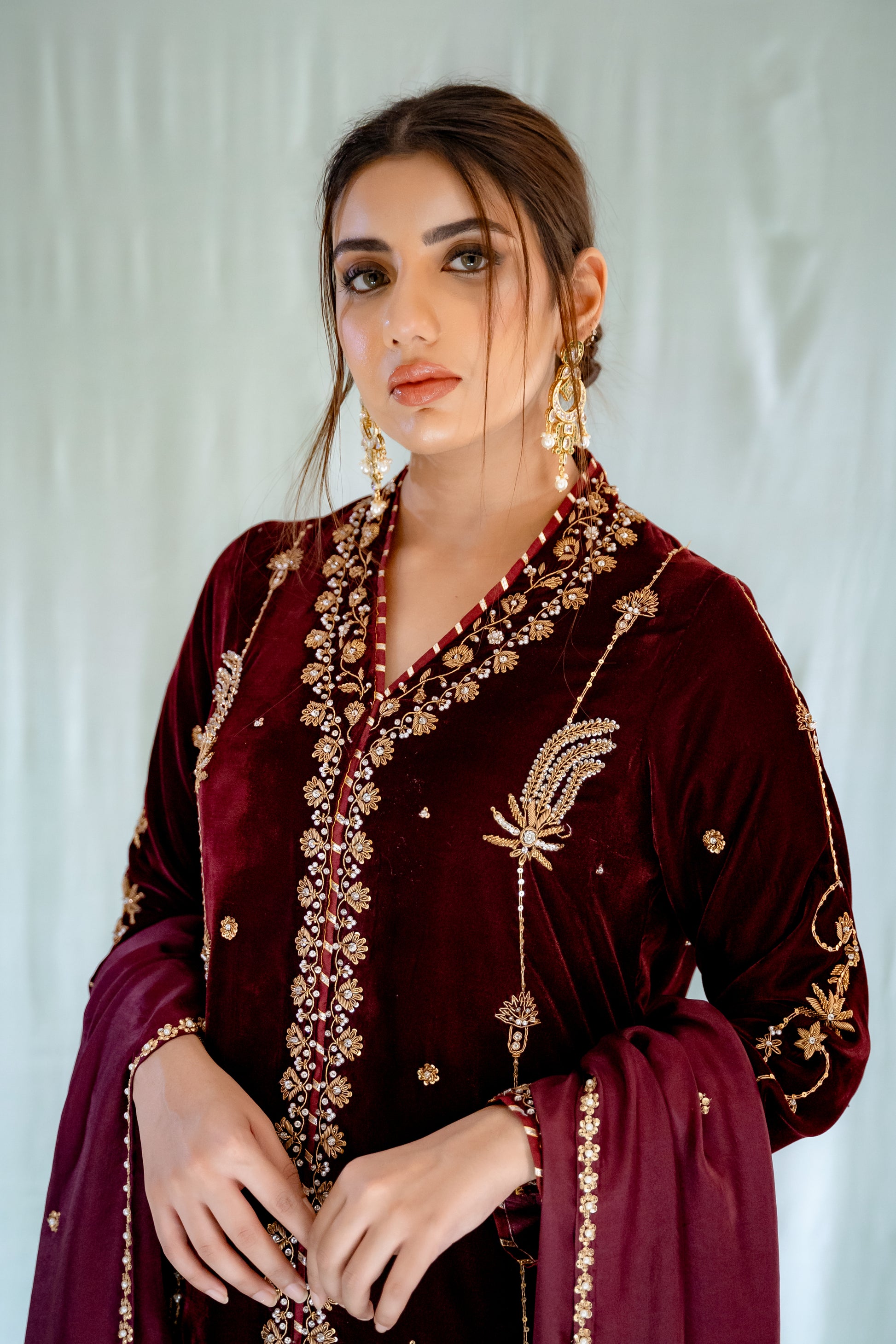 Fabric: Velvet Kameez, Pure Silk Dupatta & Blended Silk Crushed Dhaka Pyjamas.
