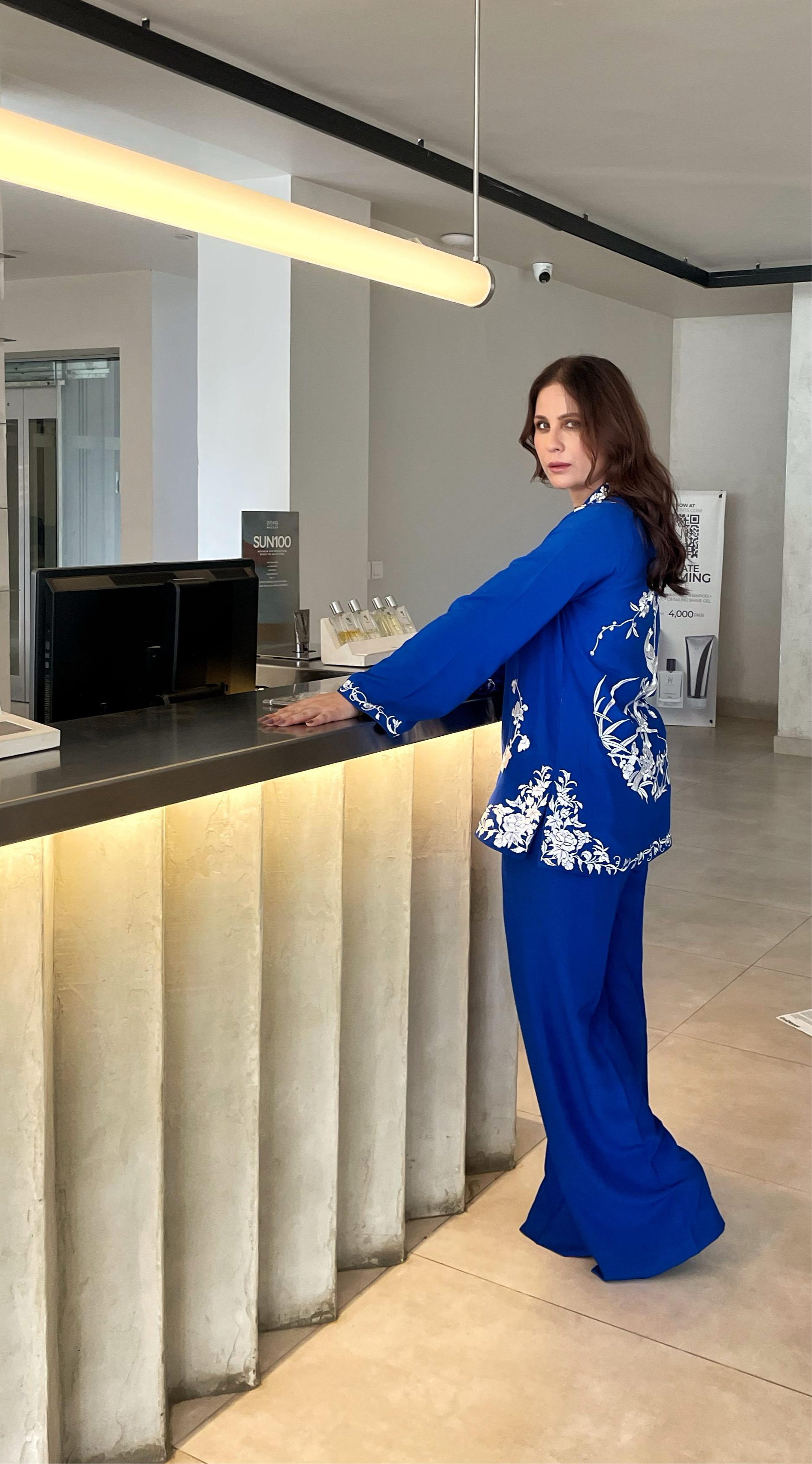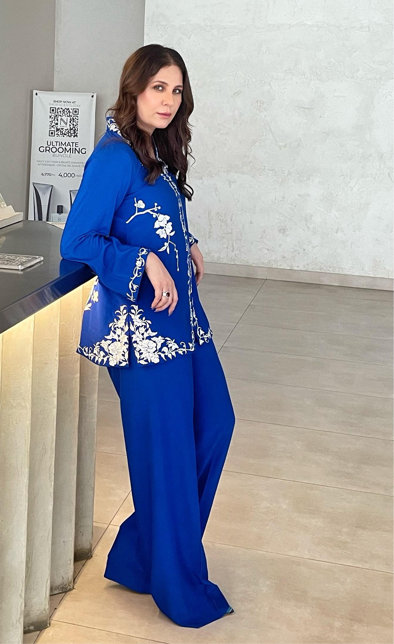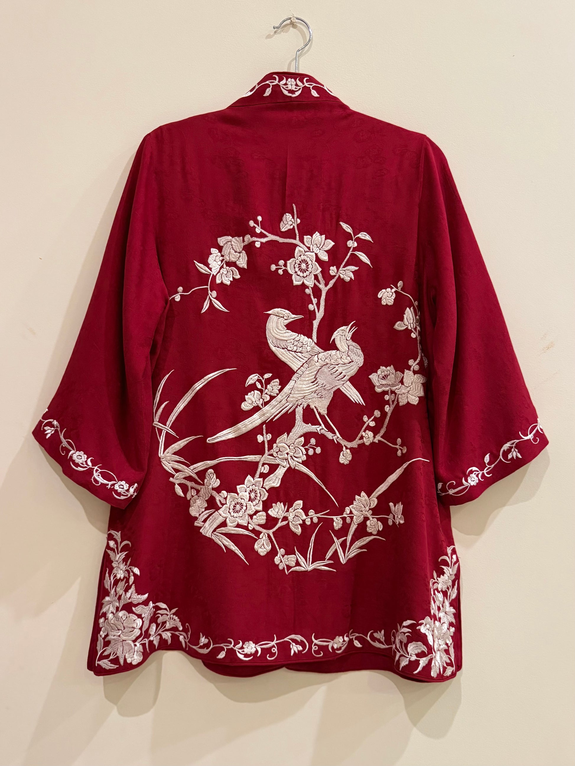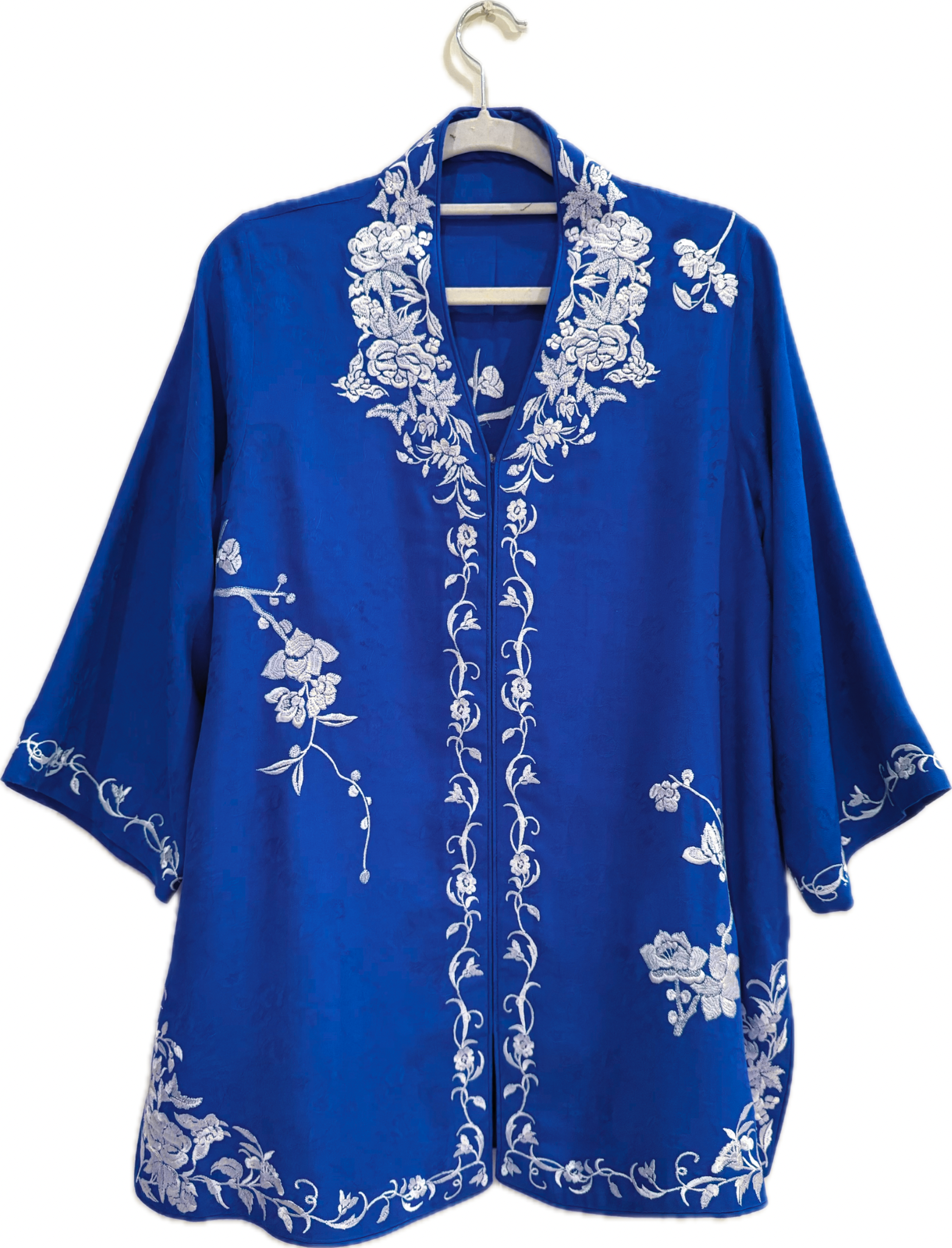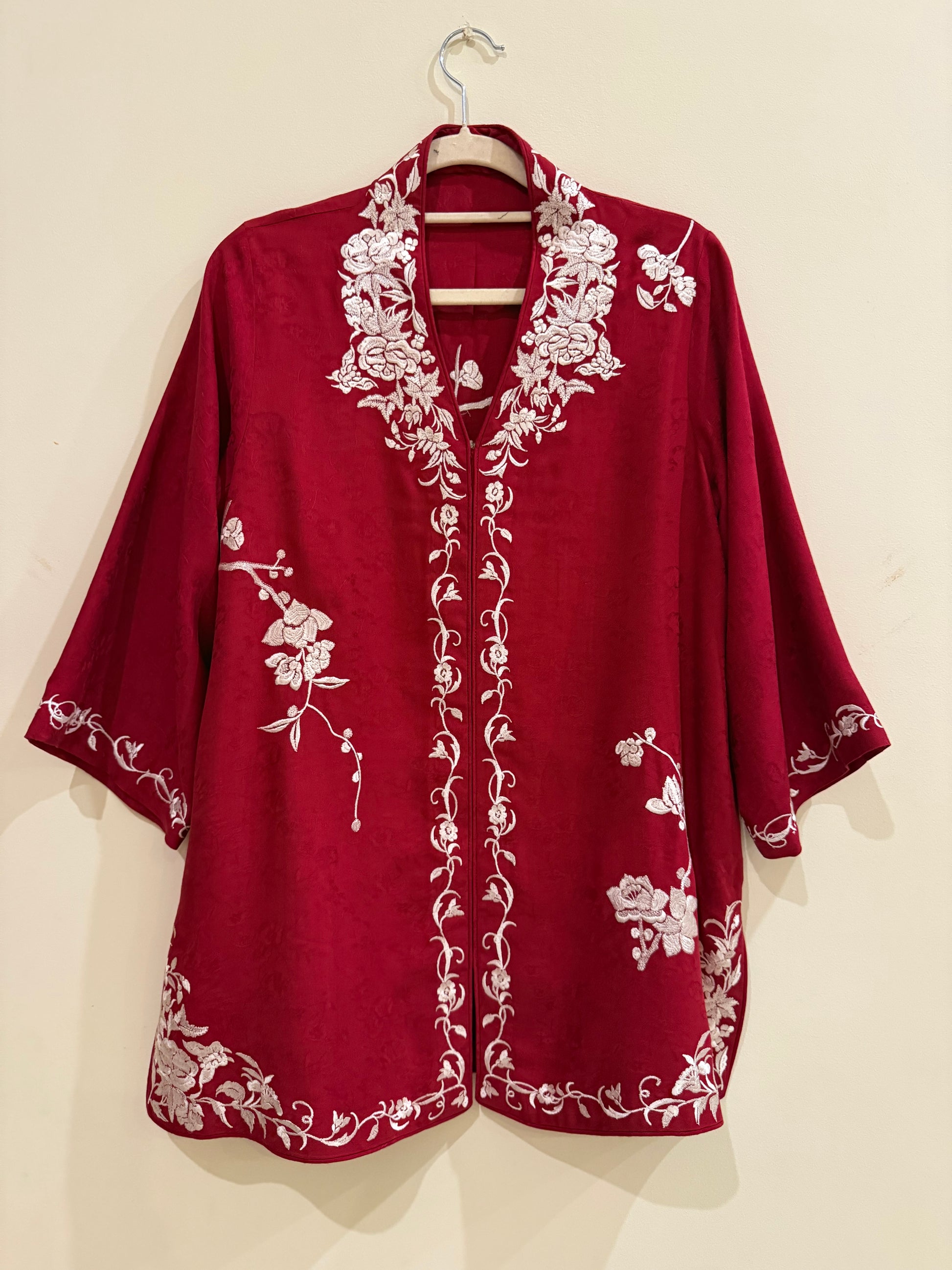 Embody the essence of sophistication with “Shanghai Chic”, where vintage charm meets modern flair. This stunning ensemble features a front-open short top crafted from luxurious blended silk, showcasing intricate vintage Chinese embroidery rendered in ivory silk thread. Paired with effortless loose-fit matching pants, this outfit blends timeless elegance with contemporary chic.