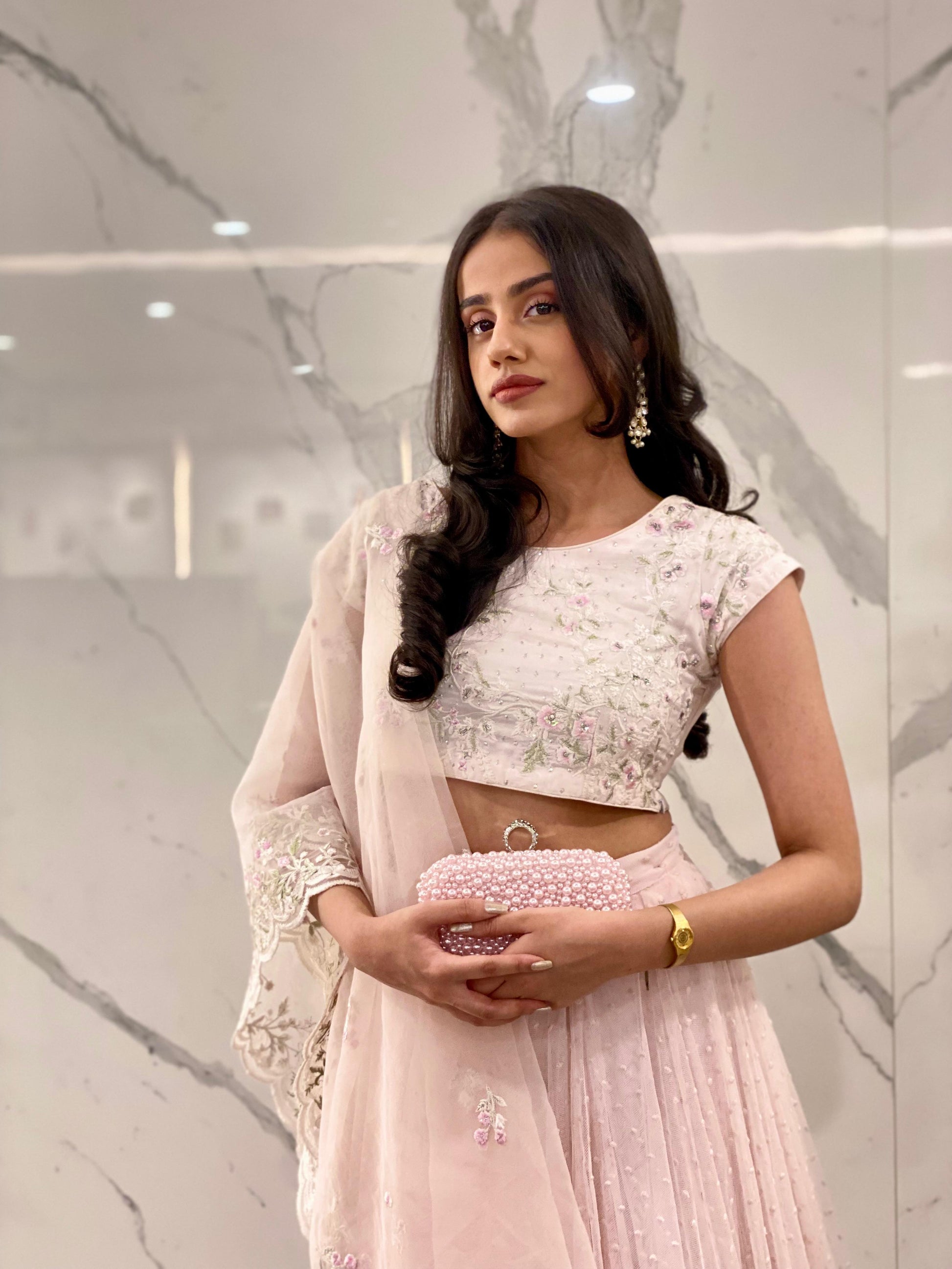 Sway to the rhythm of the new season in our ‘Vintage Rose’ Lehenga Choli set. Crafted from silk, the blouse is delicately embroidered in hues of pink, mint and ivory resham & is further embellished with zardozi embroidery featuring sequins, pearls & silver dabka. It is paired with a Voluminous swirly structured net Lehenga & organza dupatta with embroidered border & motifs in pastel resham.
