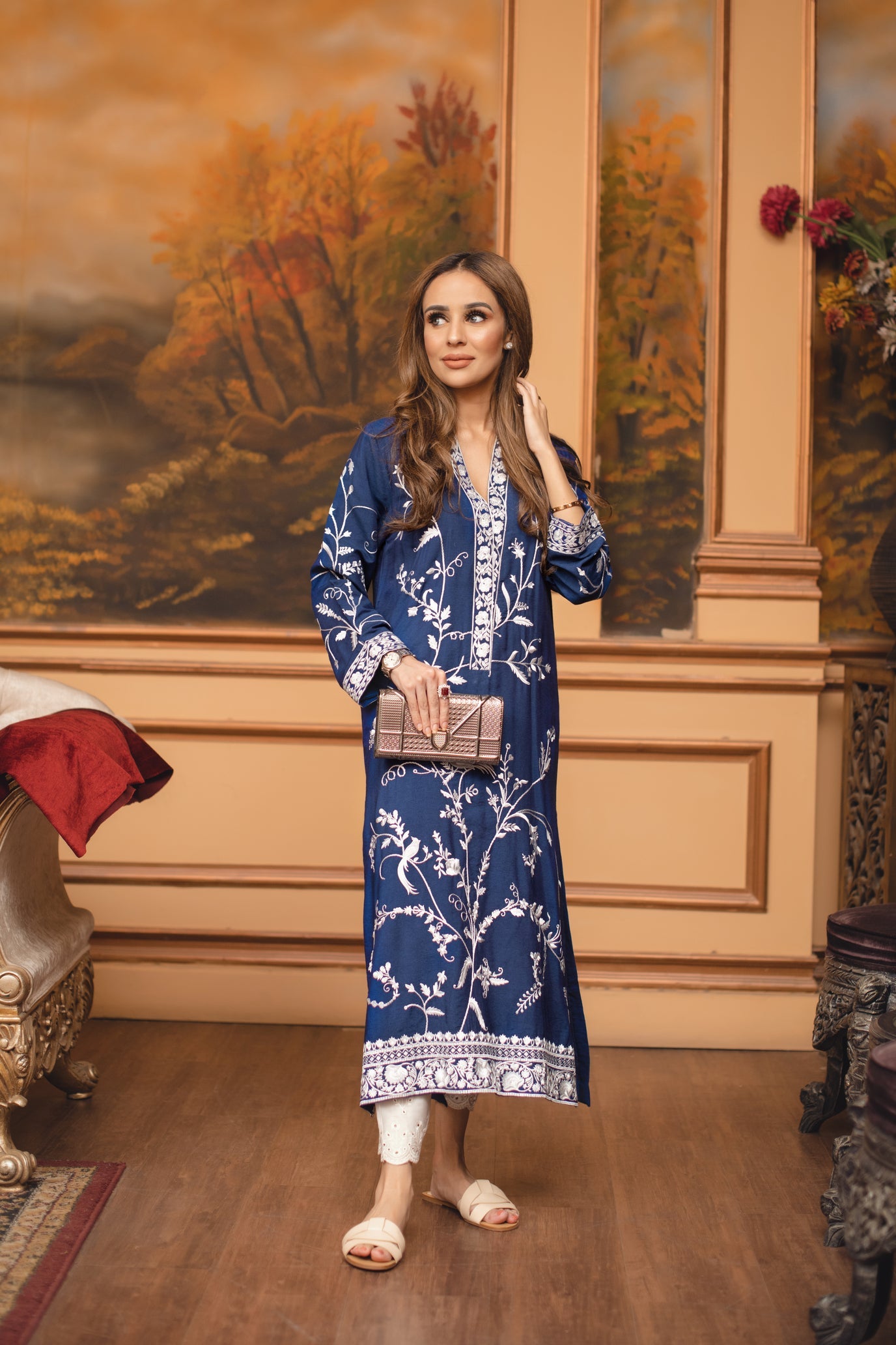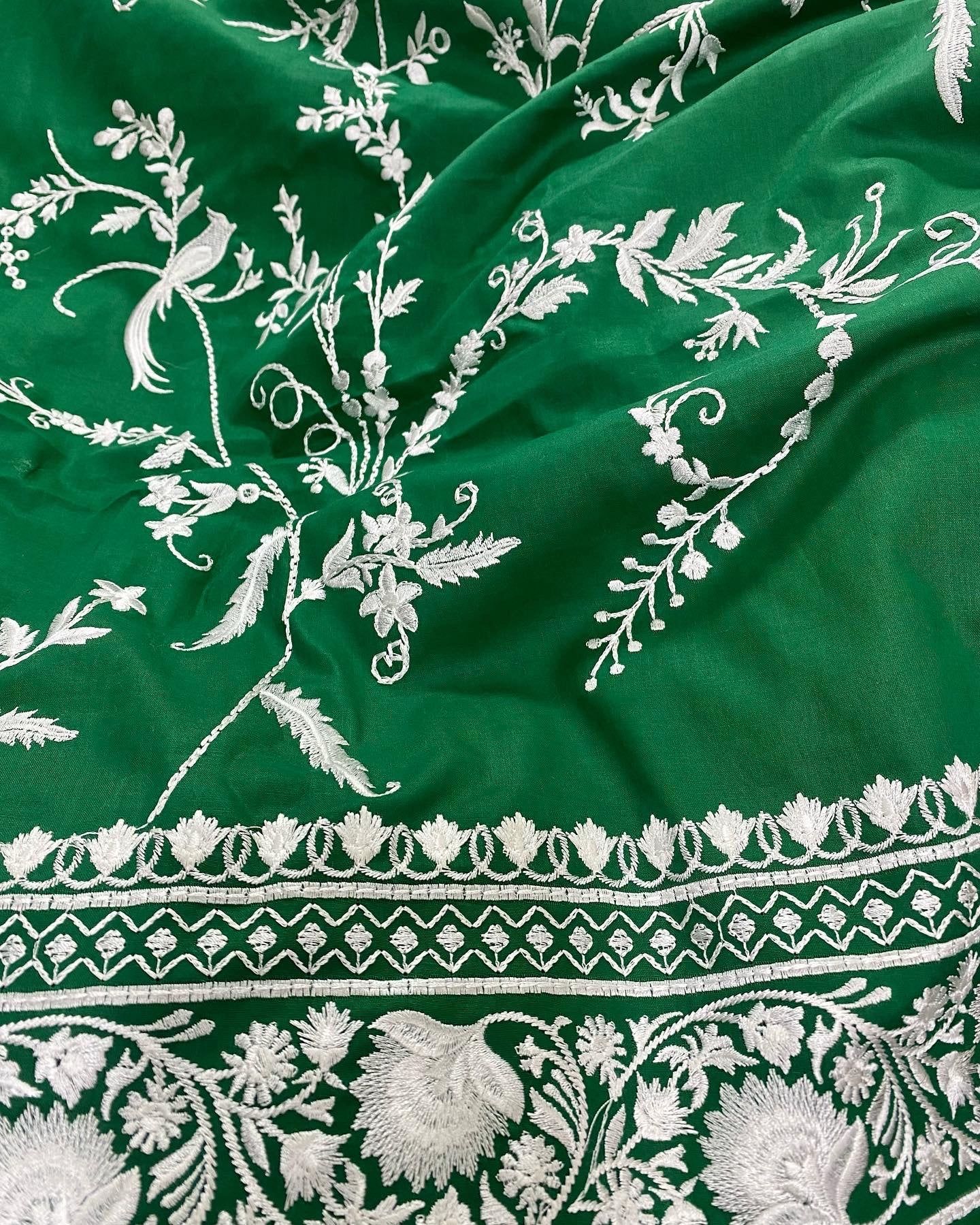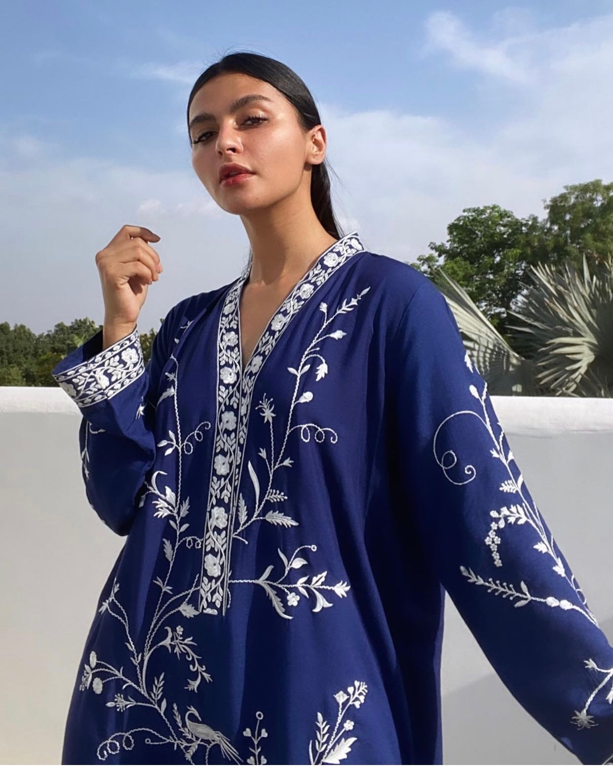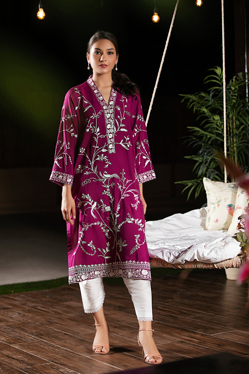 Brighten up your wardrobe with our bestselling Zahra Kurti. Featuring fine embroidery in ivory silk thread on an elaborate jaal with flowers, spirals and birds. It is the perfect addition to your wardrobe and a piece you will cherish for years to come.