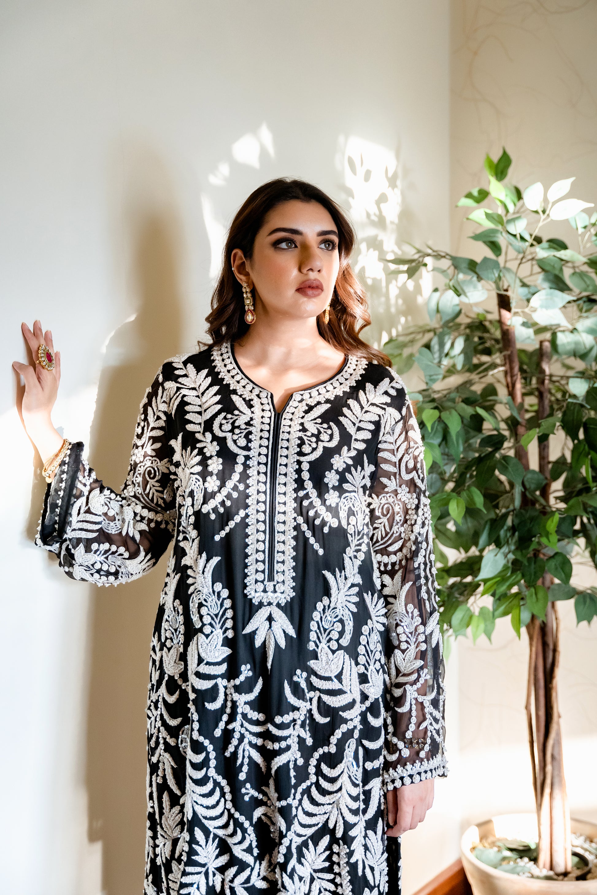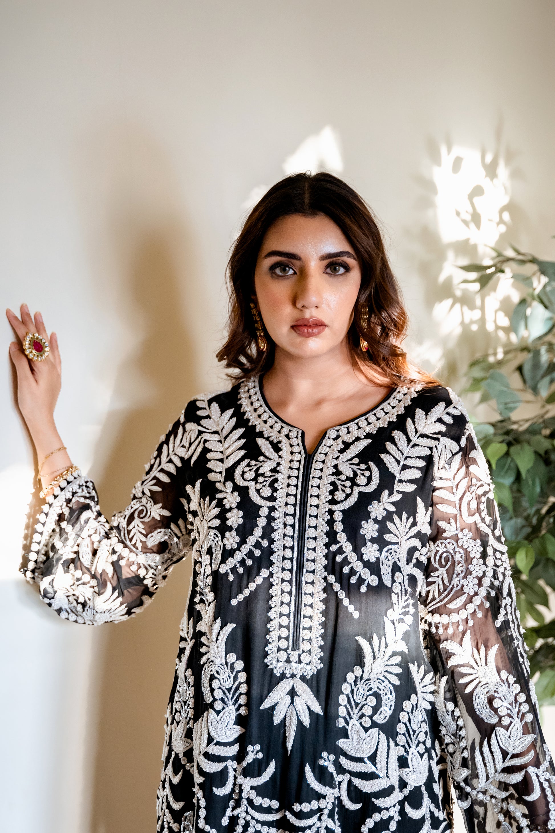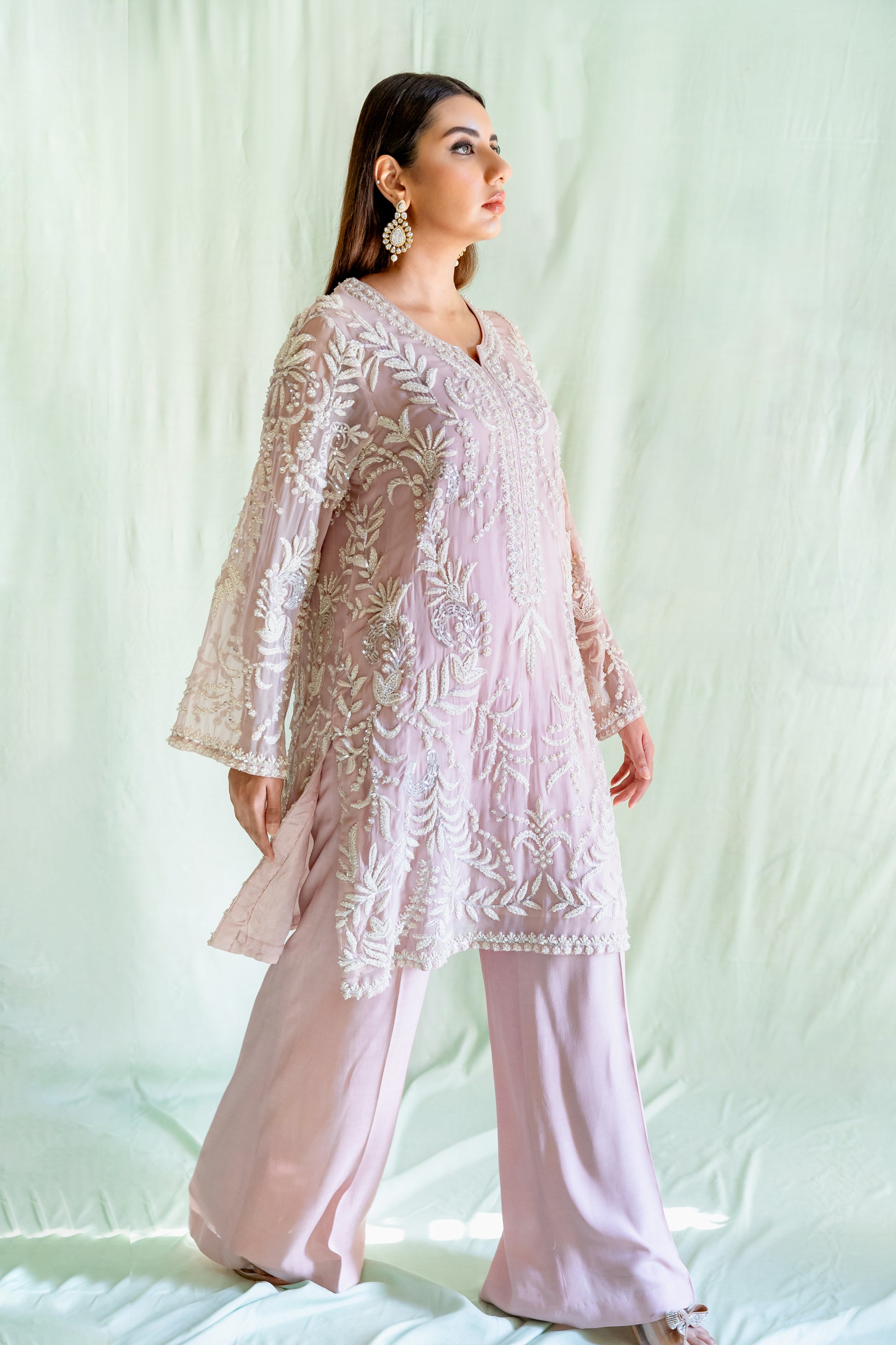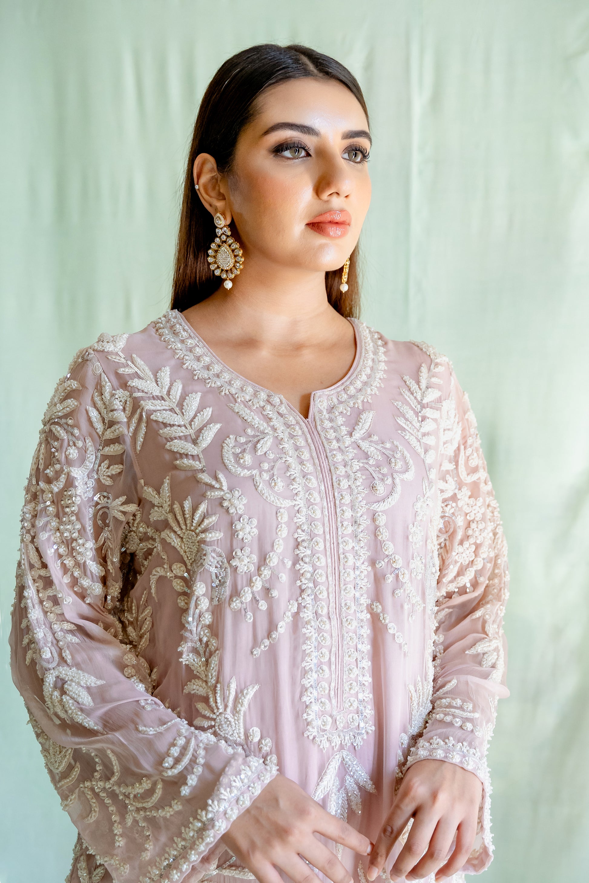 Embody the essence of calm sophistication with Zensation, a modern-themed outfit that exudes serenity and glamour. Crafted in luxurious chiffon, the short top's front features a stunning gala pati, beautifully complemented by intricate thread and beaded embroidery that extends to the sleeves, creating a mesmerizing dance of patterns and textures that sparkle against the skin, The flared pants' flowing silhouette adds a touch of whimsy and glamour.