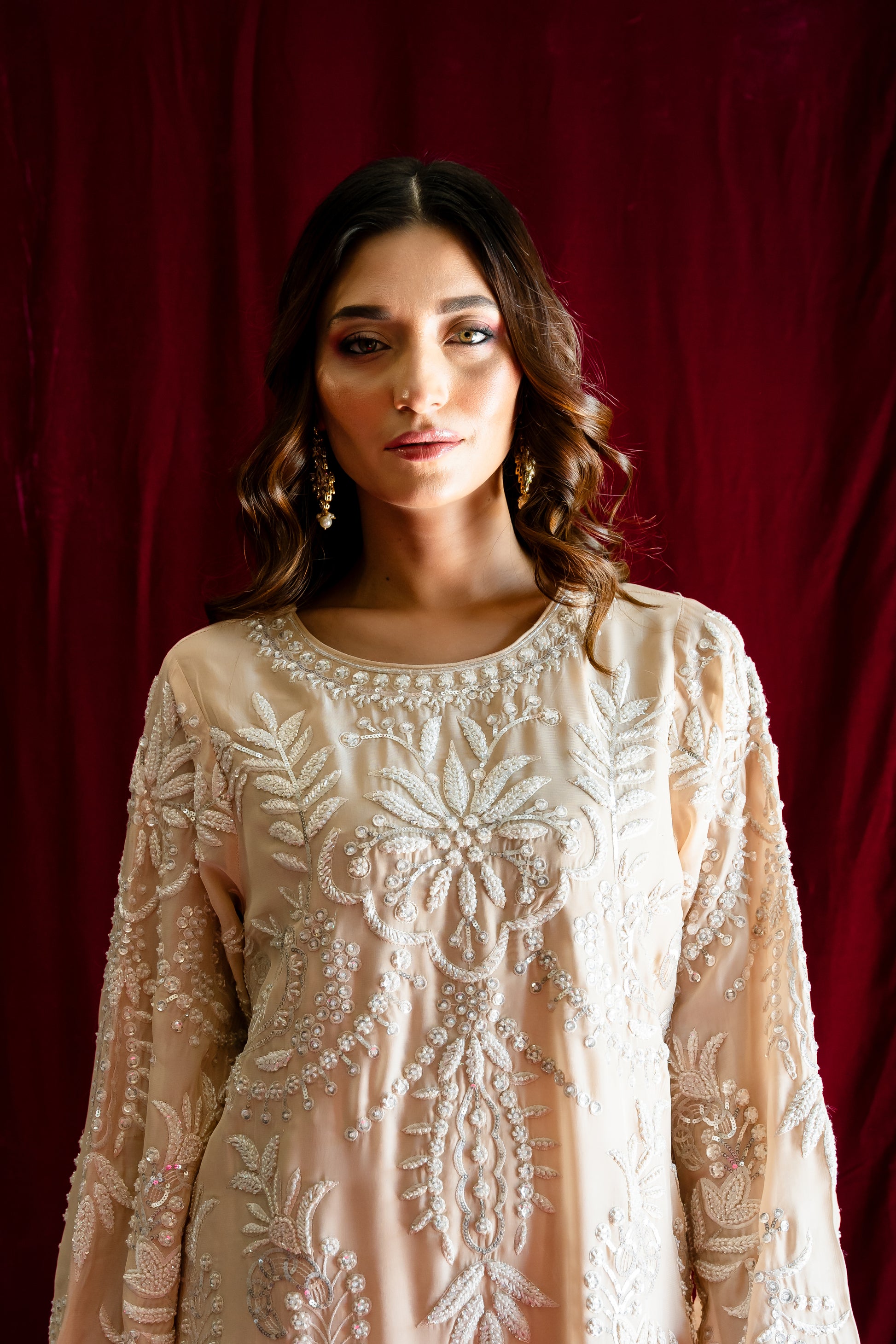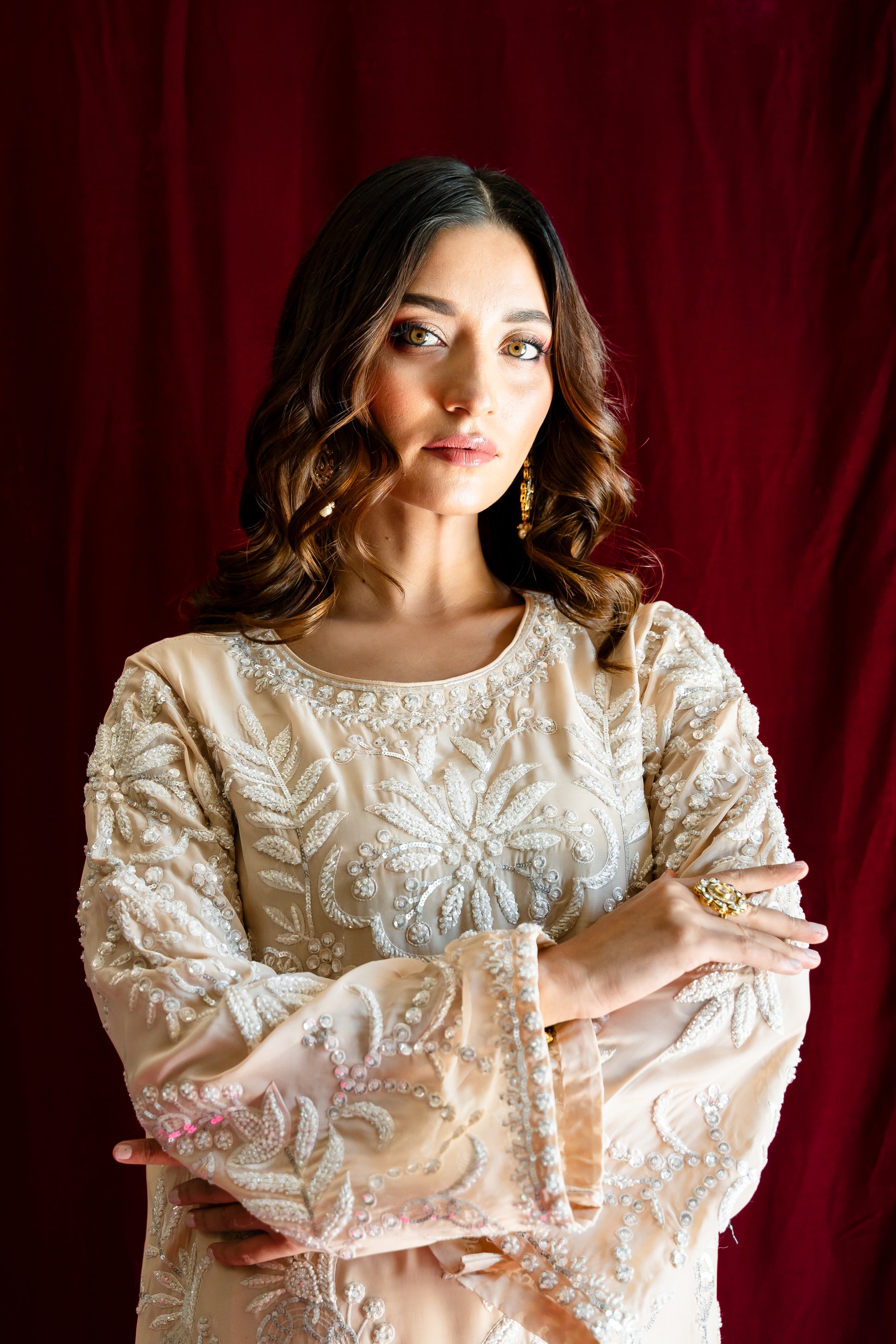 Embody the essence of calm sophistication with Zensation, a modern-themed outfit that embodies serenity and glamour. Crafted from luxurious silk chiffon, the short top's front and sleeves showcase intricate thread and bead work, creating a mesmerizing dance of patterns and textures that sparkle against the skin. The flared pants' flowing silhouette adds a touch of whimsy and glamour, perfect for making a statement. Zensation is a true showstopper, exuding understated elegance and sophistication.